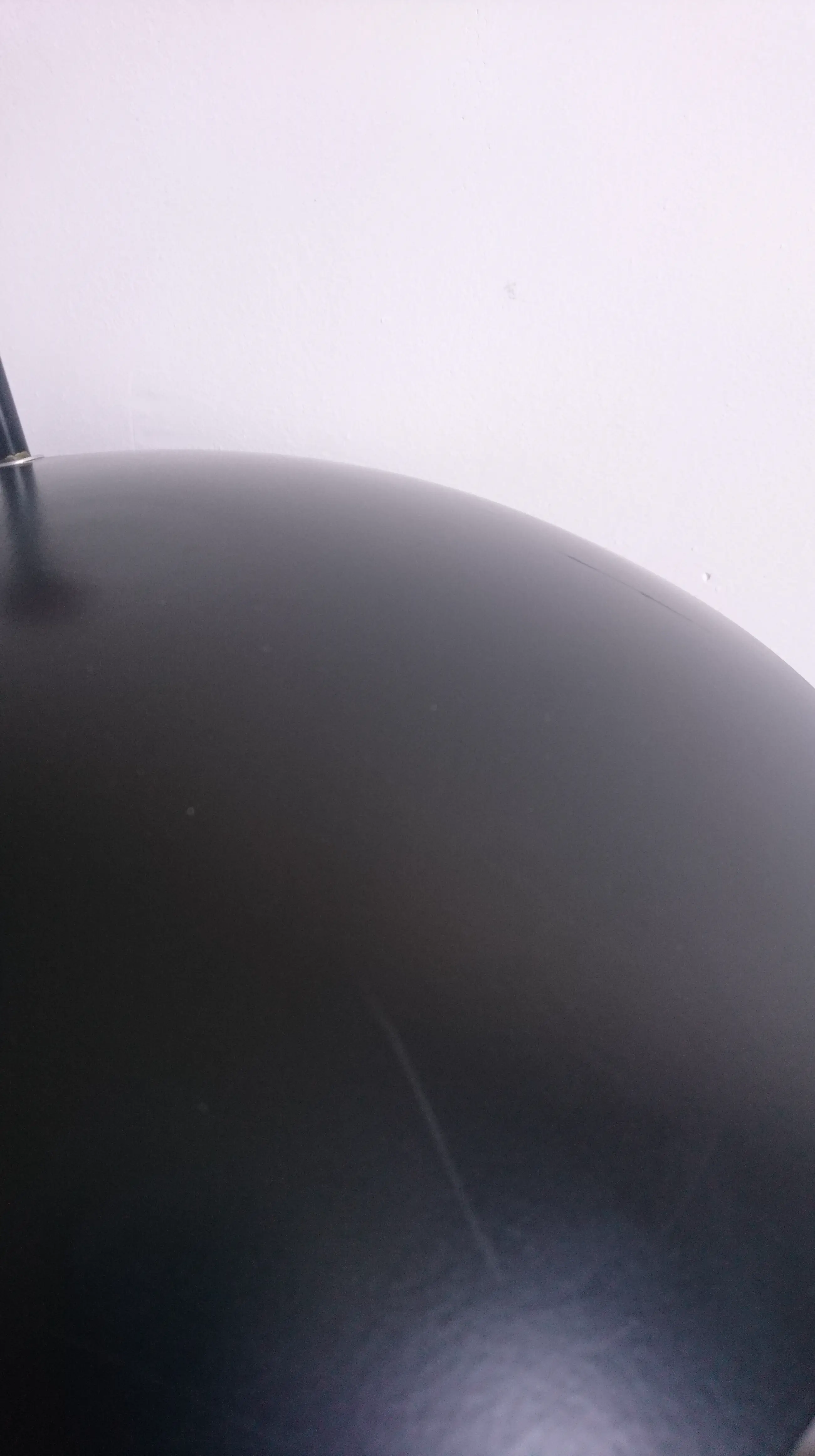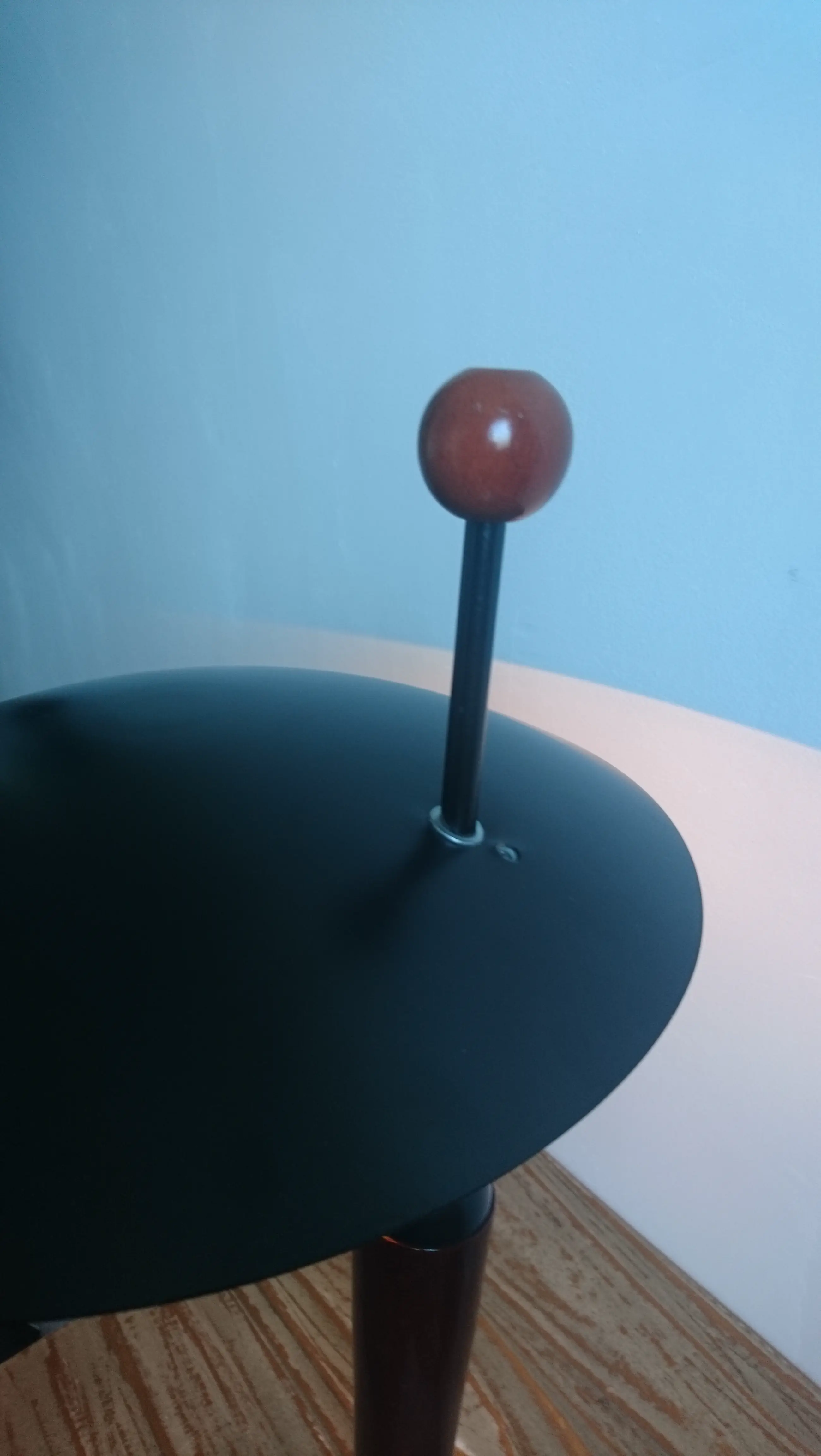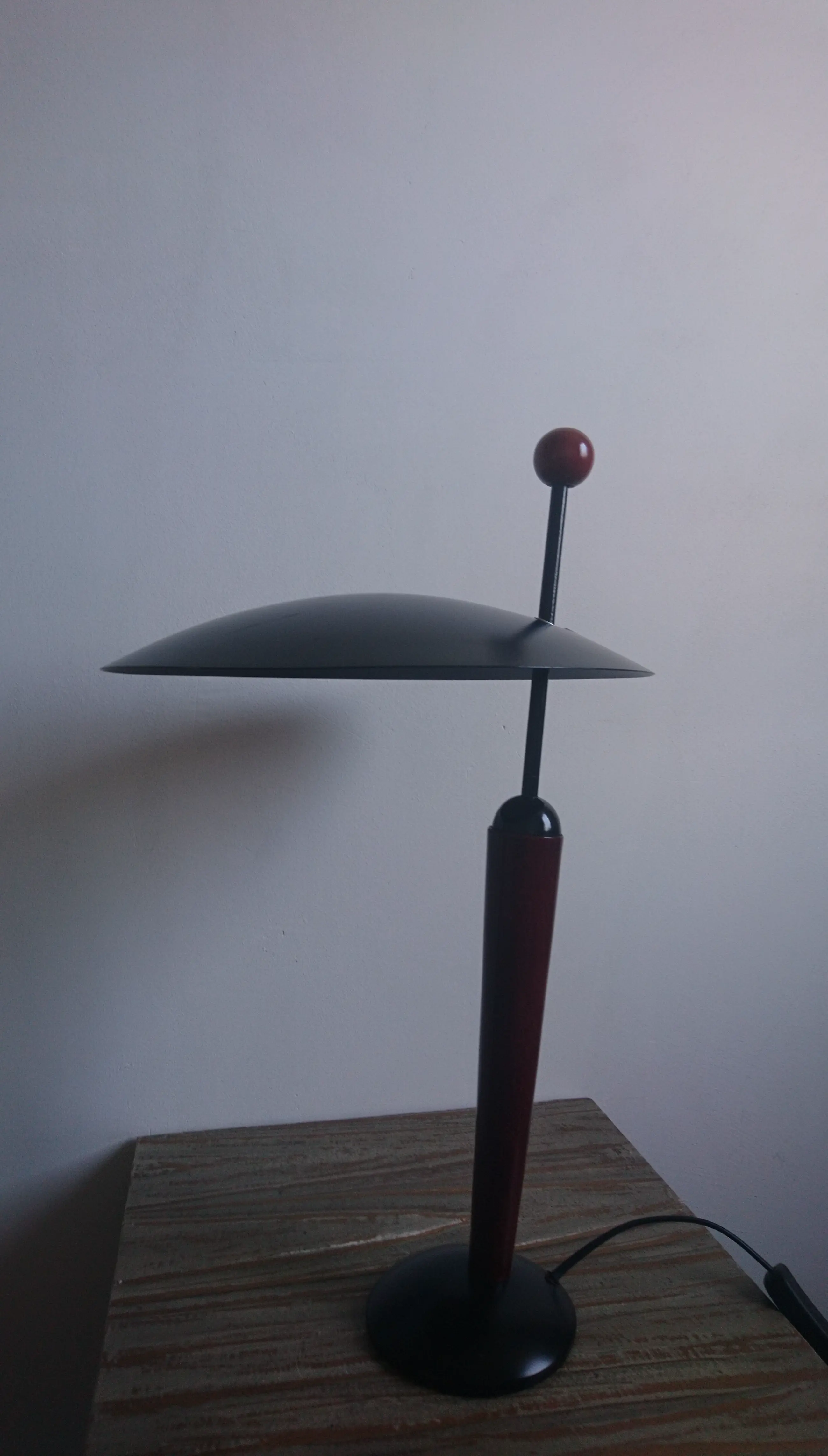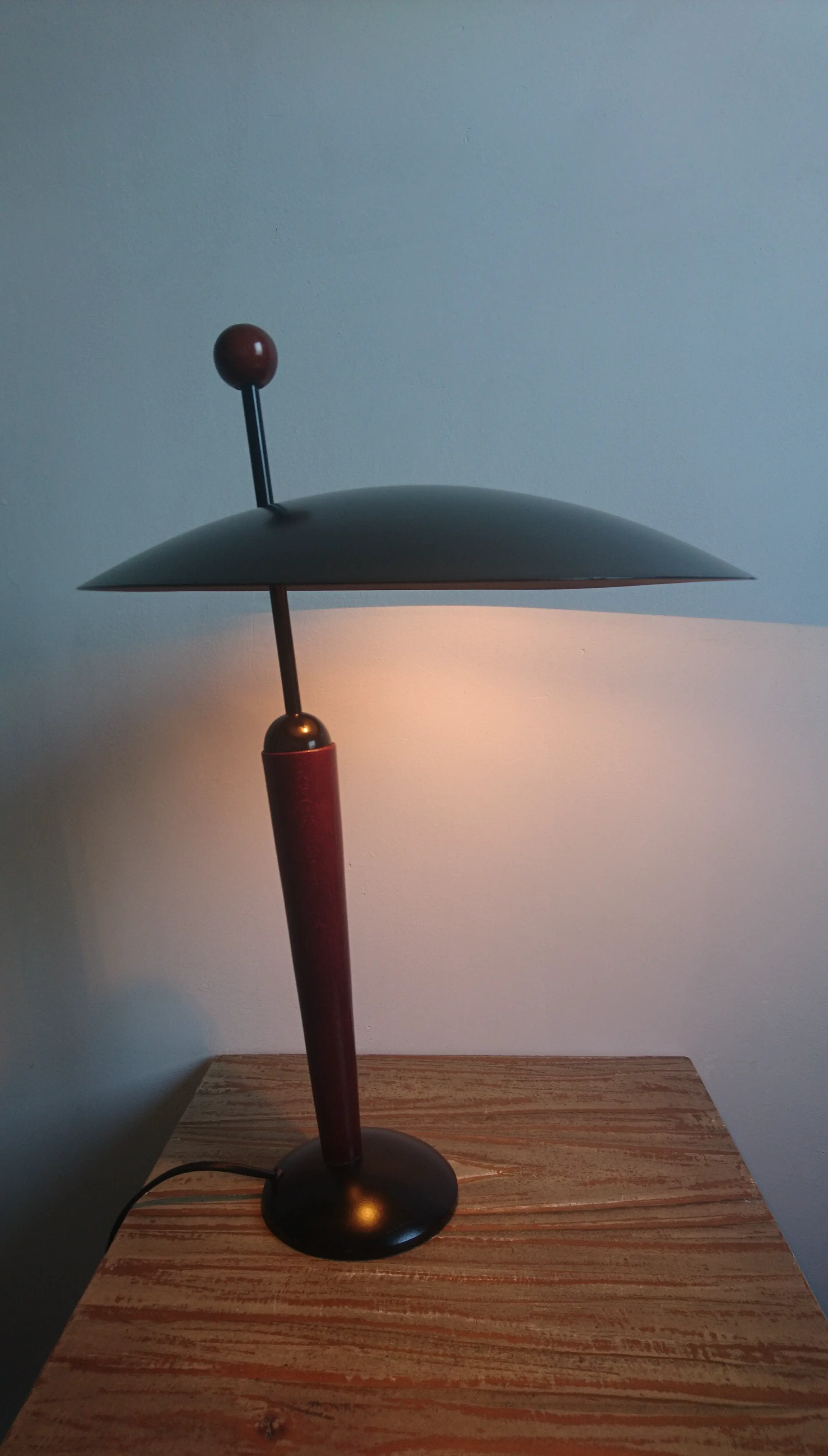 Postmodernistische tafellamp uit de jaren ´80 van goede kwaliteit. Gezien de leeftijd in goede staat. Boven op de kap twee grijze touché strepen en op het houten gedeelte een klein deukje. Verder in de buurt van het lampje de gebruikelijke (minimale) hitteplek. Zie daarvoor de foto's. Het snoer is vanaf de voet tot stekker vervangen (lees: veiliger). Afmetingen: 50 x 32 x 32 cm.