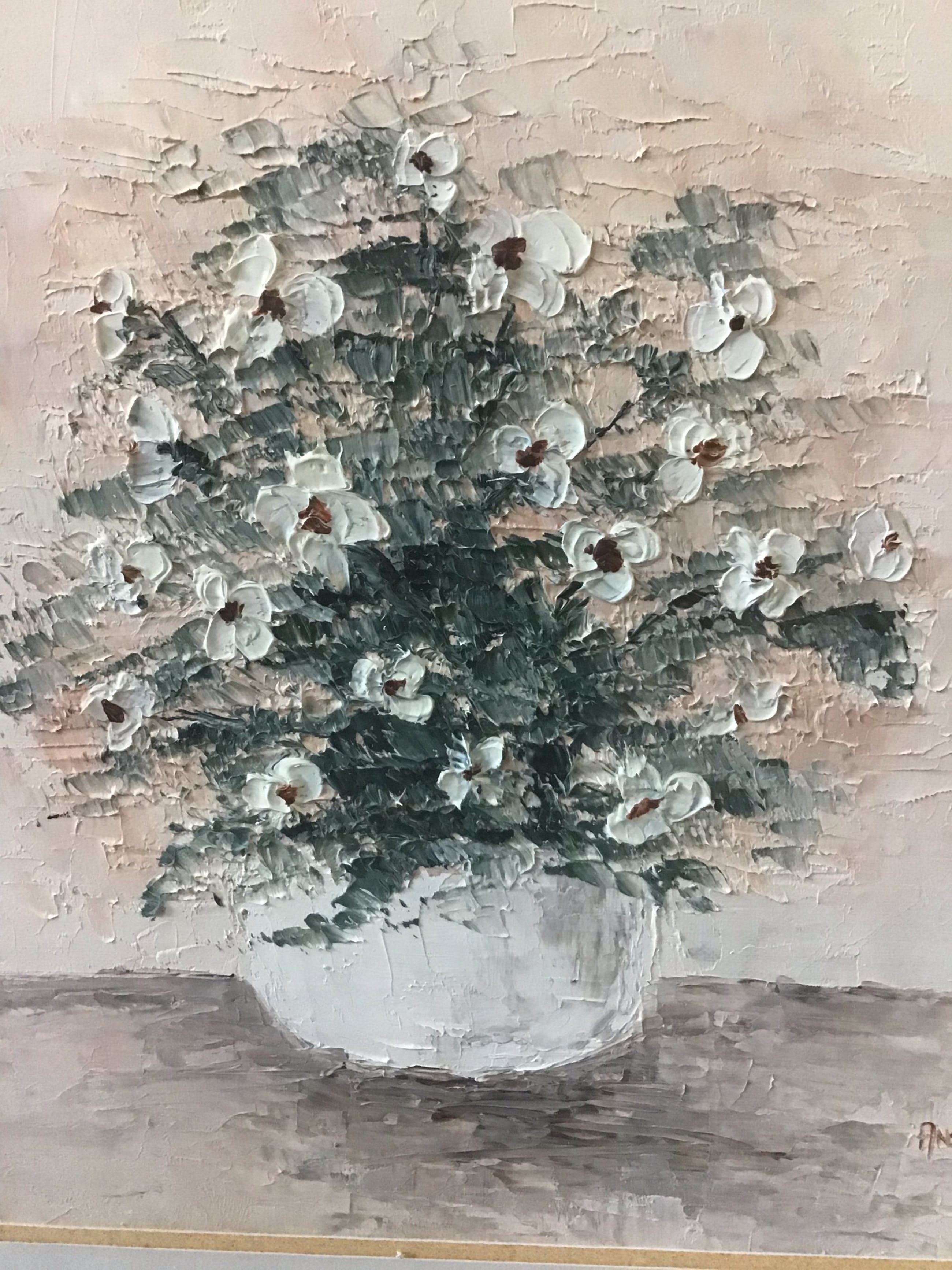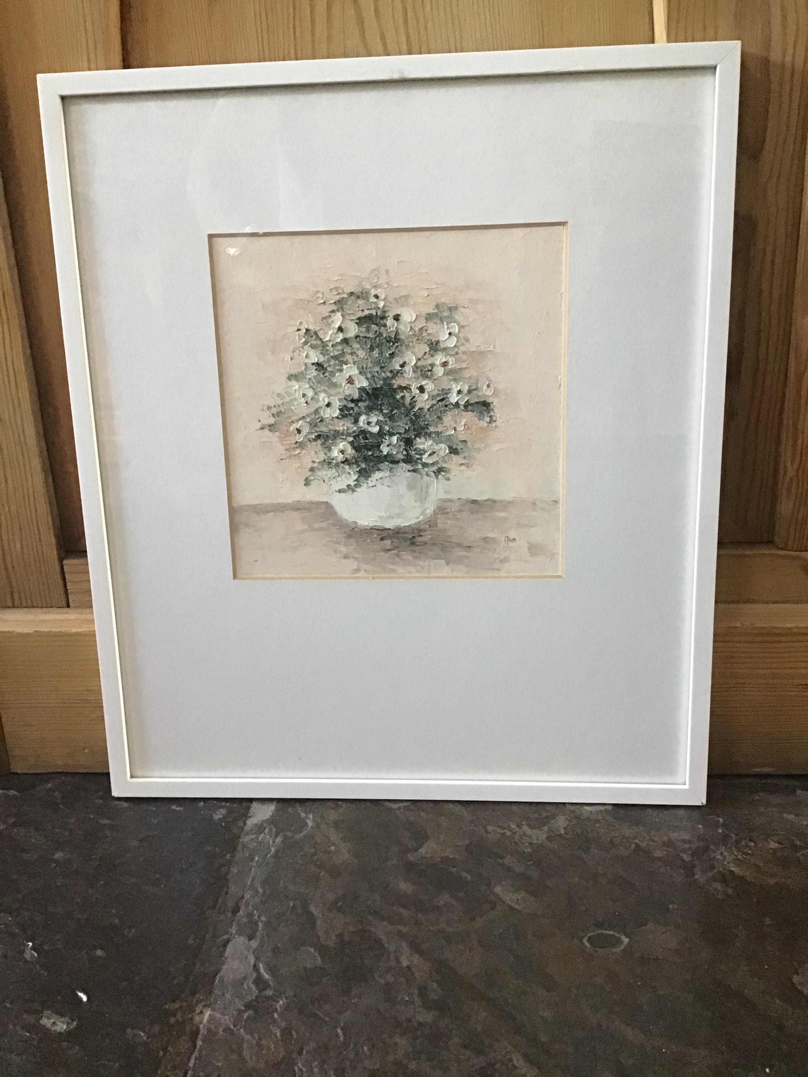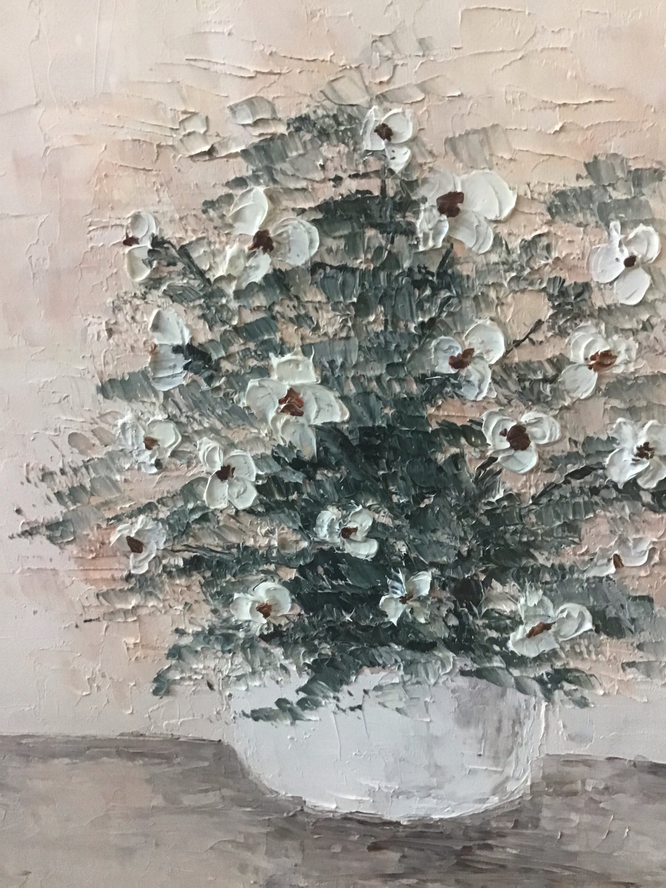 In zachte pastelstiften geschilderd bouqet bloemen in witte pot.