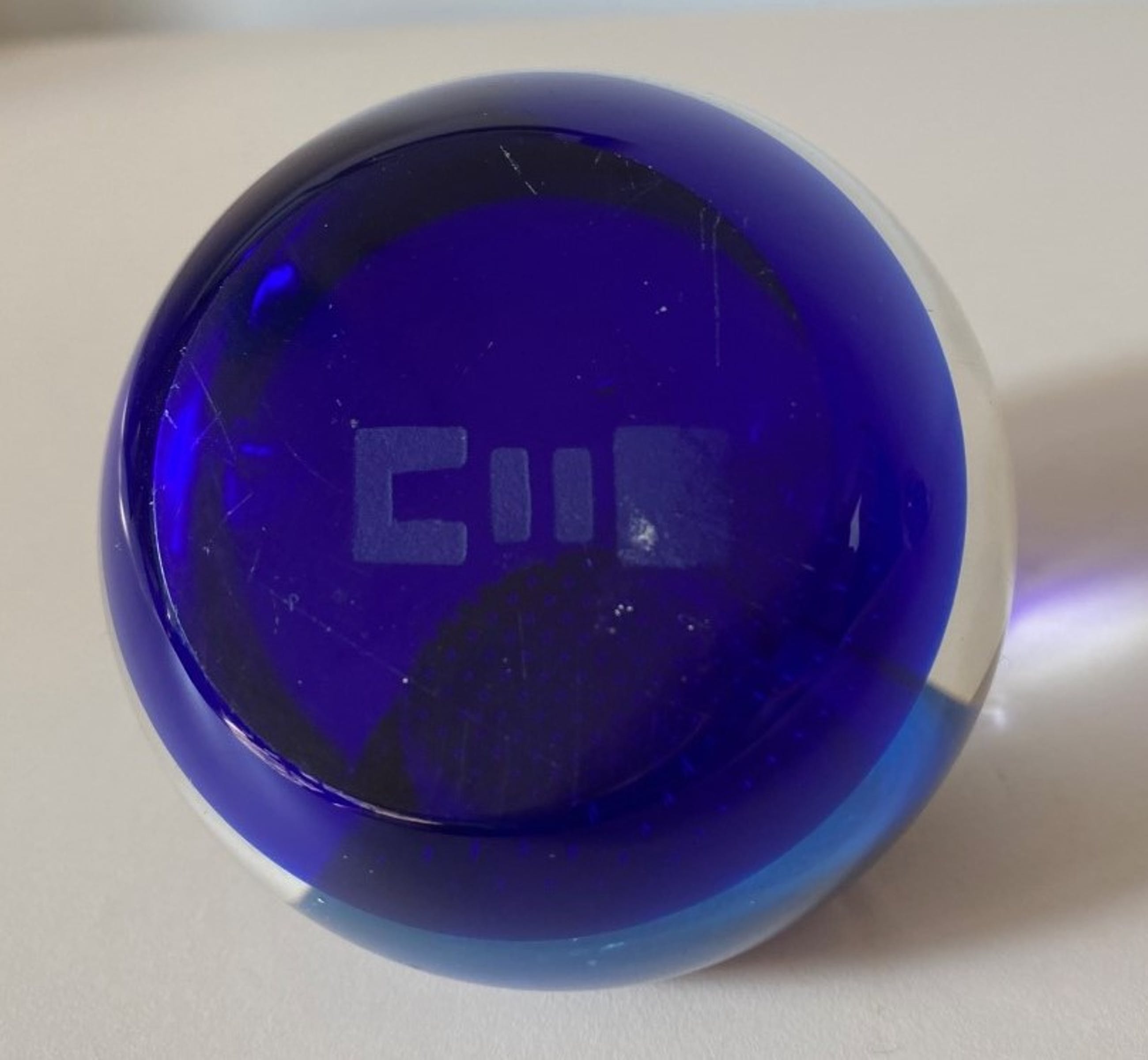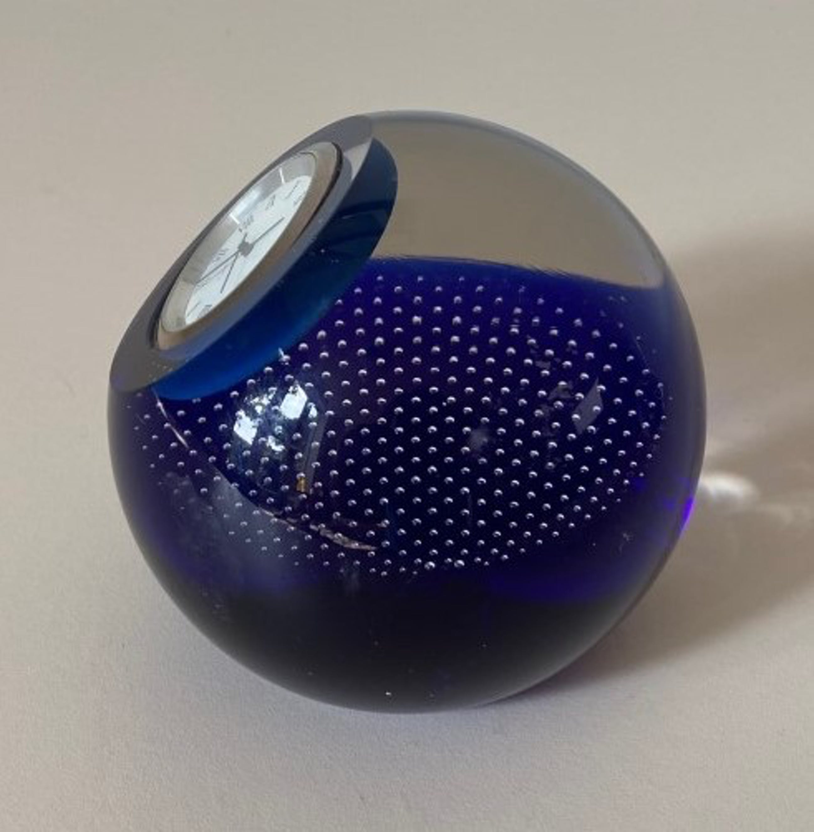 Presse papier met klokje ontworpen door de beroemde glasontwerp Alastair Macintosh in 1995. De presse papier heeft verder ingesloten spijker bellen en een prachtige kleur kobalt blauw is voorzien van een quartz klokje welke een nieuwe batterij nodig heeft. De presse papier is in prima onbeschadigde conditie en voorzien van een geetst monogram van een firma aan de onderzijde.
