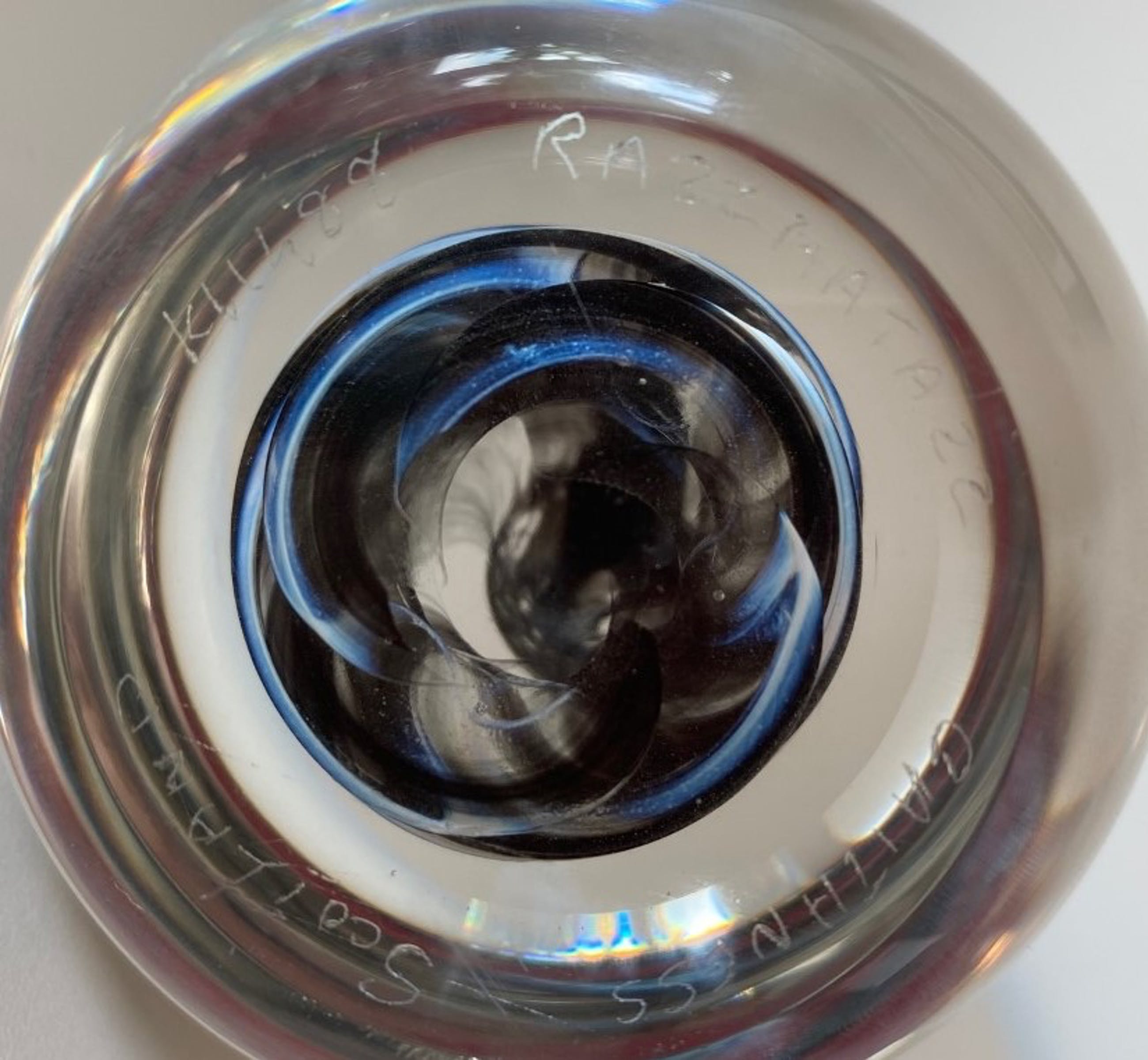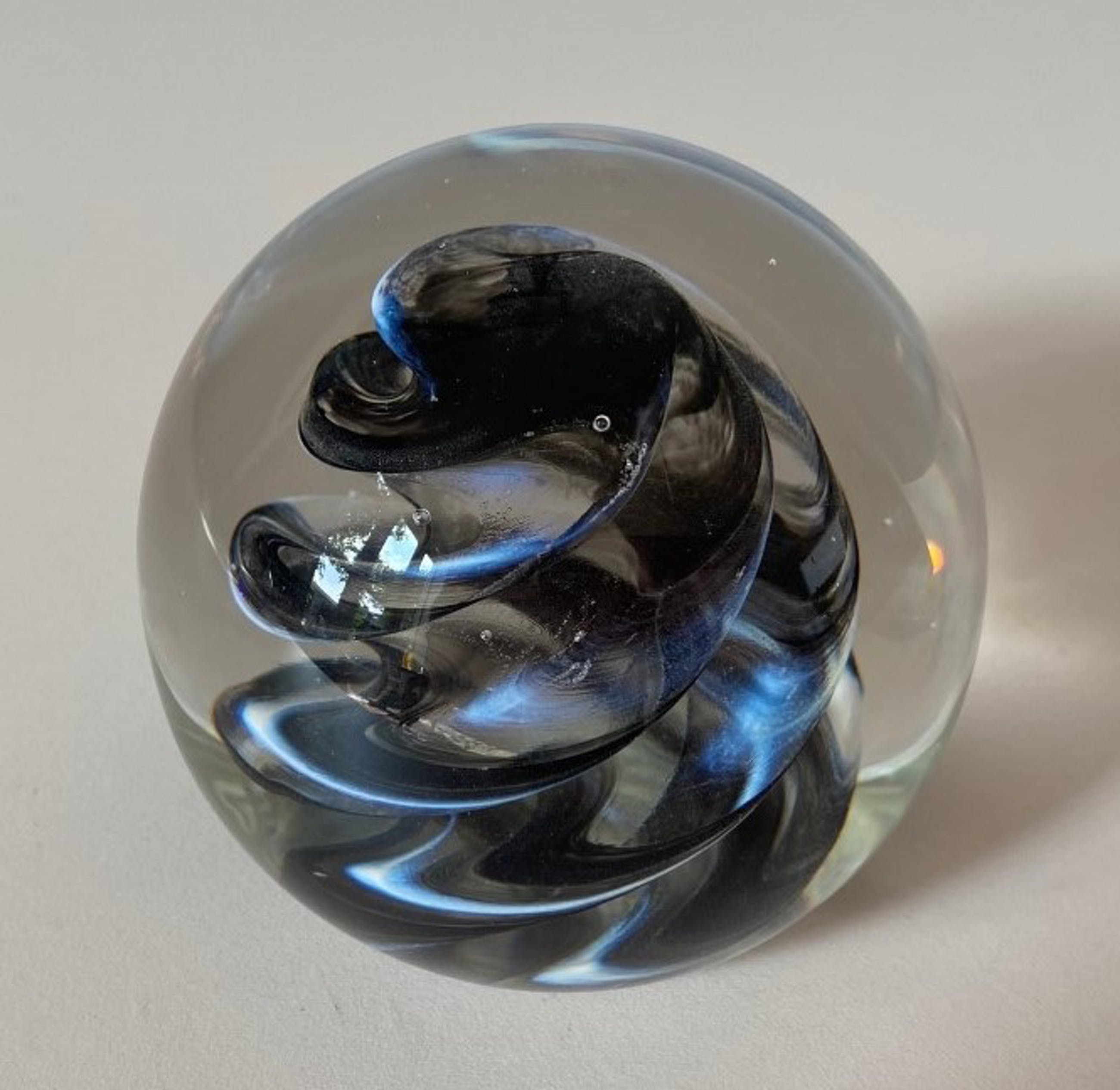 Presse papier model Razz Matazz K11488 met ene zwart witte glaspoeder slinger aan de binnenzijde. In zeer goede conditie en hand gesigneerd aan de onderzijde.