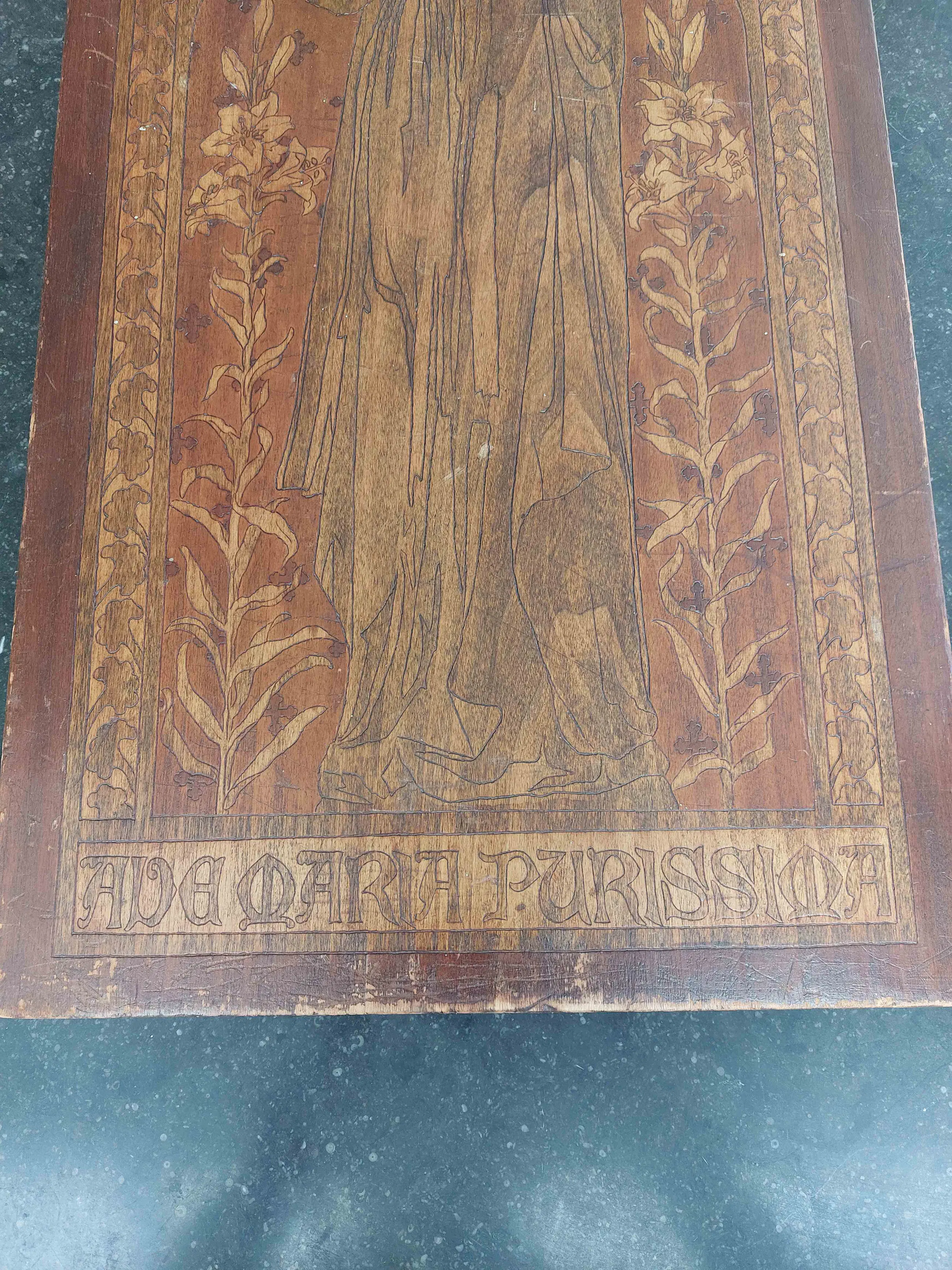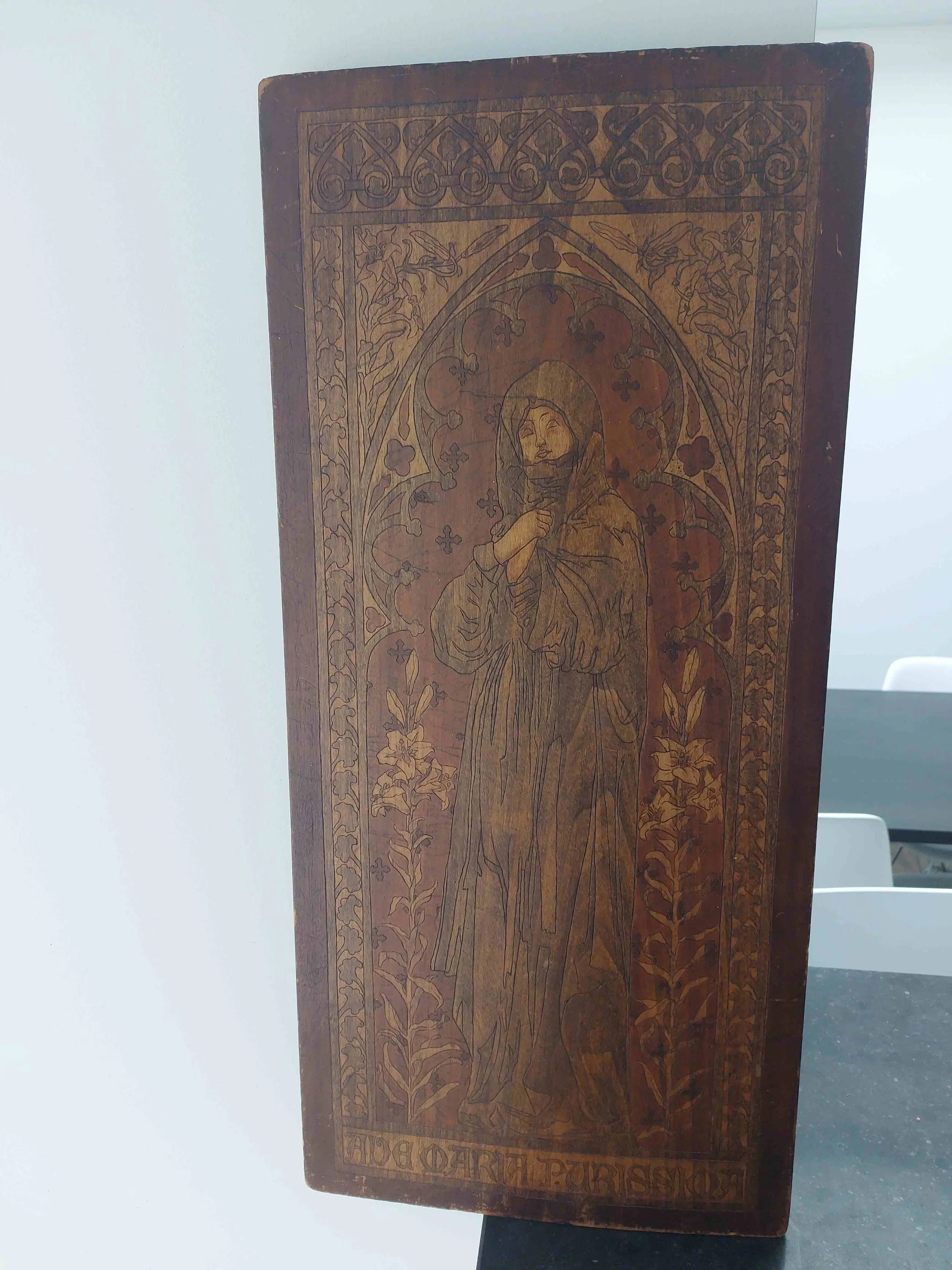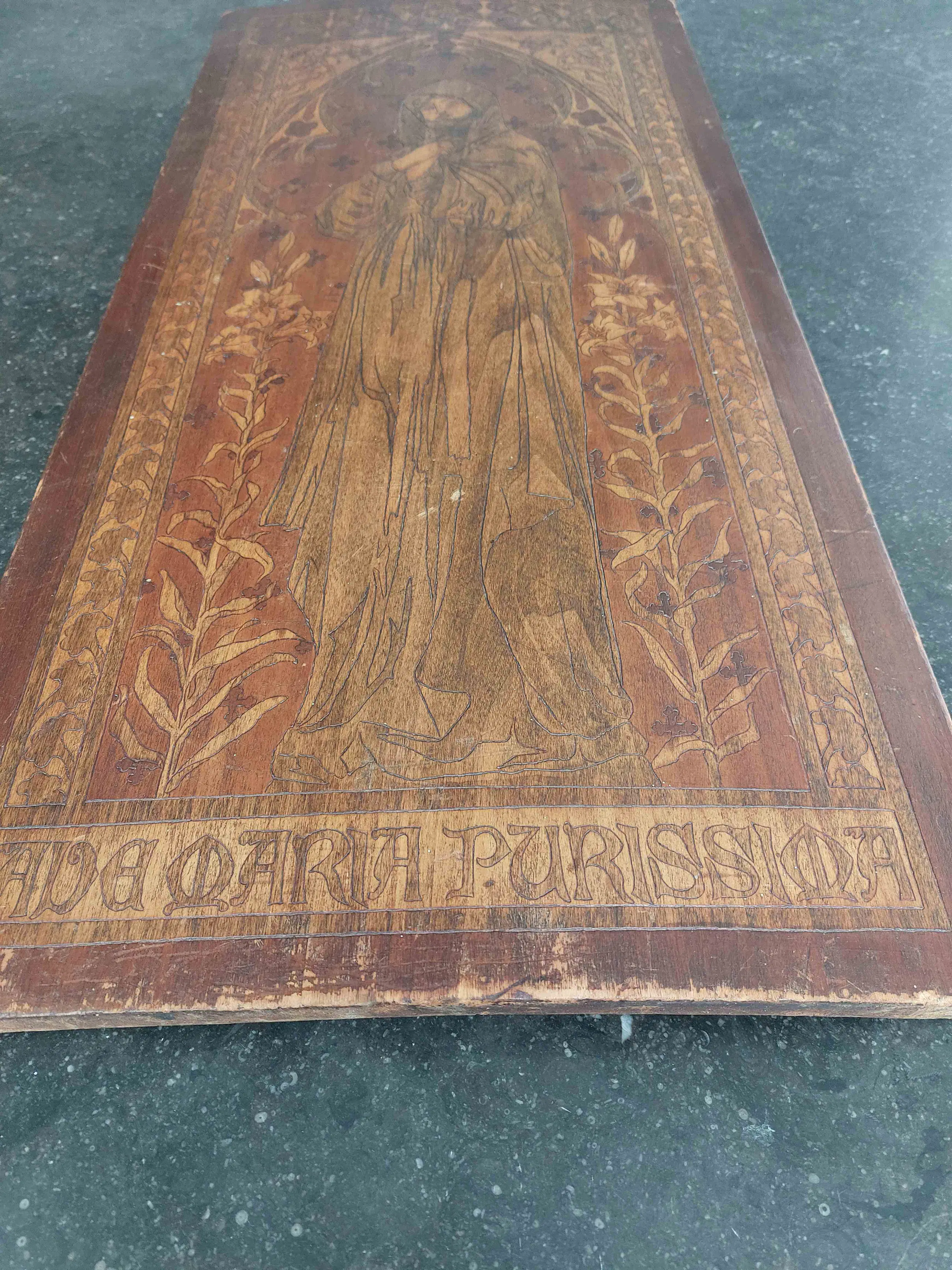 De tekening op het paneel is uitgevoerd in pyrografie. Met speciale stift met gloeiende naald werd de tekening in het hout gebrand. Je ziet op het paneel dat er gewerkt is naar een ontwerp, meer dan waarschijnlijk naar een tekening met klare lijn die dan is overgezet. Met boen kunnen dan kleurverschillen worden aangebracht in de verschillende vlakken. Pyrogravure was een techniek die relatief populair was tijdens de art nouveau. Het geheel past beter binnen een brede beweging van art nouveau met Franse en Engelse invloeden. Het doet wat denken aan de glasramen en tapijten van William Morris en de figuur lijkt wat op 'L'hiver' van Alphonse Mucha. Het paneel werd waarschijnlijk vervaardigd in een klein atelier maar het is moeilijk om de naam daarvan te achterhalen. Paneel in oorspronkelijke staat zonder restauraties. Kleuren zijn iets donkerder dan de afbeeldingen laten uitschijnen. Inscriptie onderaan: 'Ave Maria Purissima'.