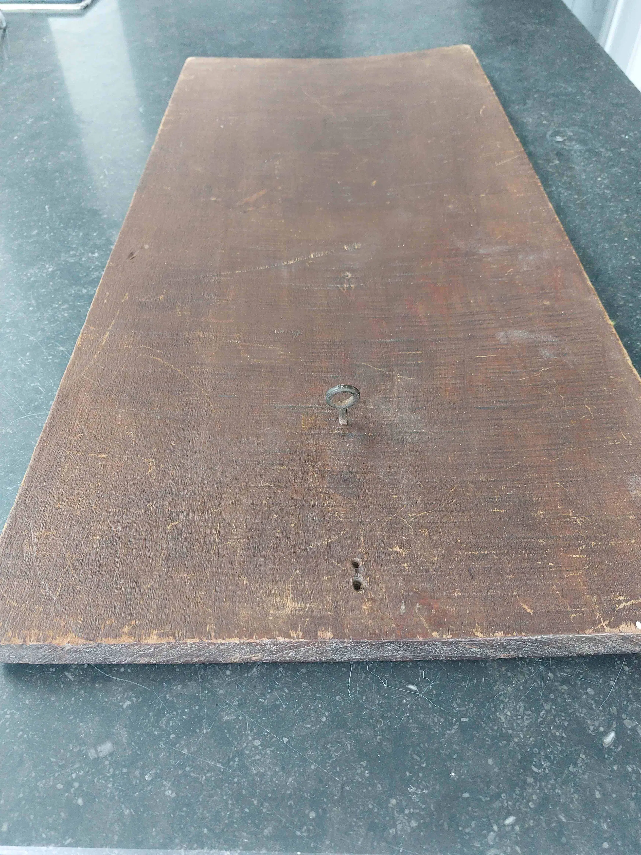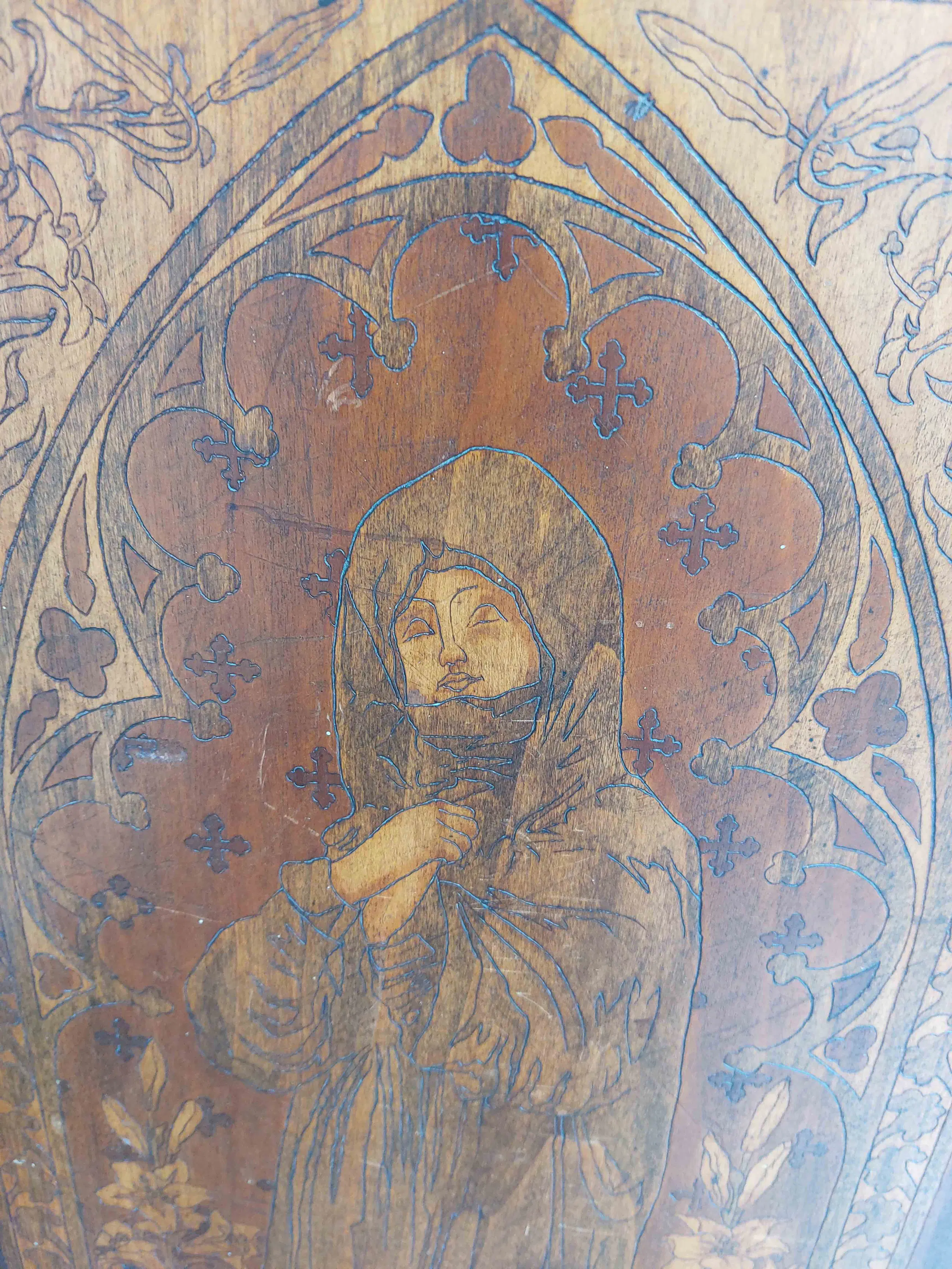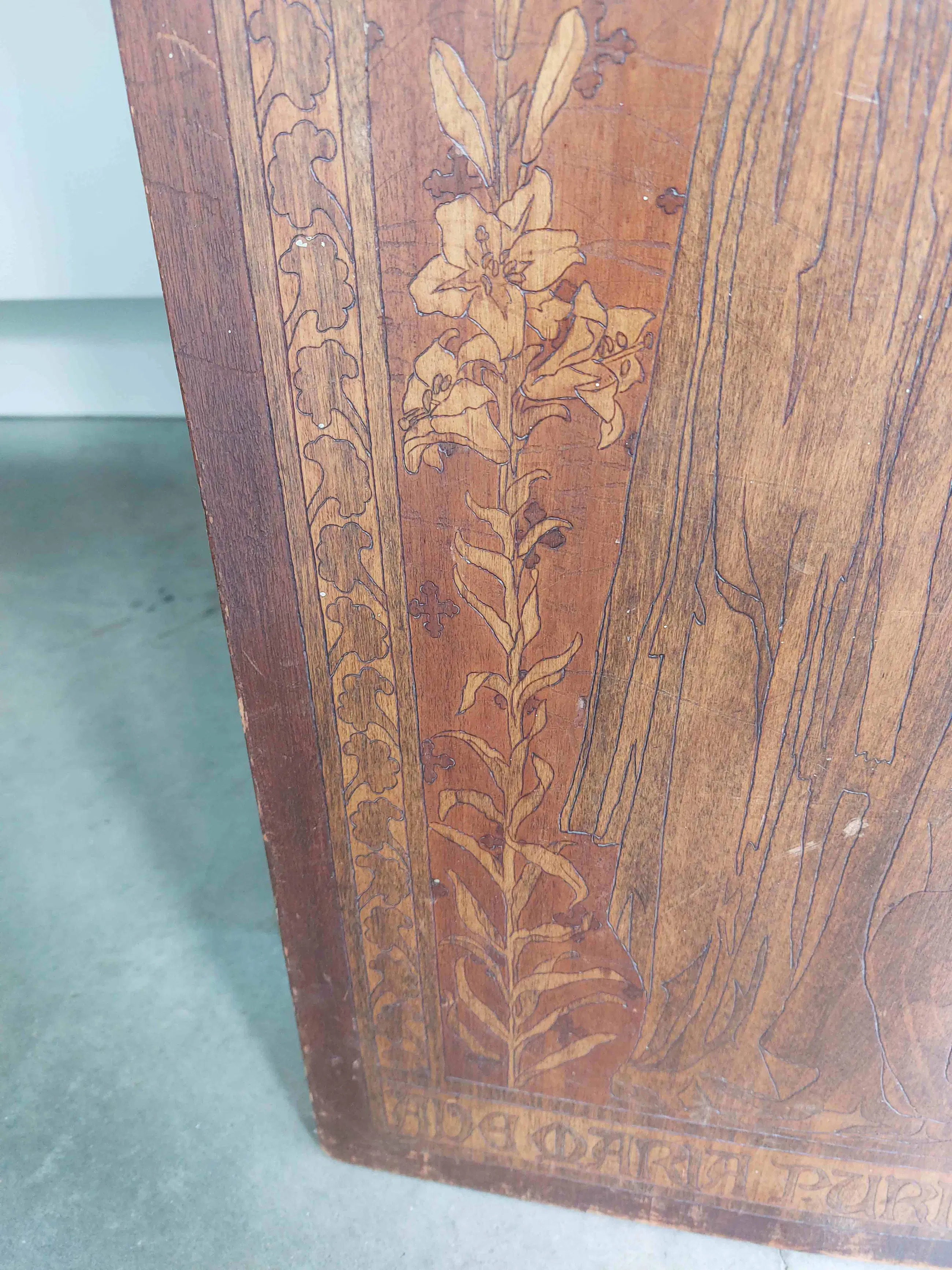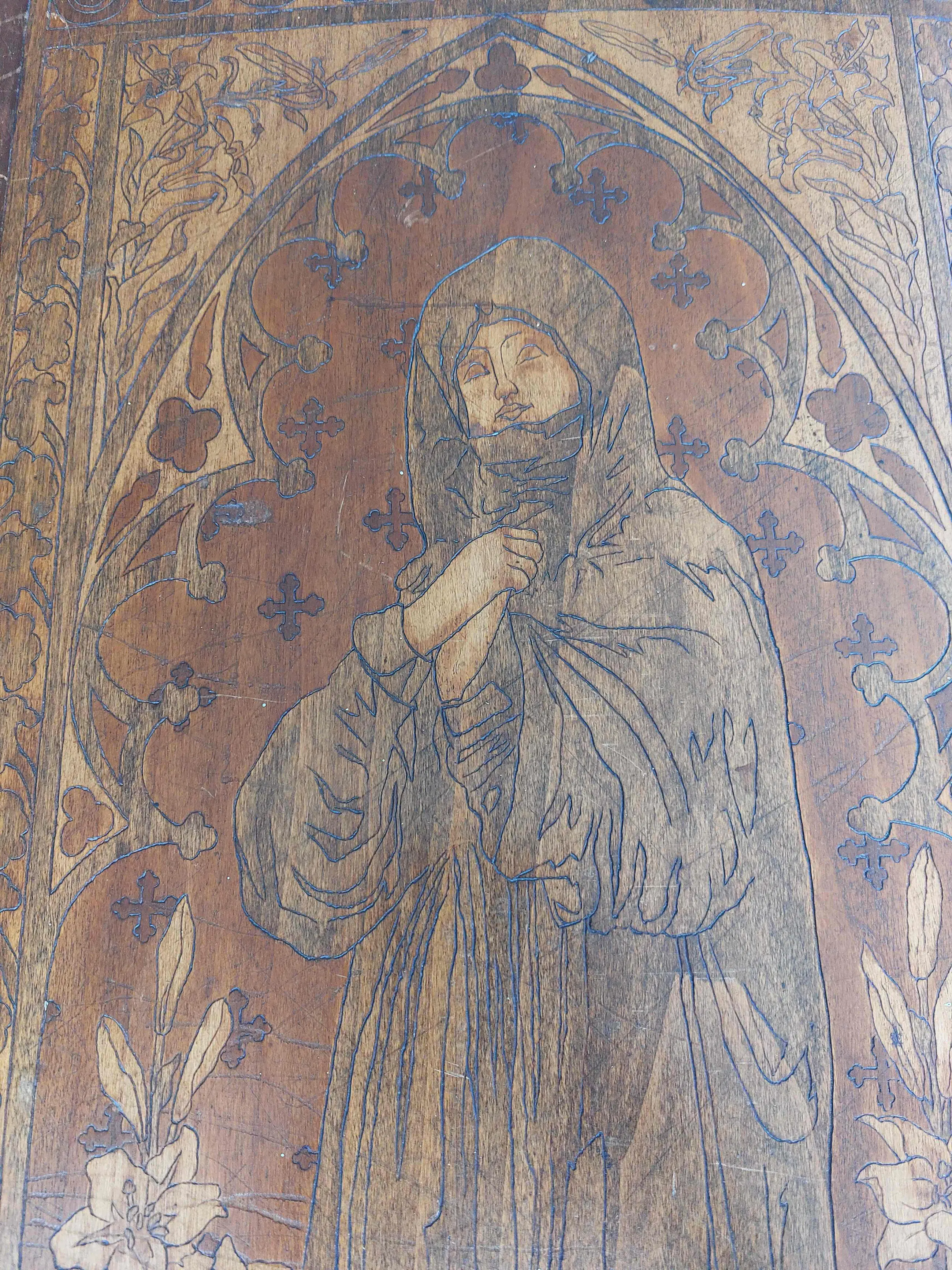 De tekening op het paneel is uitgevoerd in pyrografie. Met speciale stift met gloeiende naald werd de tekening in het hout gebrand. Je ziet op het paneel dat er gewerkt is naar een ontwerp, meer dan waarschijnlijk naar een tekening met klare lijn die dan is overgezet. Met boen kunnen dan kleurverschillen worden aangebracht in de verschillende vlakken. Pyrogravure was een techniek die relatief populair was tijdens de art nouveau. Het geheel past beter binnen een brede beweging van art nouveau met Franse en Engelse invloeden. Het doet wat denken aan de glasramen en tapijten van William Morris en de figuur lijkt wat op 'L'hiver' van Alphonse Mucha. Het paneel werd waarschijnlijk vervaardigd in een klein atelier maar het is moeilijk om de naam daarvan te achterhalen. Paneel in oorspronkelijke staat zonder restauraties. Kleuren zijn iets donkerder dan de afbeeldingen laten uitschijnen. Inscriptie onderaan: 'Ave Maria Purissima'.