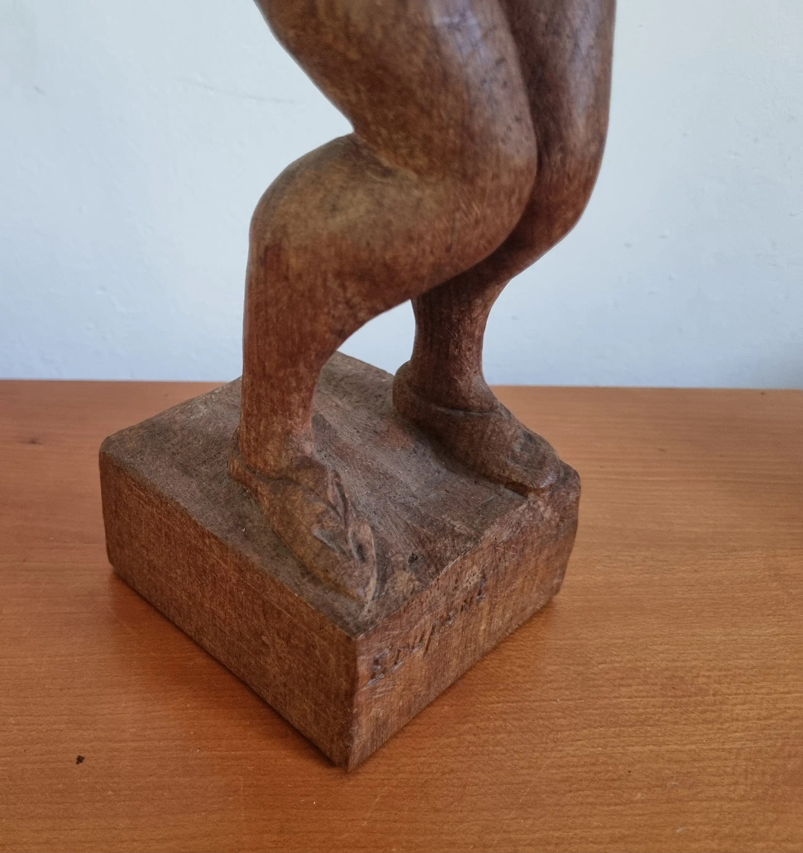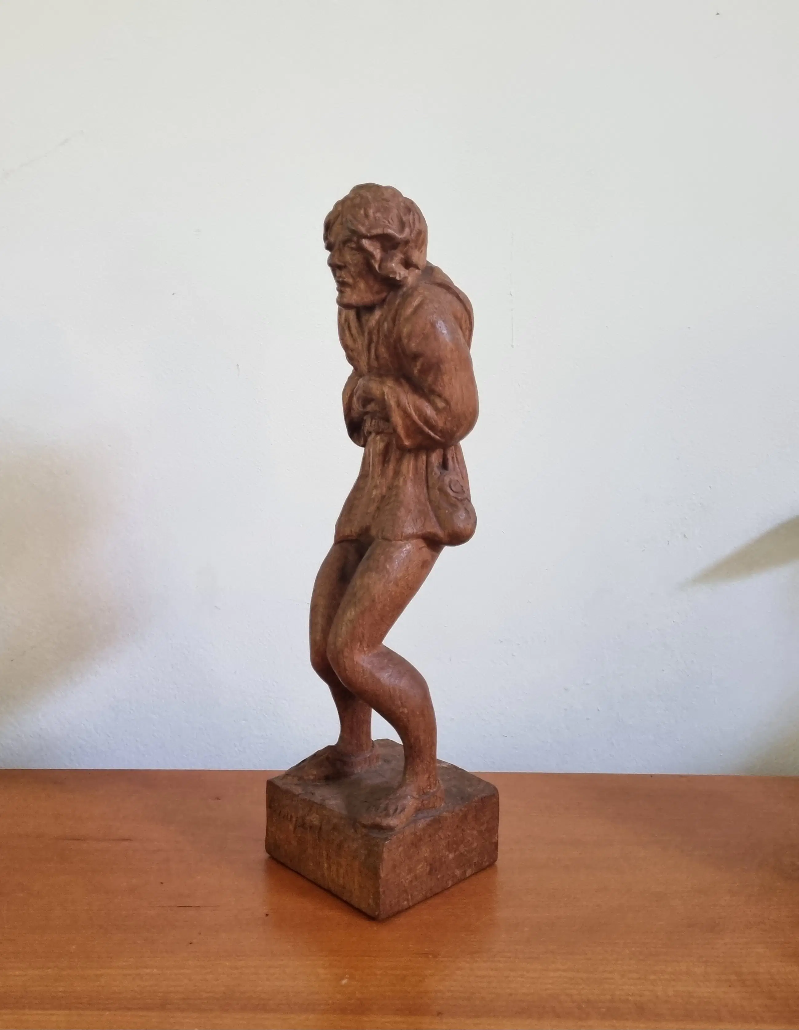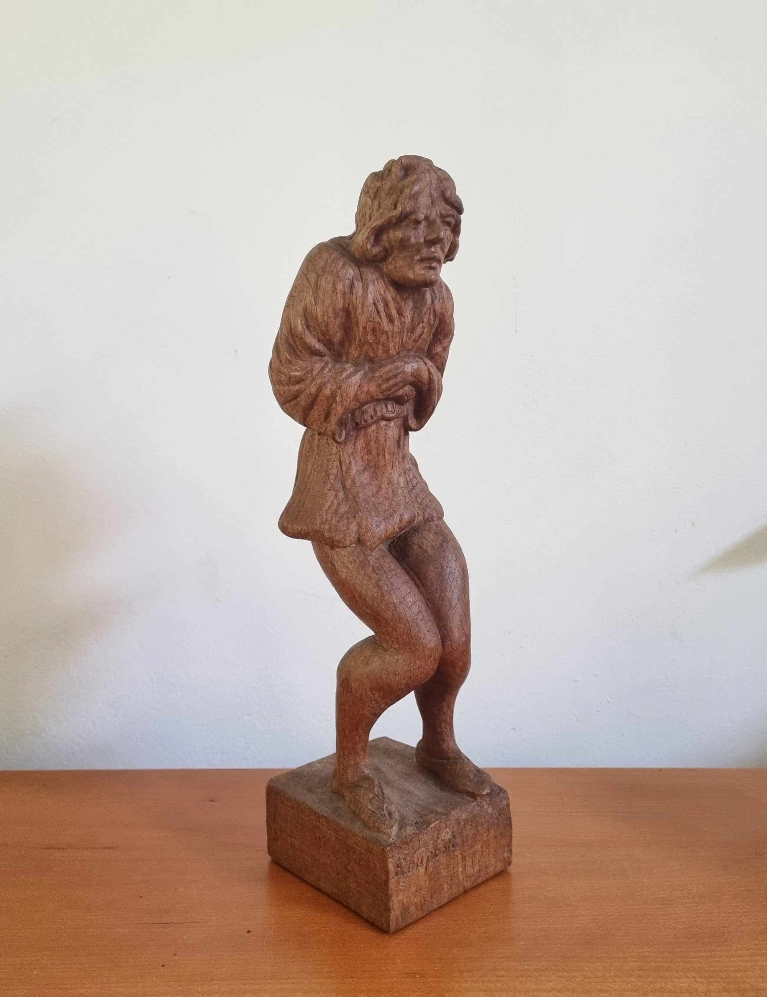 Quasimodo is de hoofdpersoon uit Victor Hugo's "De klokkenluider van de Notre Dame. Het hier aangeboden beeld is een iconische voorstelling die door diverse kunstenaars is weergegeven in materialen als o.m. brons en gips. Dirt beeld is van kunstenaar E. Dupont, uit hout gesneden. Over de kunstenaar is mij verder niet bekend. Het beeld dateert waarschijnlijk uit het begin van de 20e eeuw