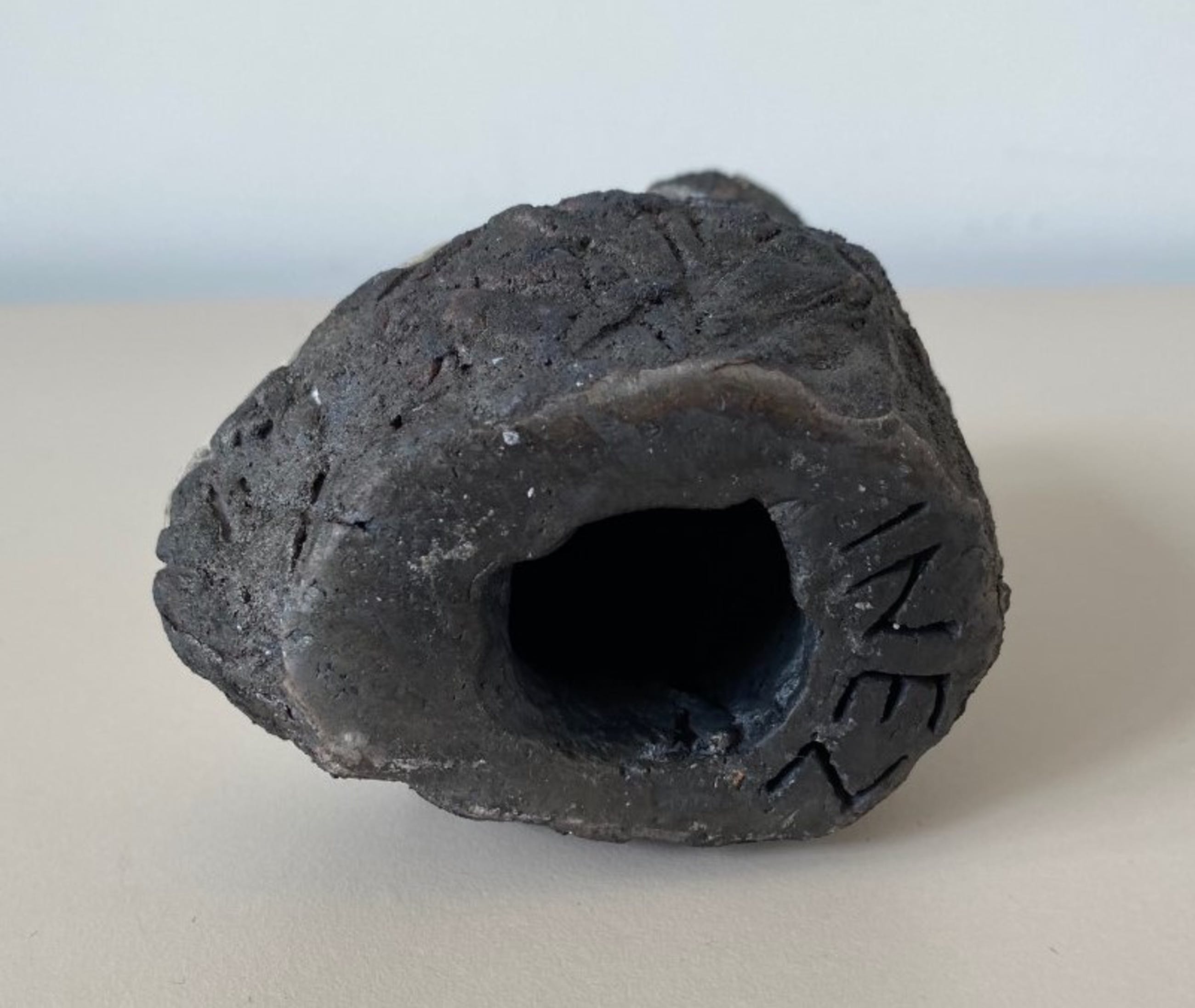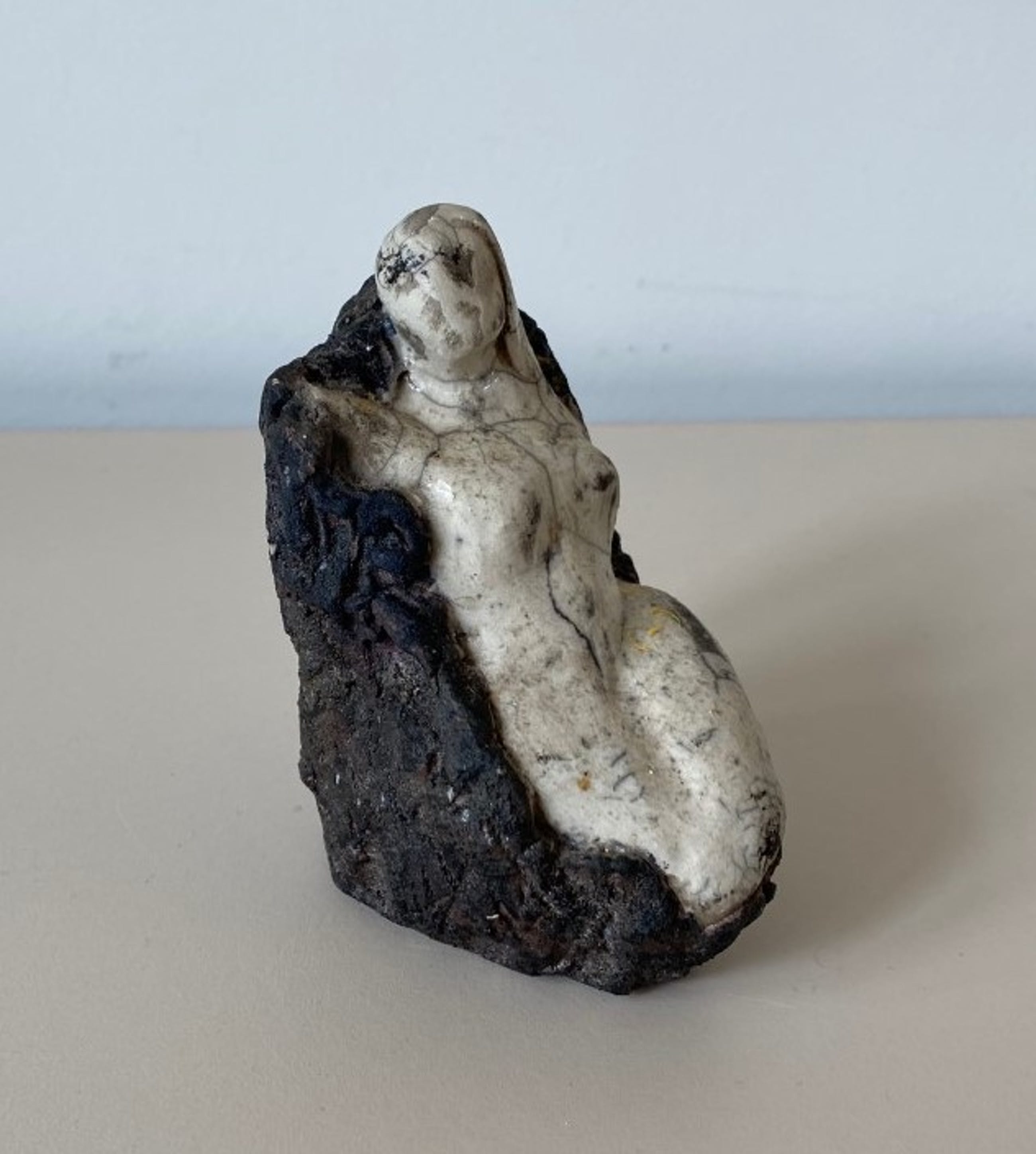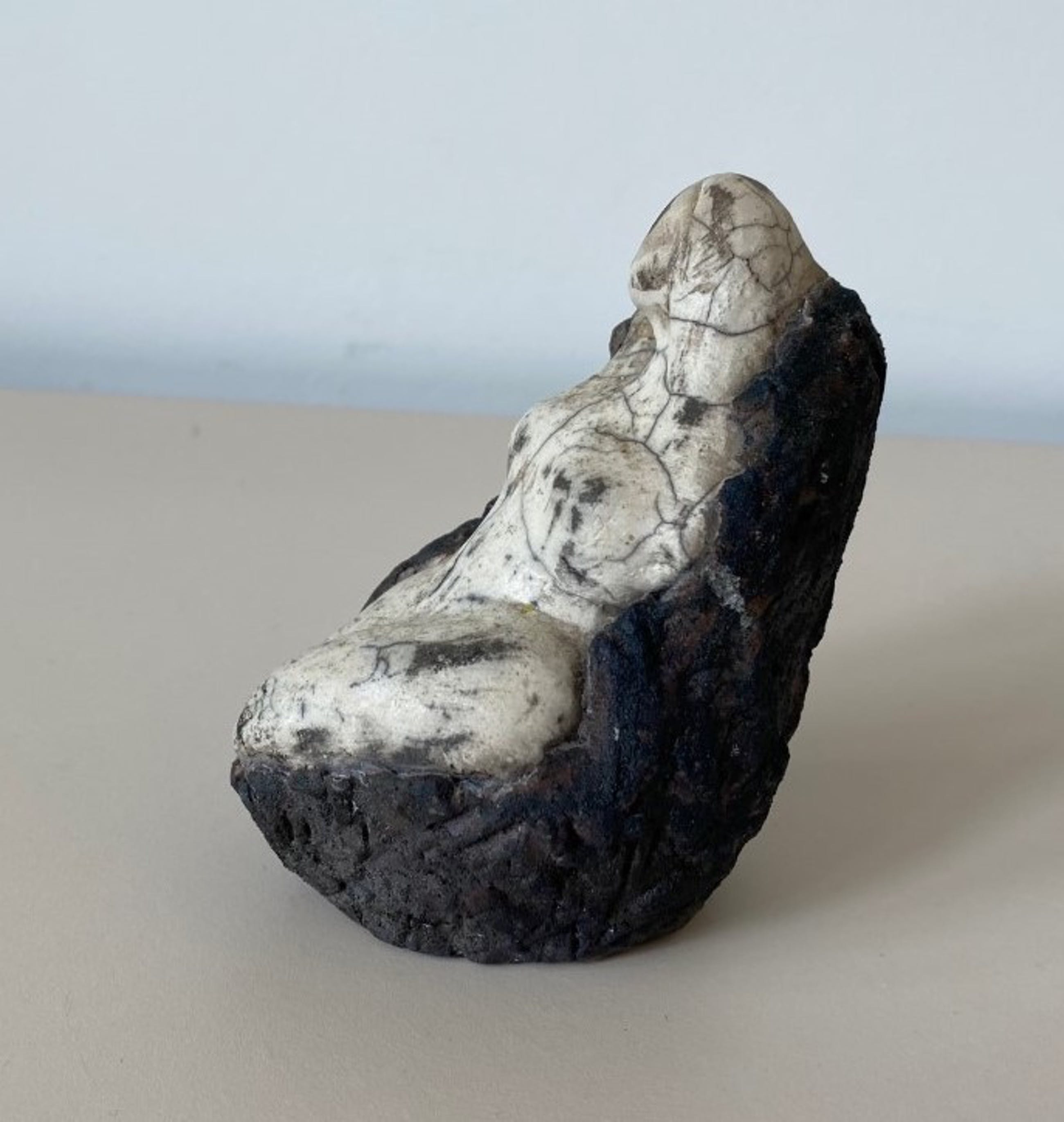 Raku aardewerken vrouwfiguur zonder armen en benen schijnbaar zittend in een zetel. Mooi kunst keramisch Raku figuurtje met de hand gesigneerd INEZ, helaas is de keramiste of kunstenaar mij hier onbekend.