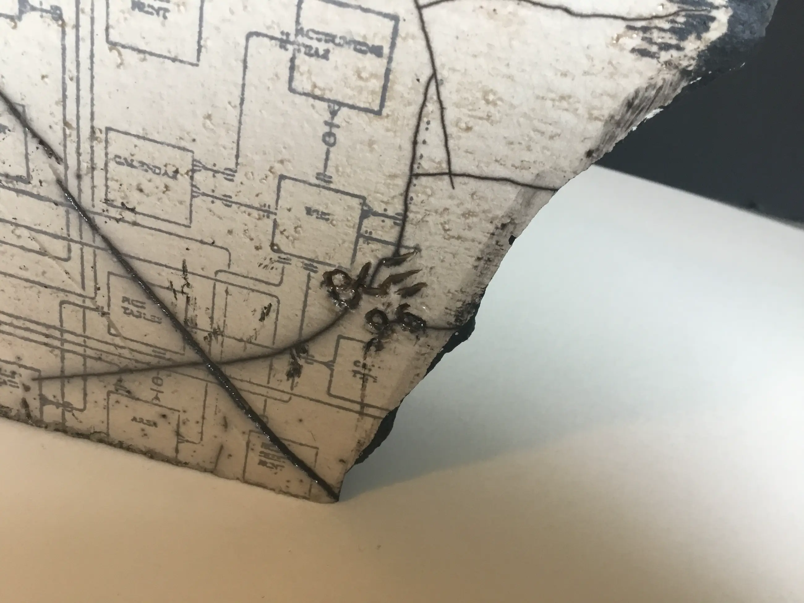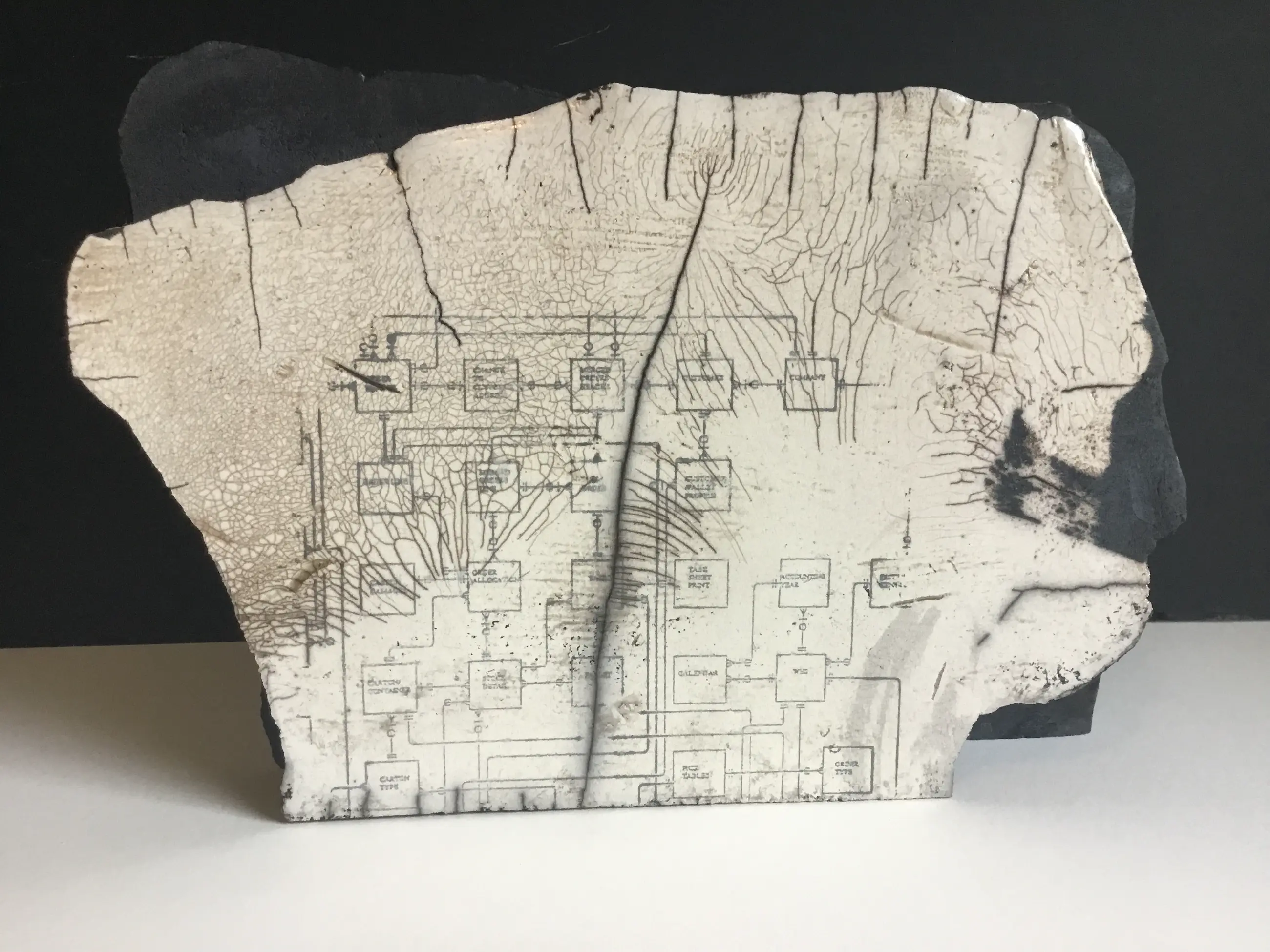 Bijzonder Raku-gemaakt object met een installatie-schema. Het werk is onleesbaar gesigneerd.