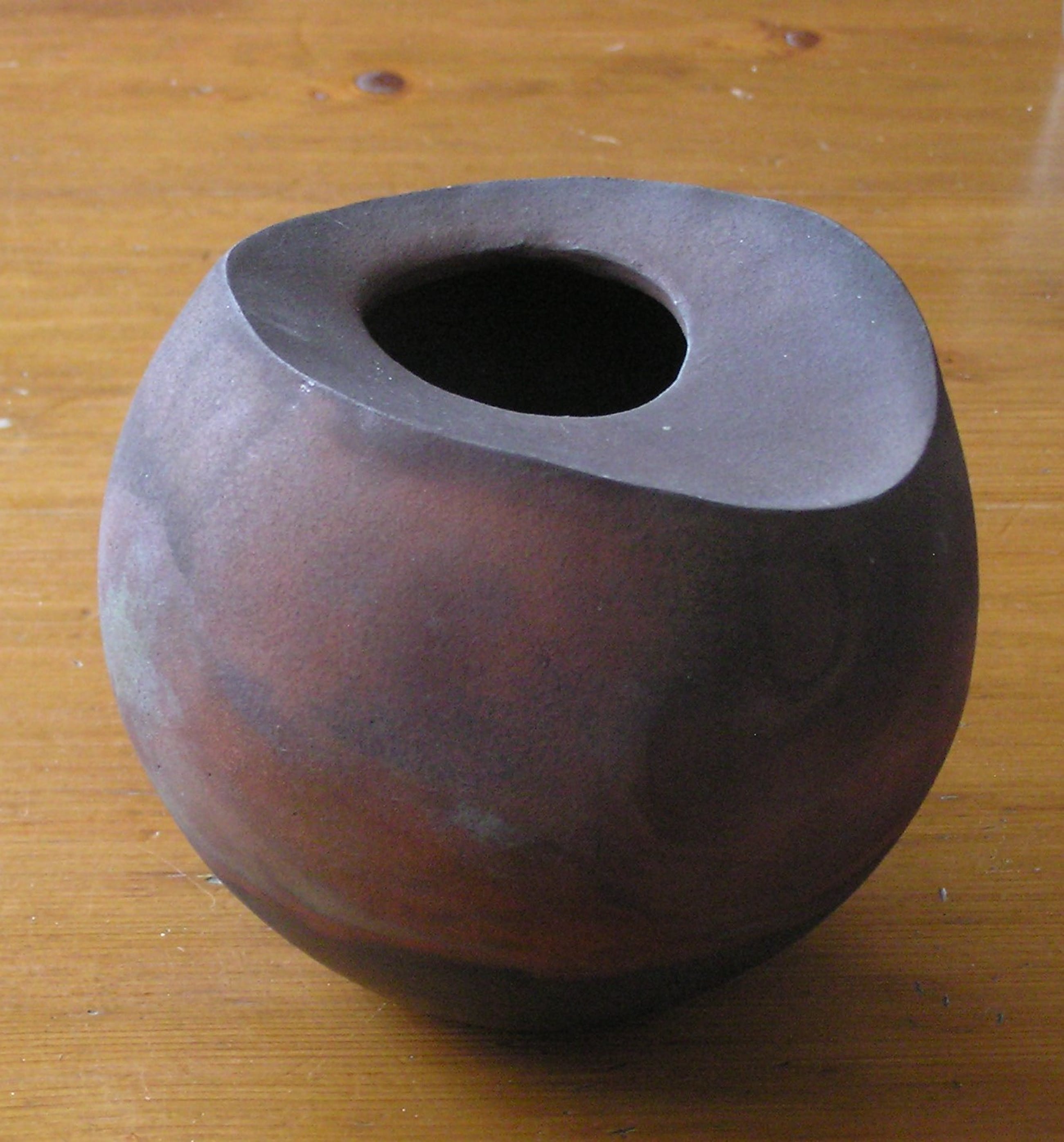 Raku studio keramische halve bolvaas met prachtig glazuur. Koper en ijzeroxide glazuren en de vaas heeft geen voet. Voorzien van monogram A.. keramist of kunstenaar helaas onbekend.