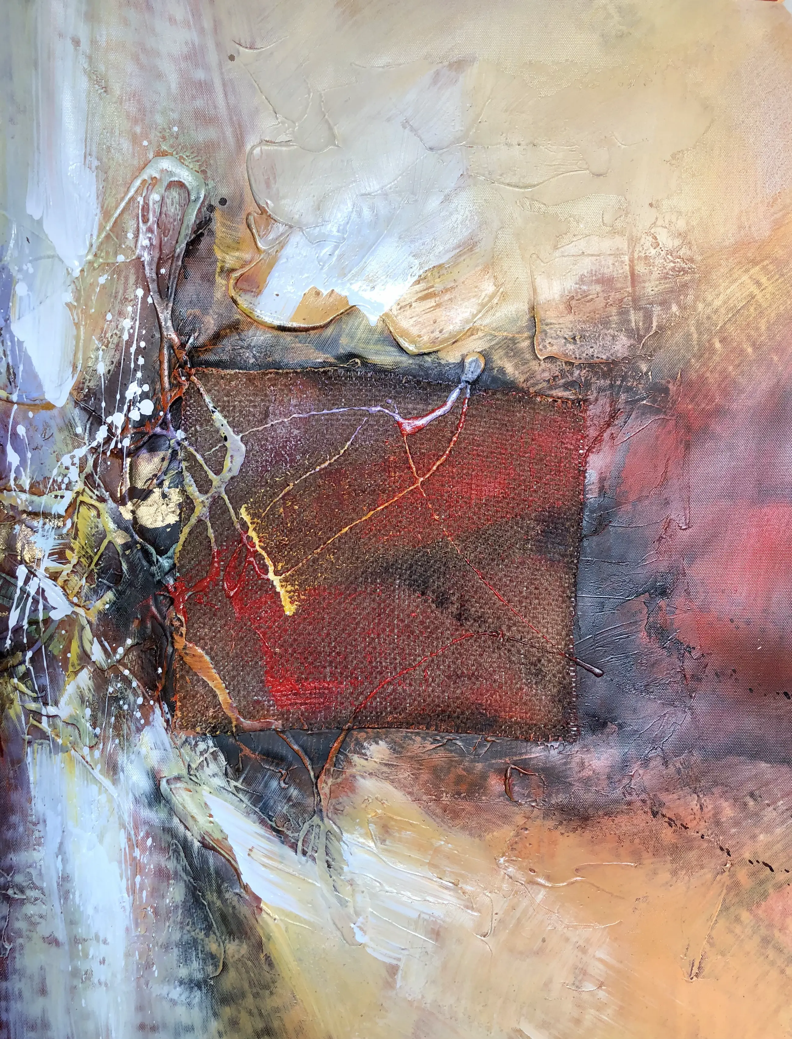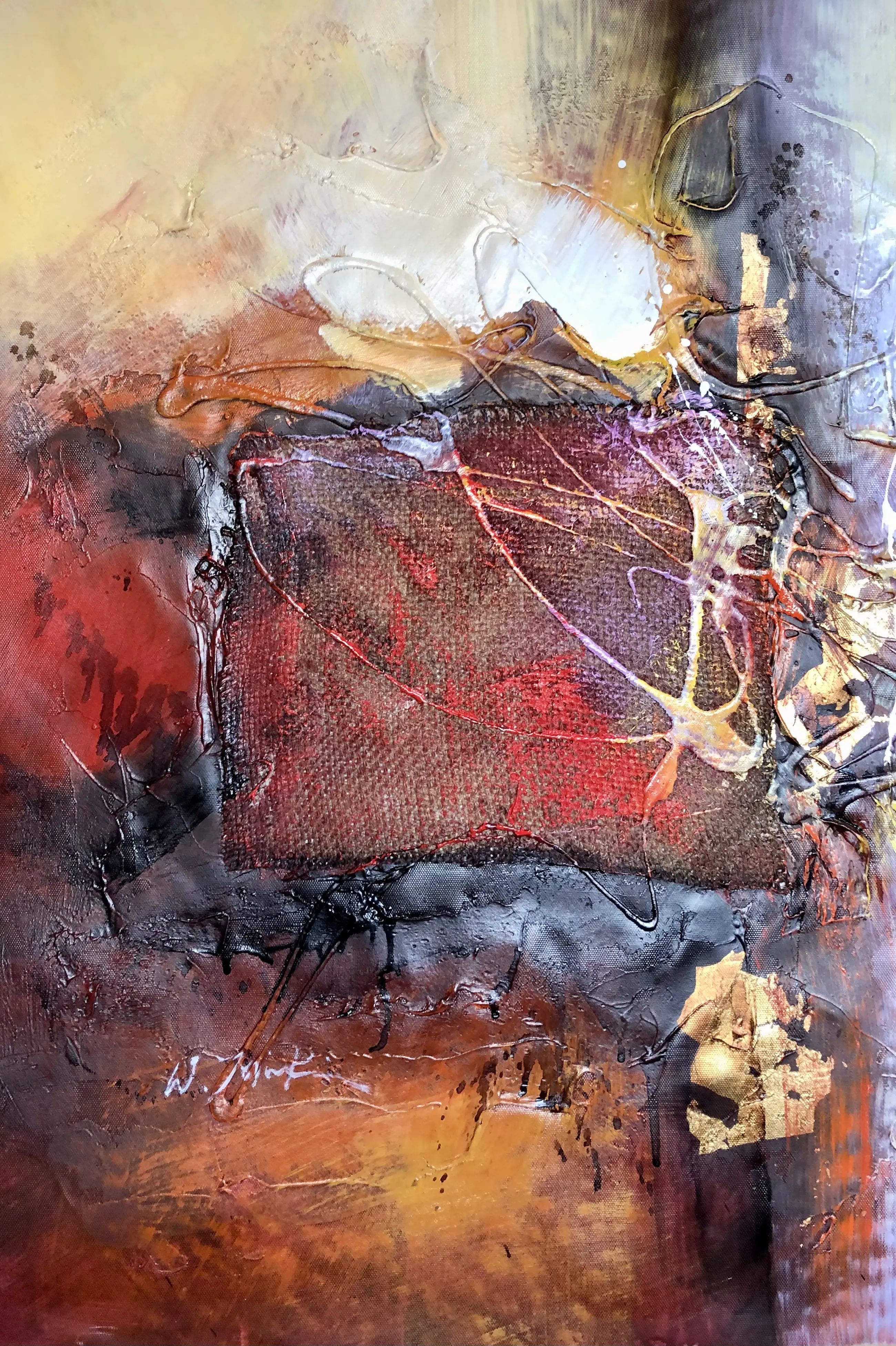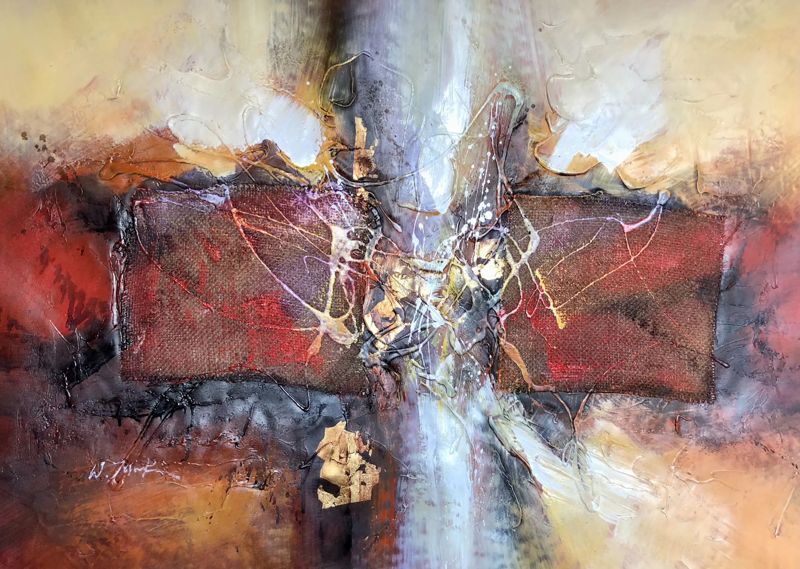 In dit grote en prachtige abstracte kunstwerk zijn diverse materialen gebruikt om de accenten te benadrukken. De keuren komen mooi tot zijn recht met een lichte achtergrond.
