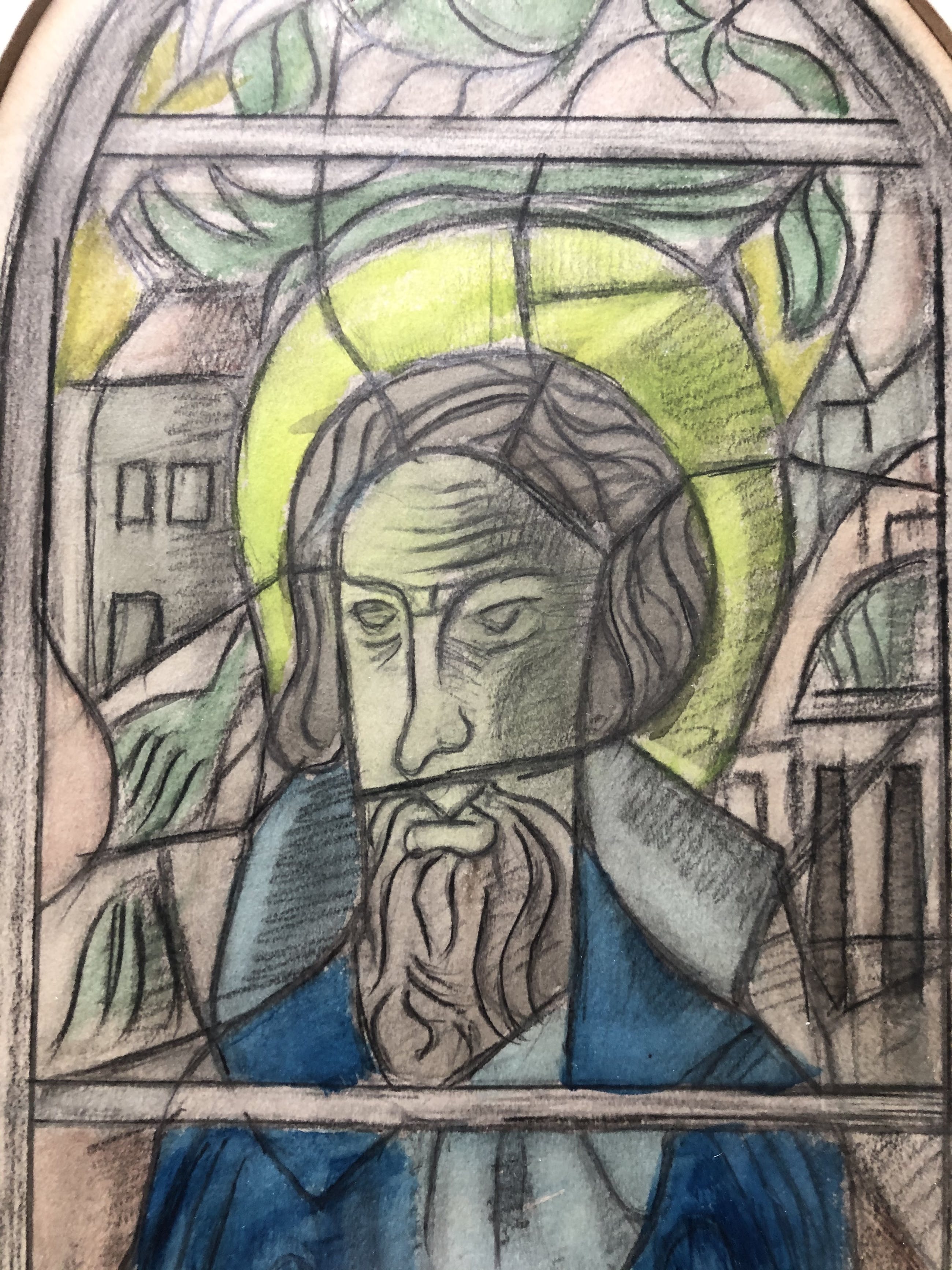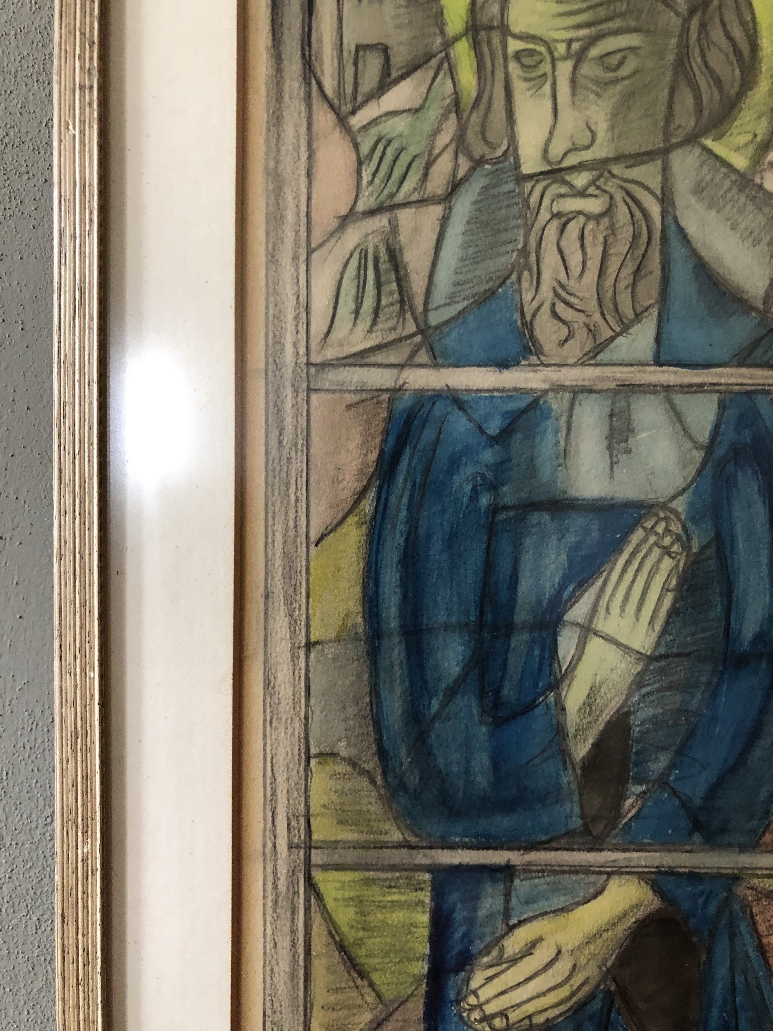 Hele bijzondere potloodtekening van een heilige in de stijl van glas-in-lood. Met op maat gemaakte pas partout en lijst.