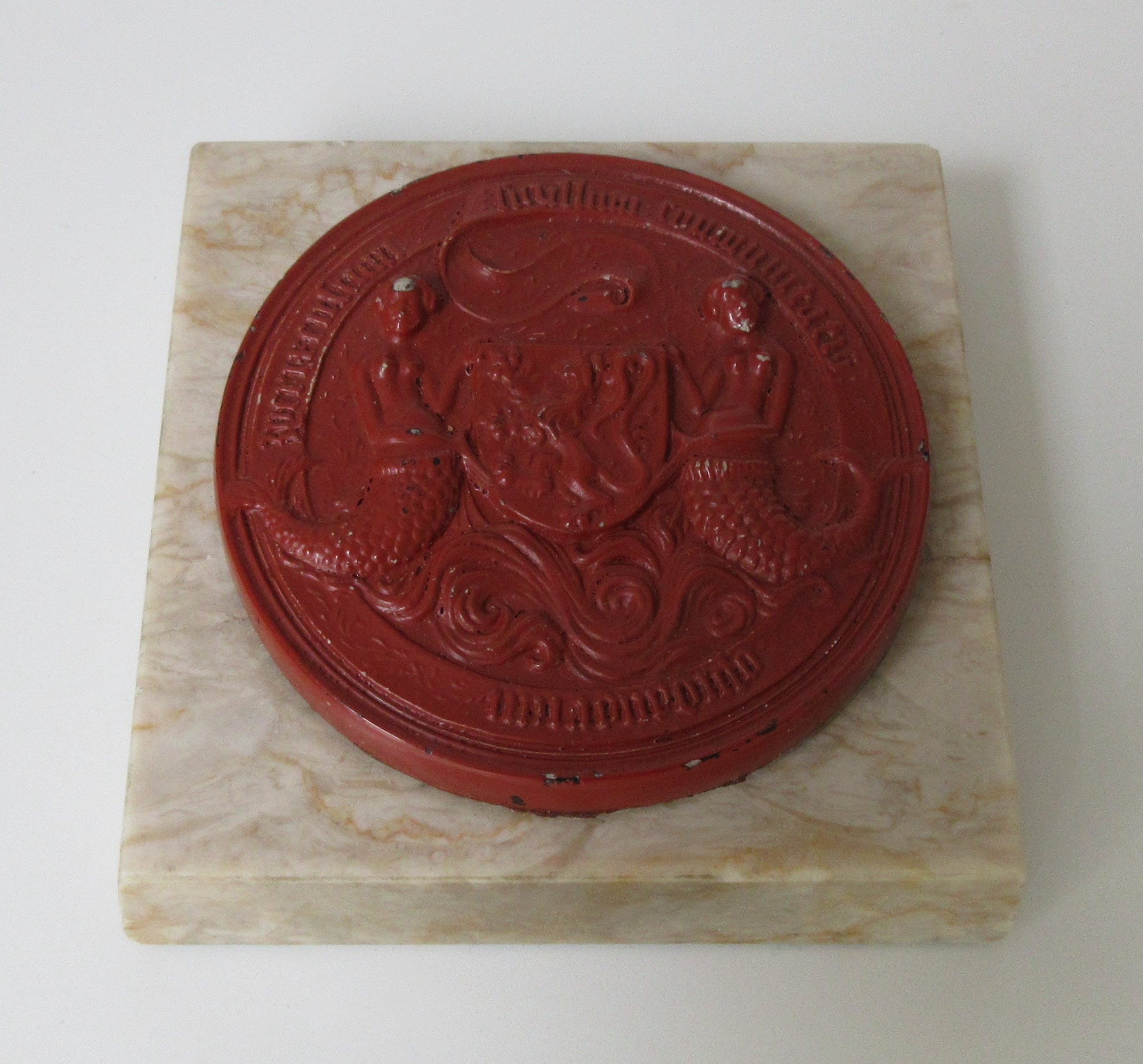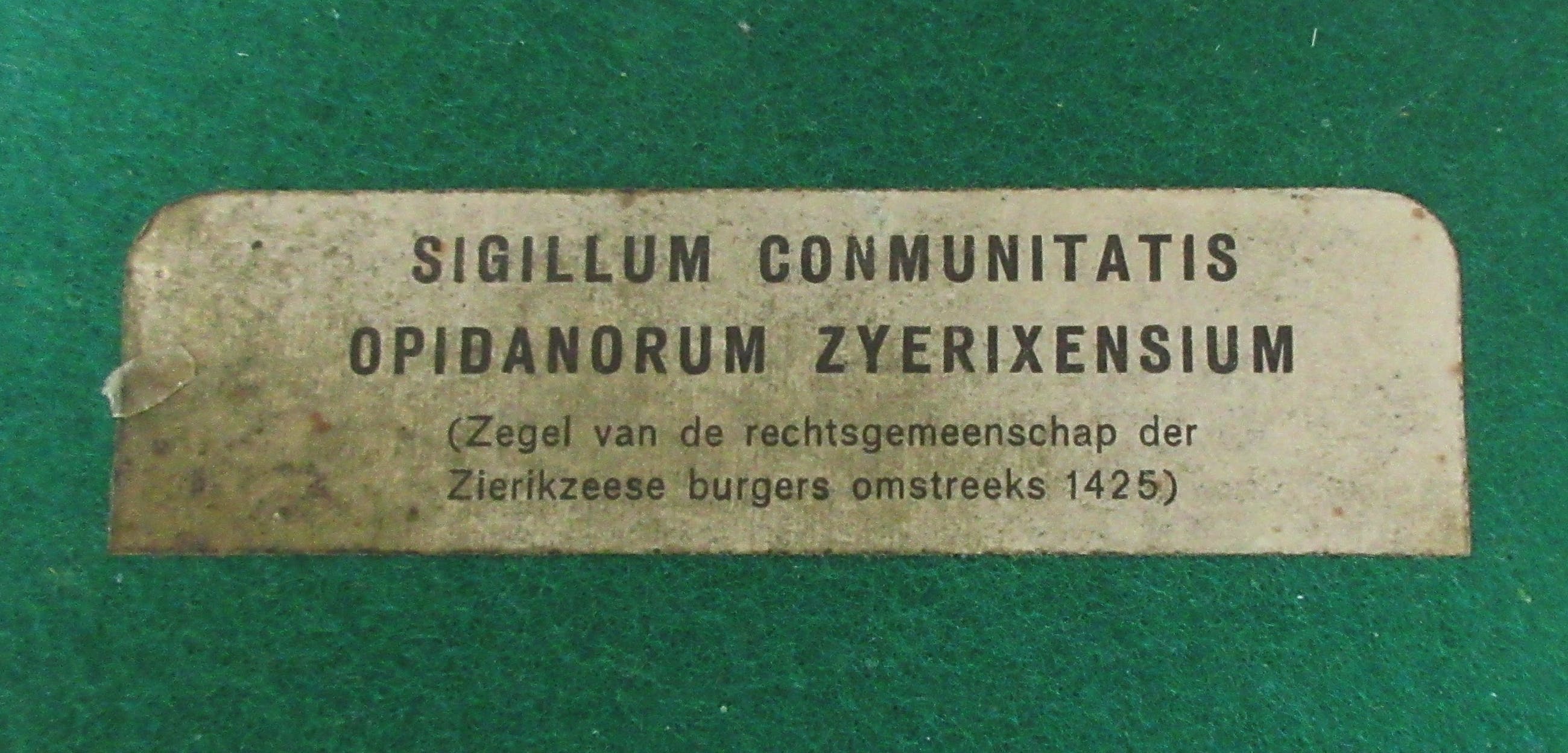 Replica van een lakzegel van de stad Zierikzee uit 1425 op wit marmeren sokkel. De zegel draagt de volgende Latijnse tekst; "Sigillum Conmunitatis Opidanorum Zyerixensium" (Zegel van de rechtsgemeenschap der Zierikzeese burgers omstreeks 1425).