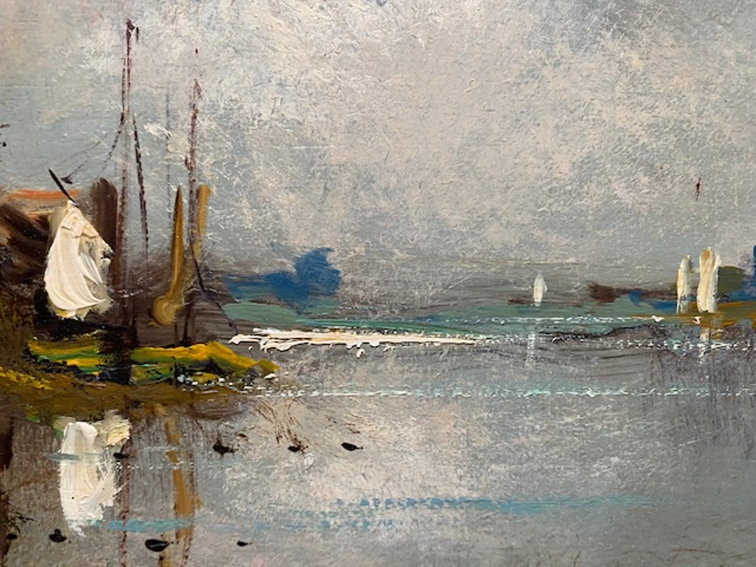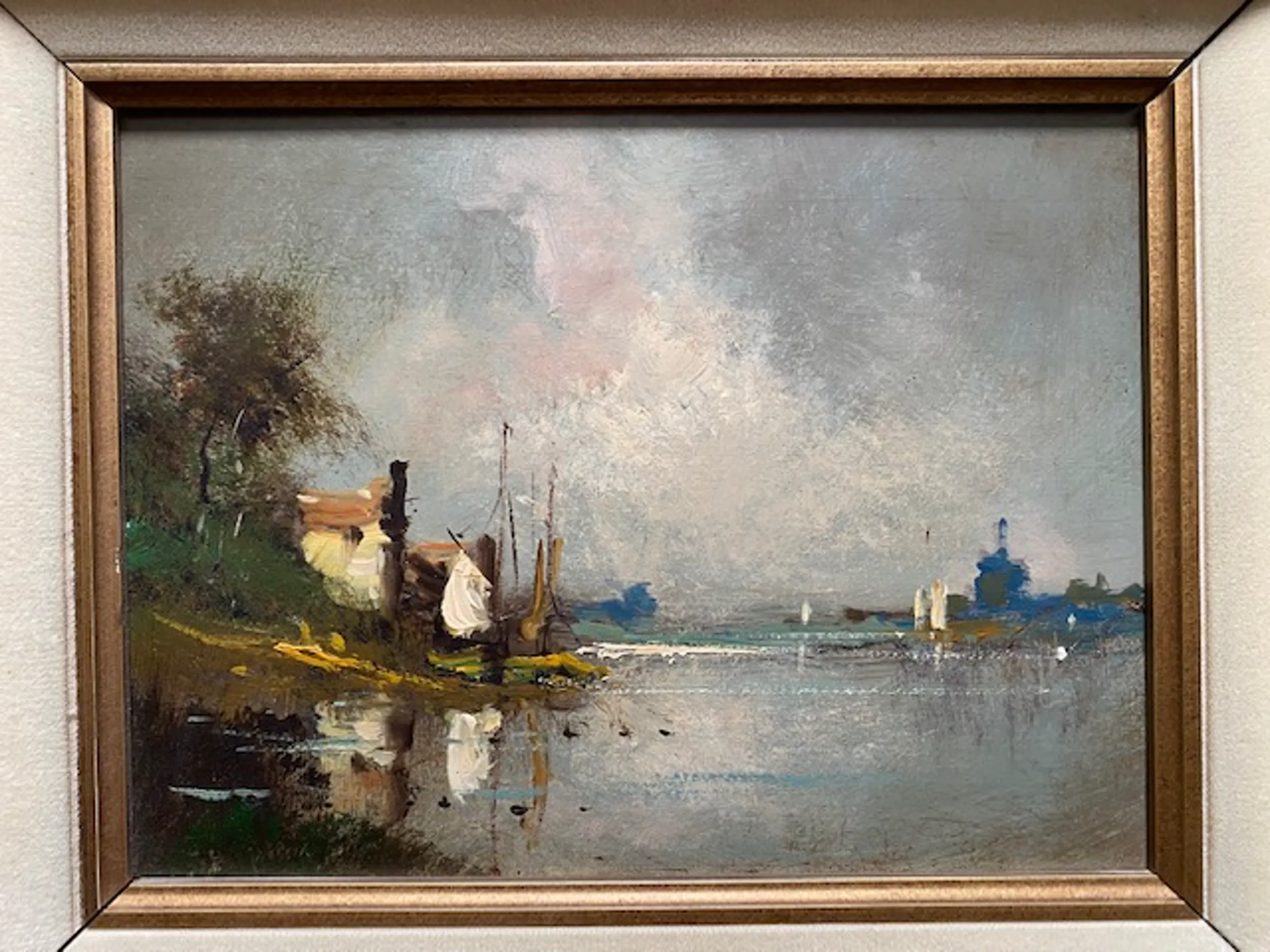 tafereel van een Hollands rivierenlandschap met aangemeerde schepen en een dorpje op de achtergrond