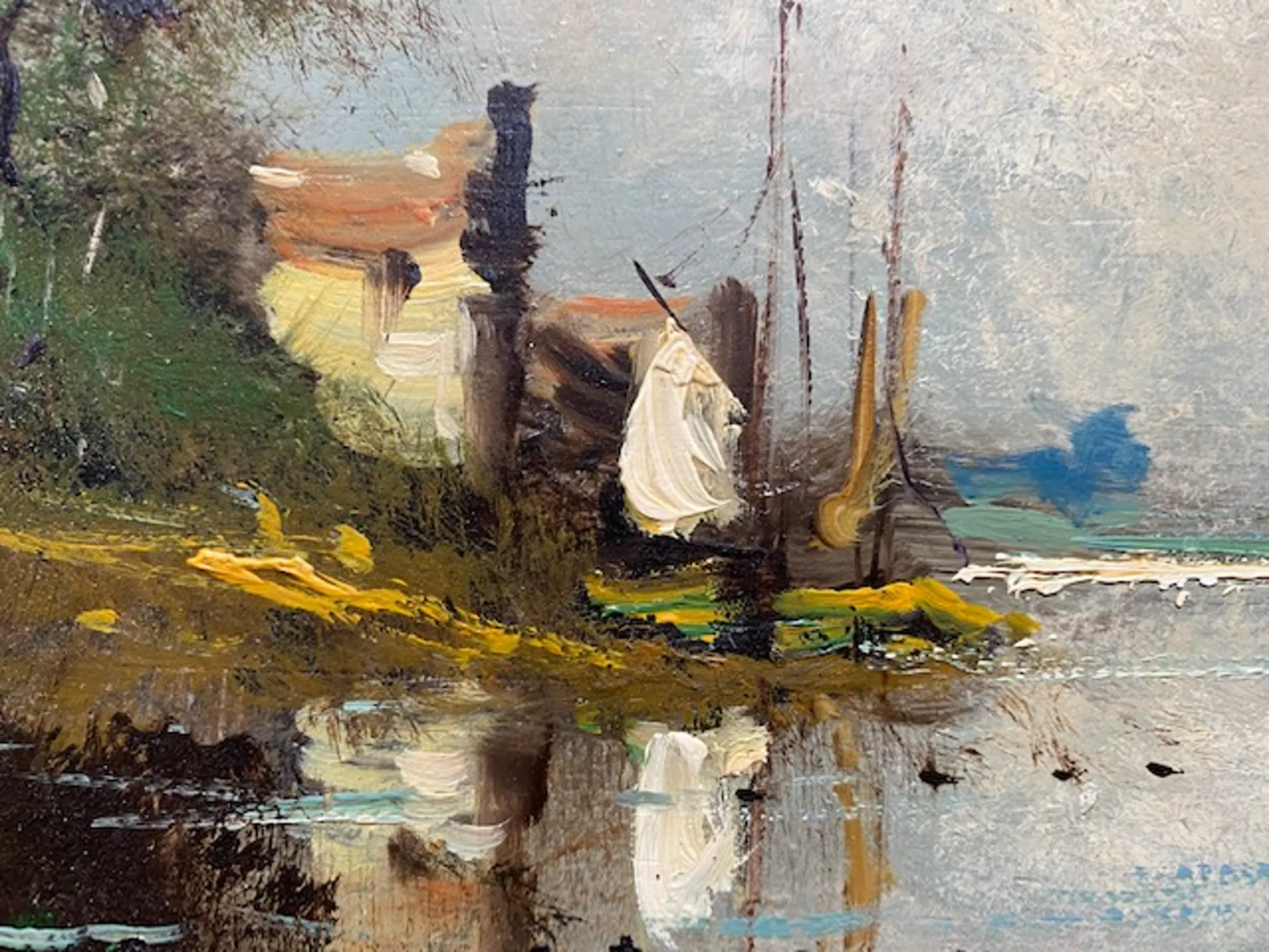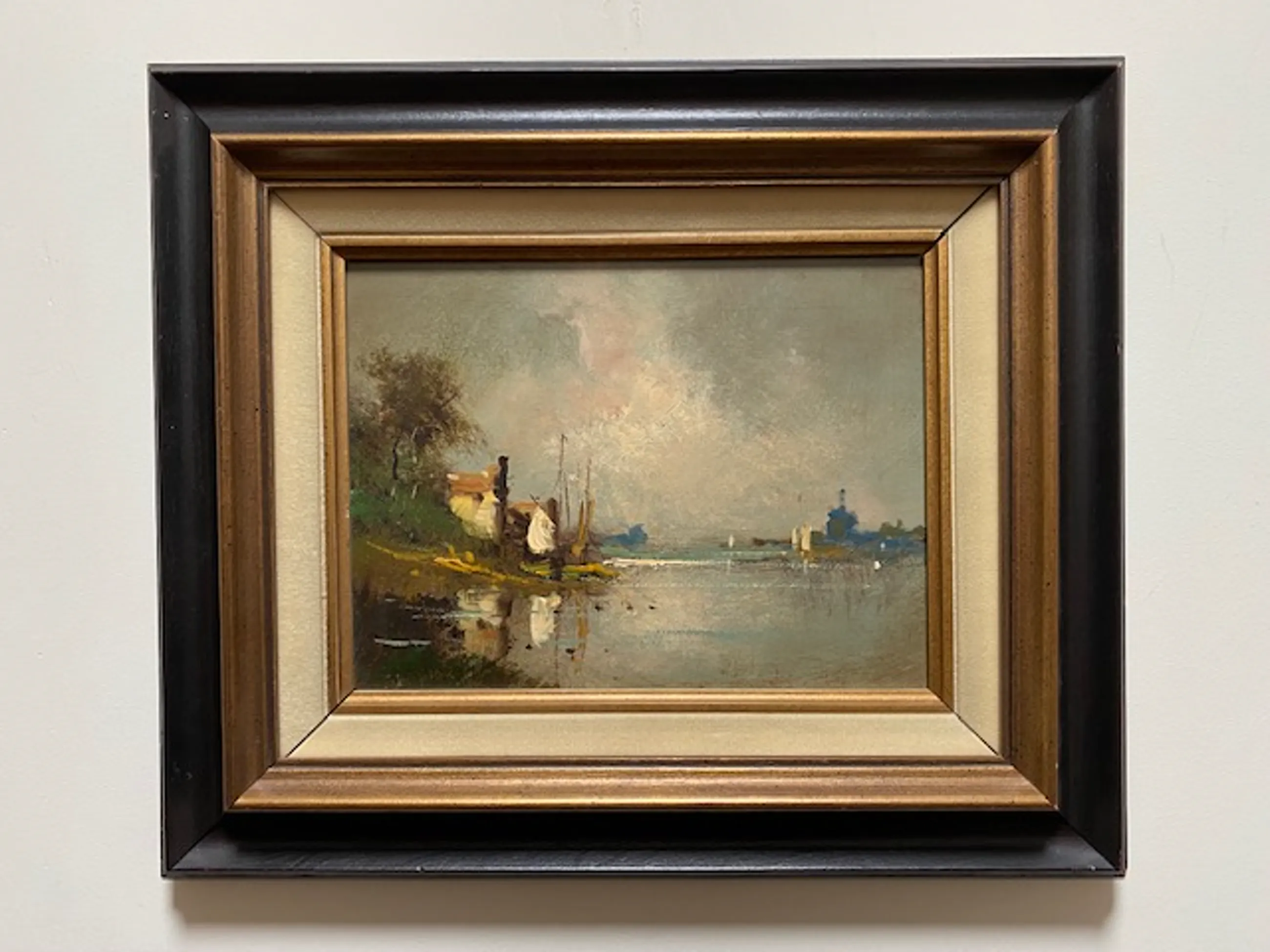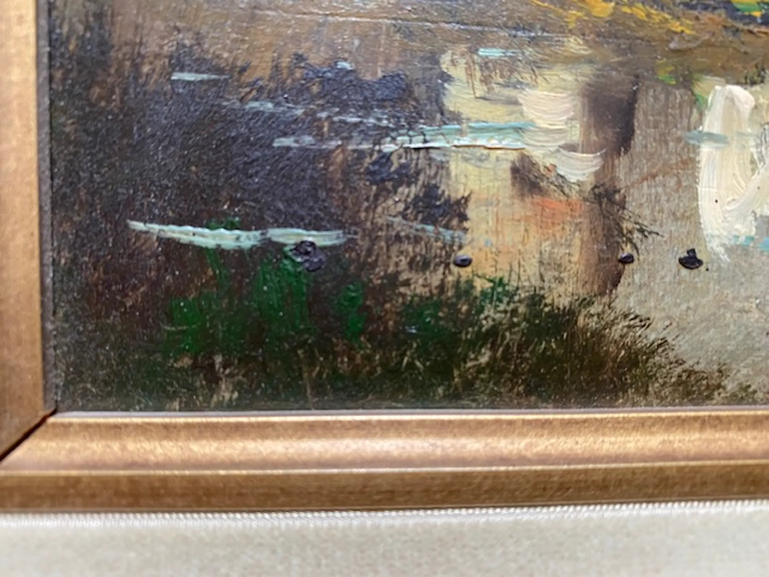 Het schilderij en de originele houten geprofileerde lijst verkeren in een redelijke staat, het is bijna "fijn"geschilderd en de kleuren zijn nog vrij helder. Er zijn kleine gebruikssporen aanwezig.