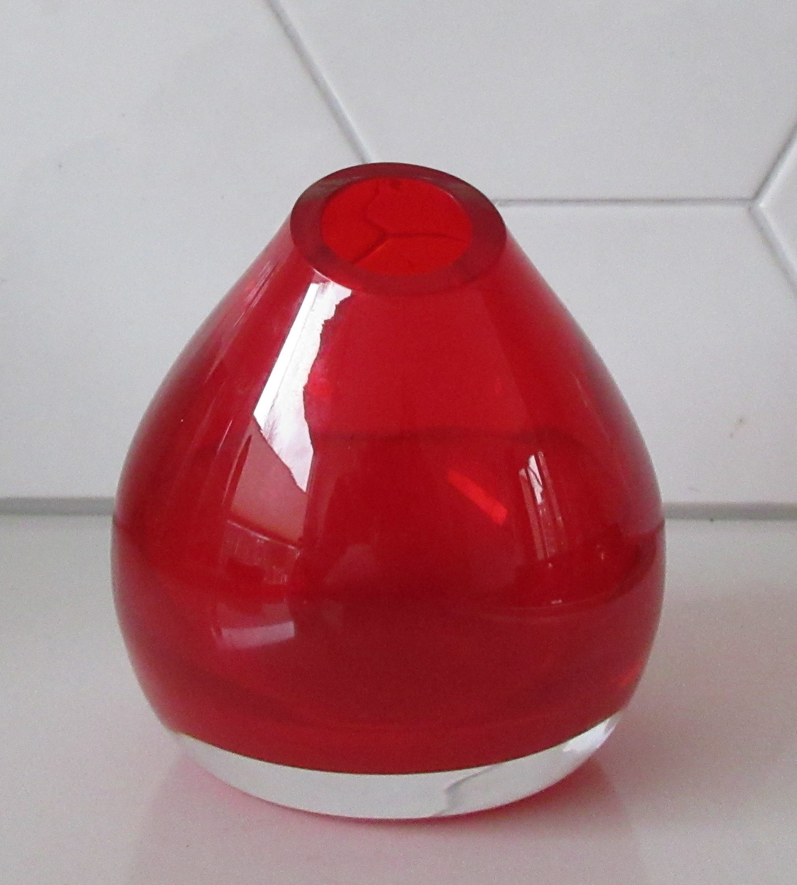 Rode dubbelwandig glazen design vaasje. Ontwerper of maker onbekend, niet gesigneerd. In prima conditie.