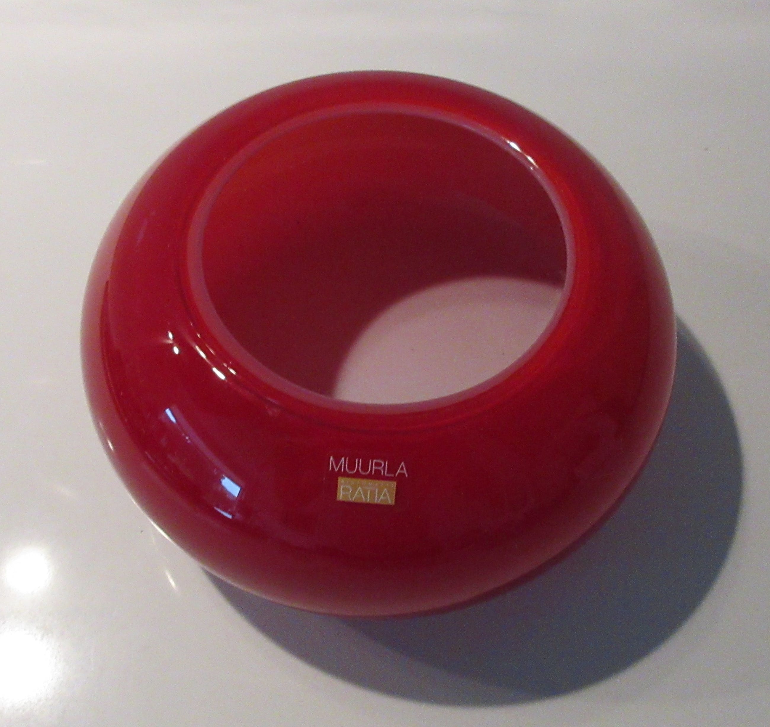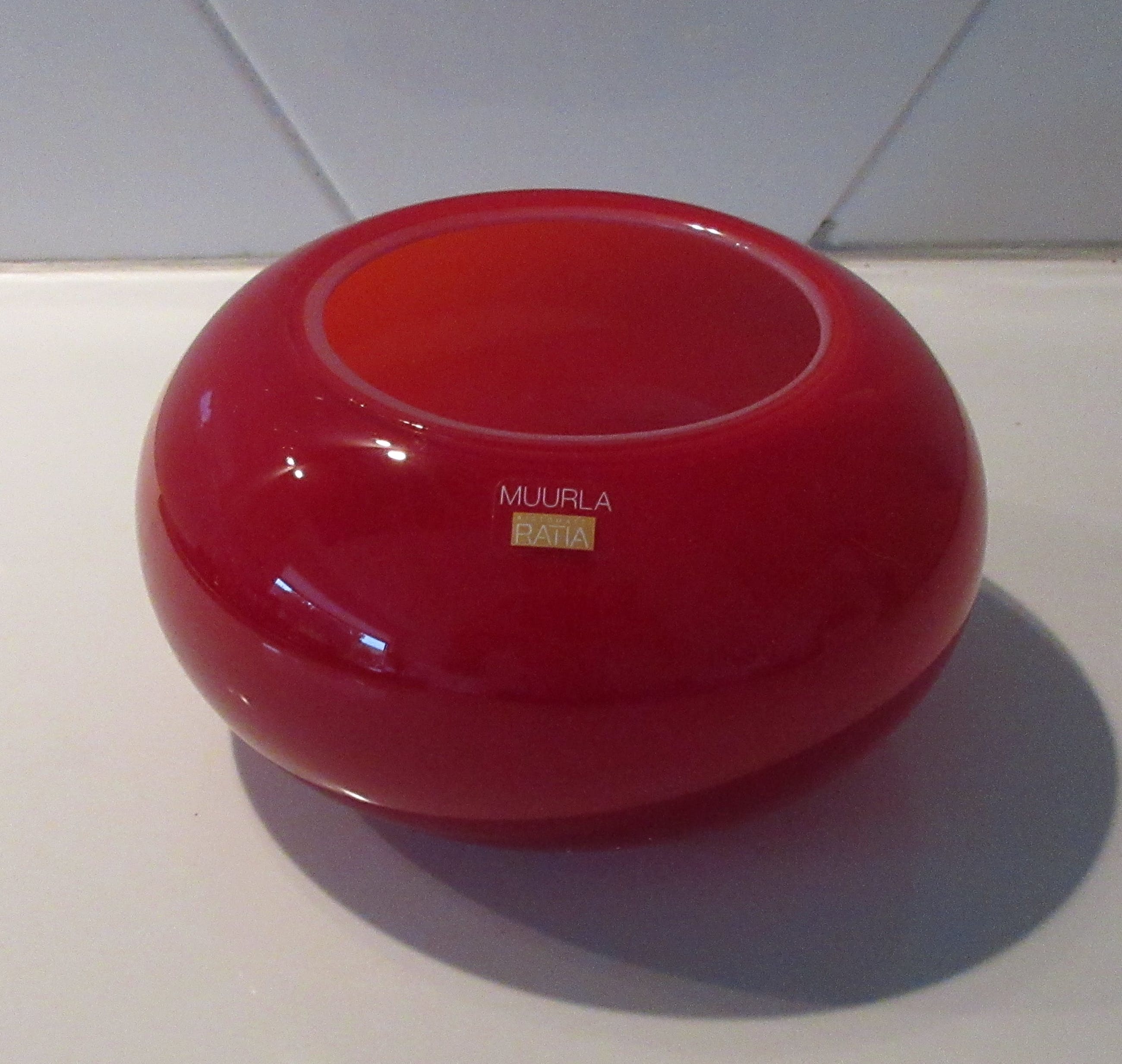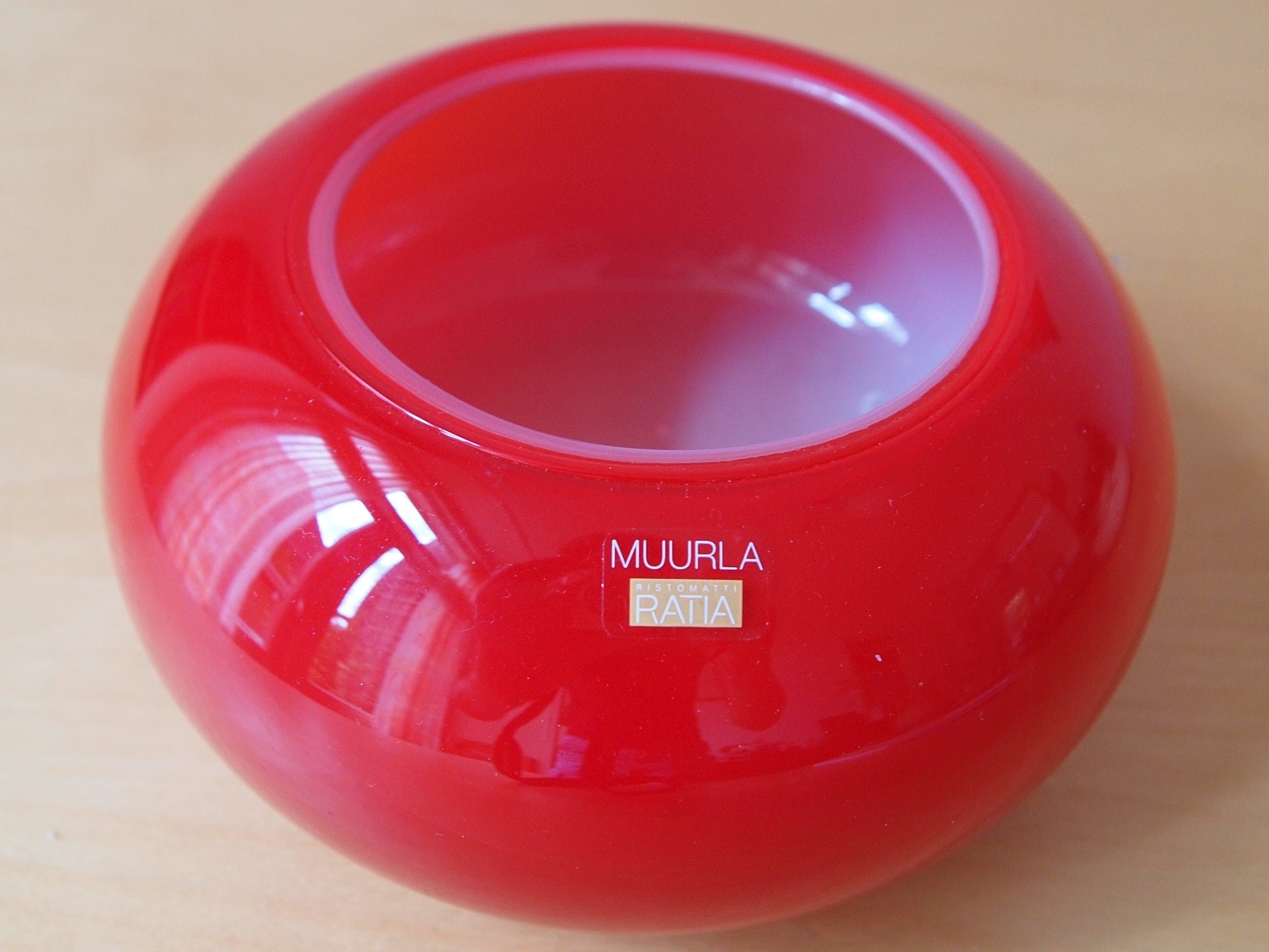 Rode opaline hand geblazen Finse kandelaar van Muurla Ratia. In prima onbeschadigde conditie en gemerkt met een sticker.