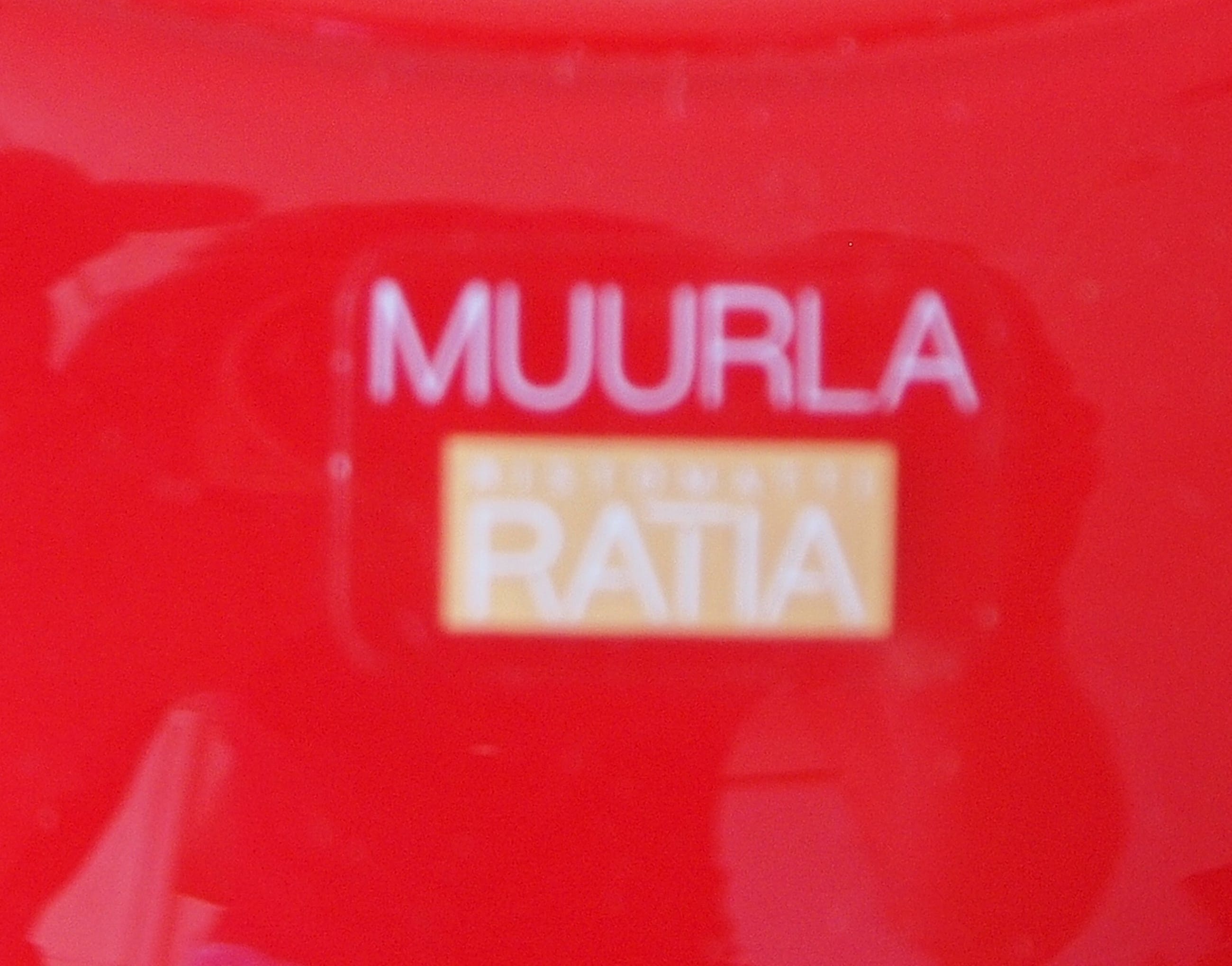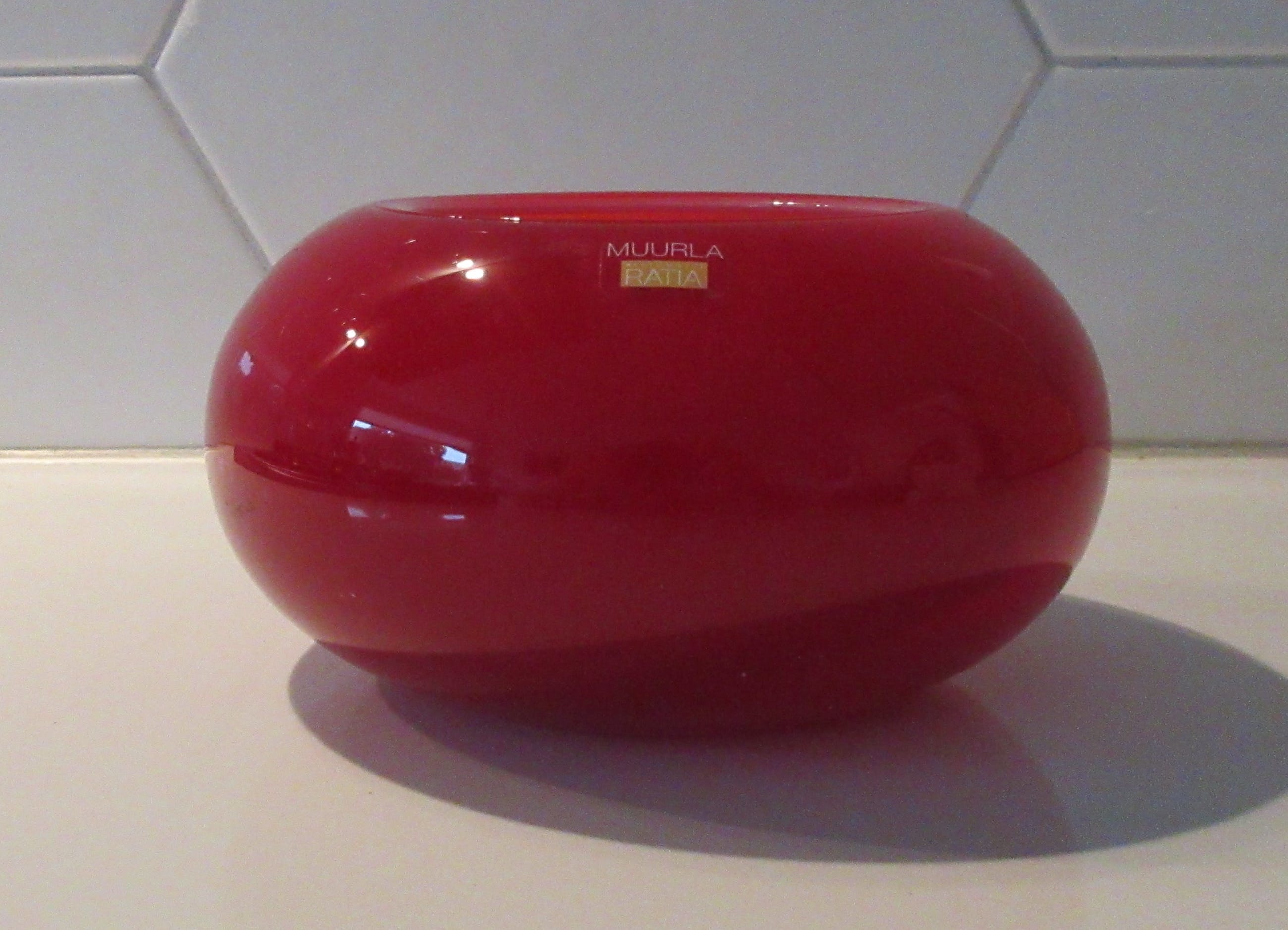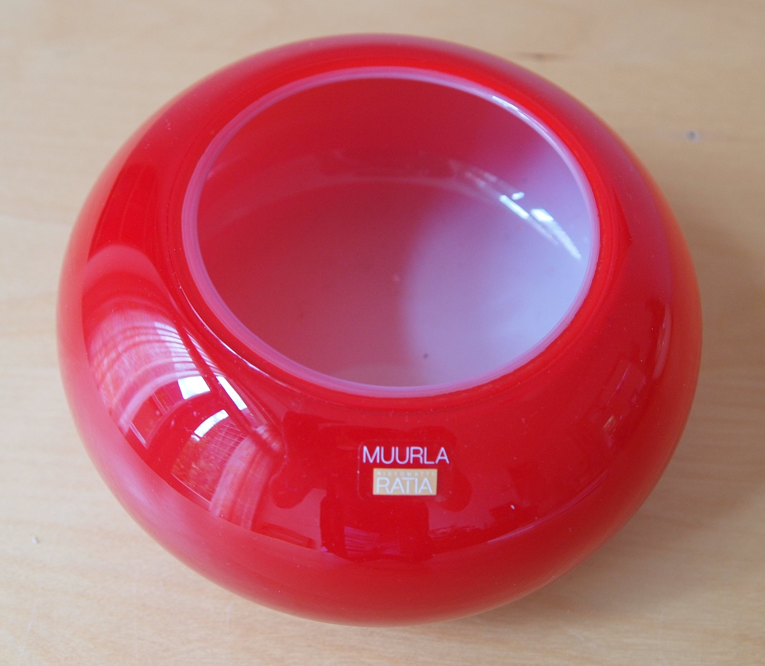 Rode opaline hand geblazen Finse kandelaar van Muurla Ratia. In prima onbeschadigde conditie en gemerkt met een sticker.