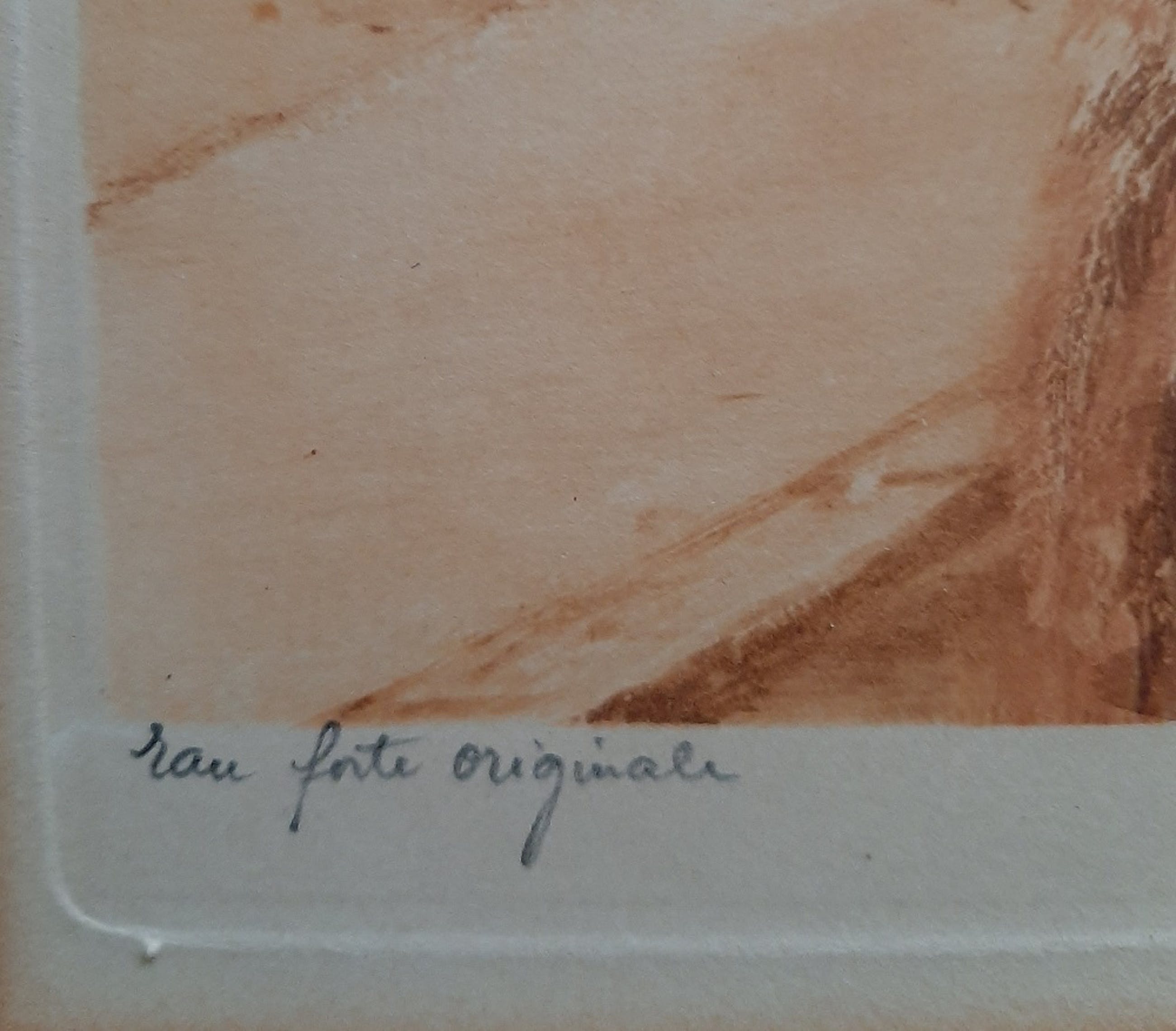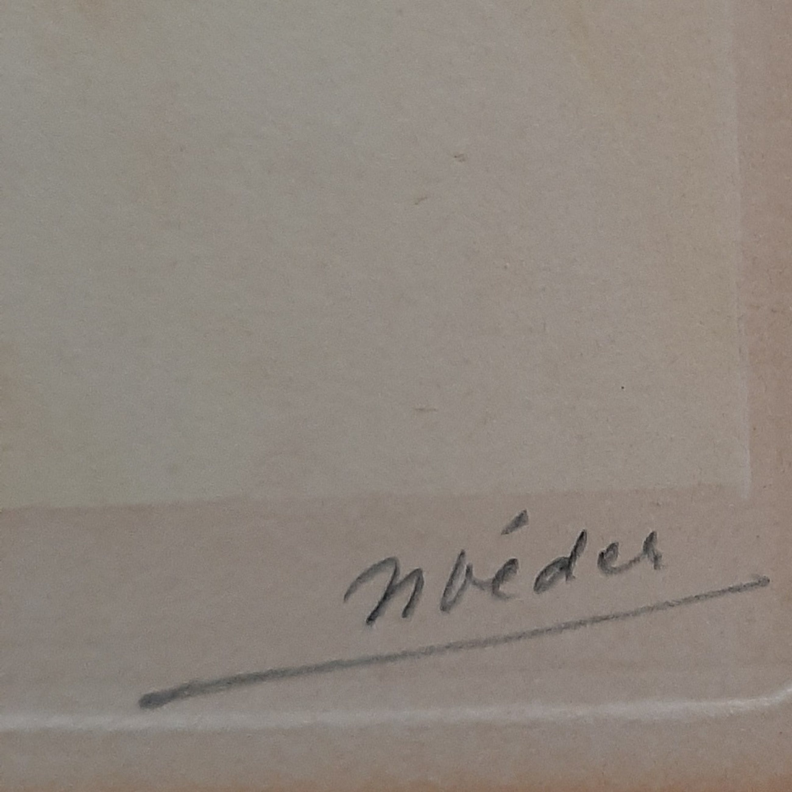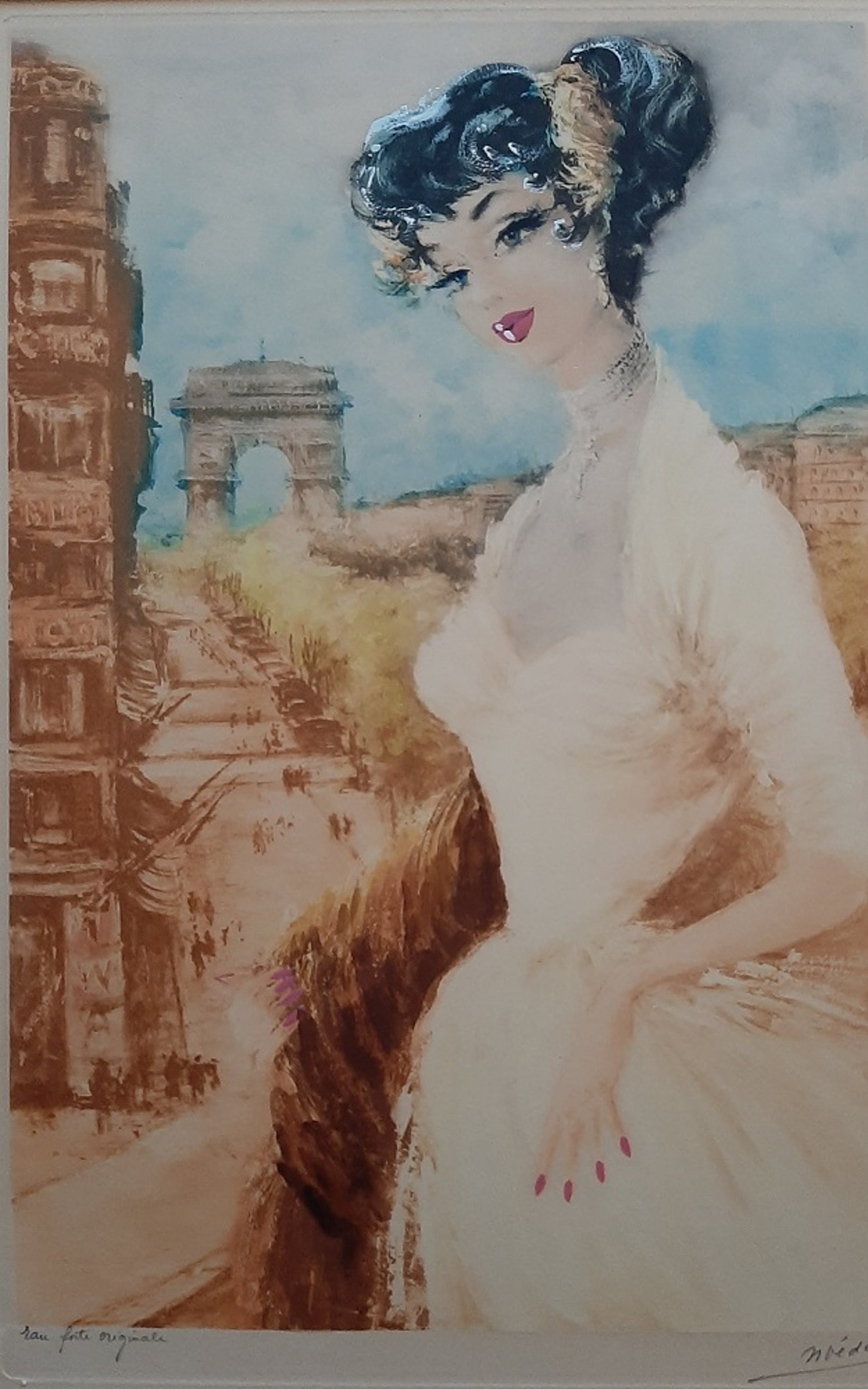 Mooie, met potlood gesigneerde ets met op de voorgrond een romantisch geklede dame op de Champs Elysee en op de achtergrond de Arc de Triomphe. Links onder: Eau forte originale en rechts onder de signatuur van de kunstenaar.