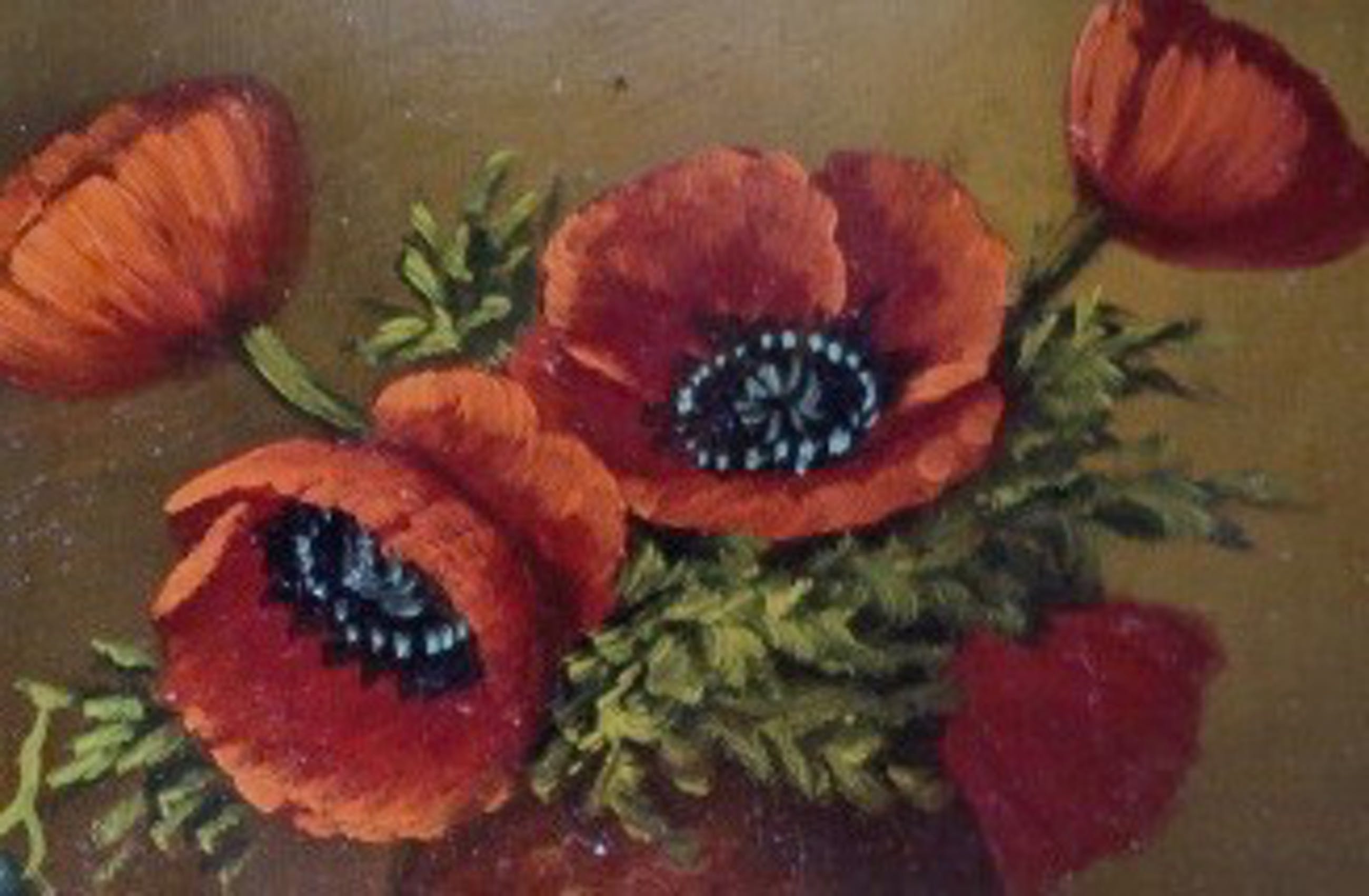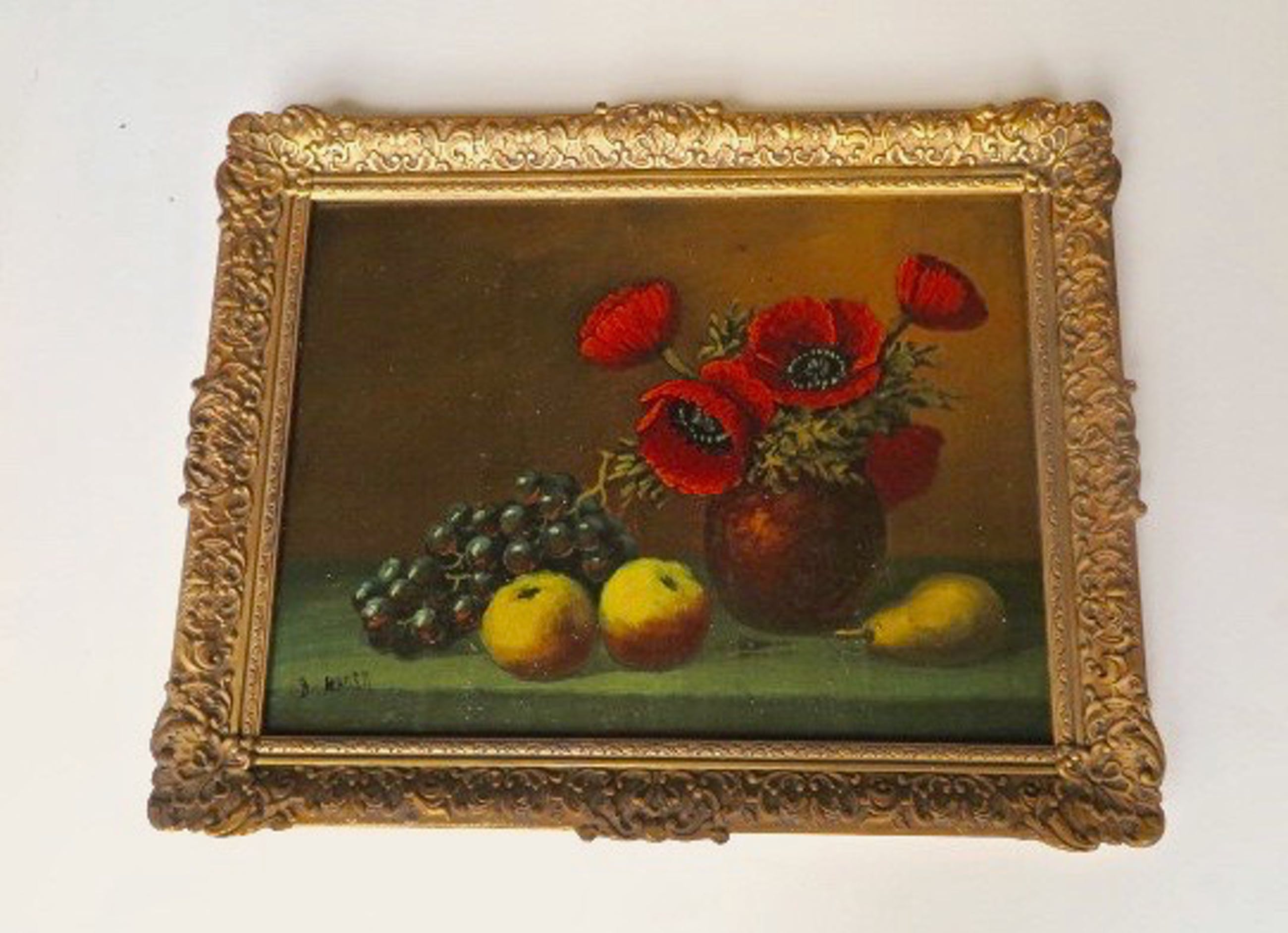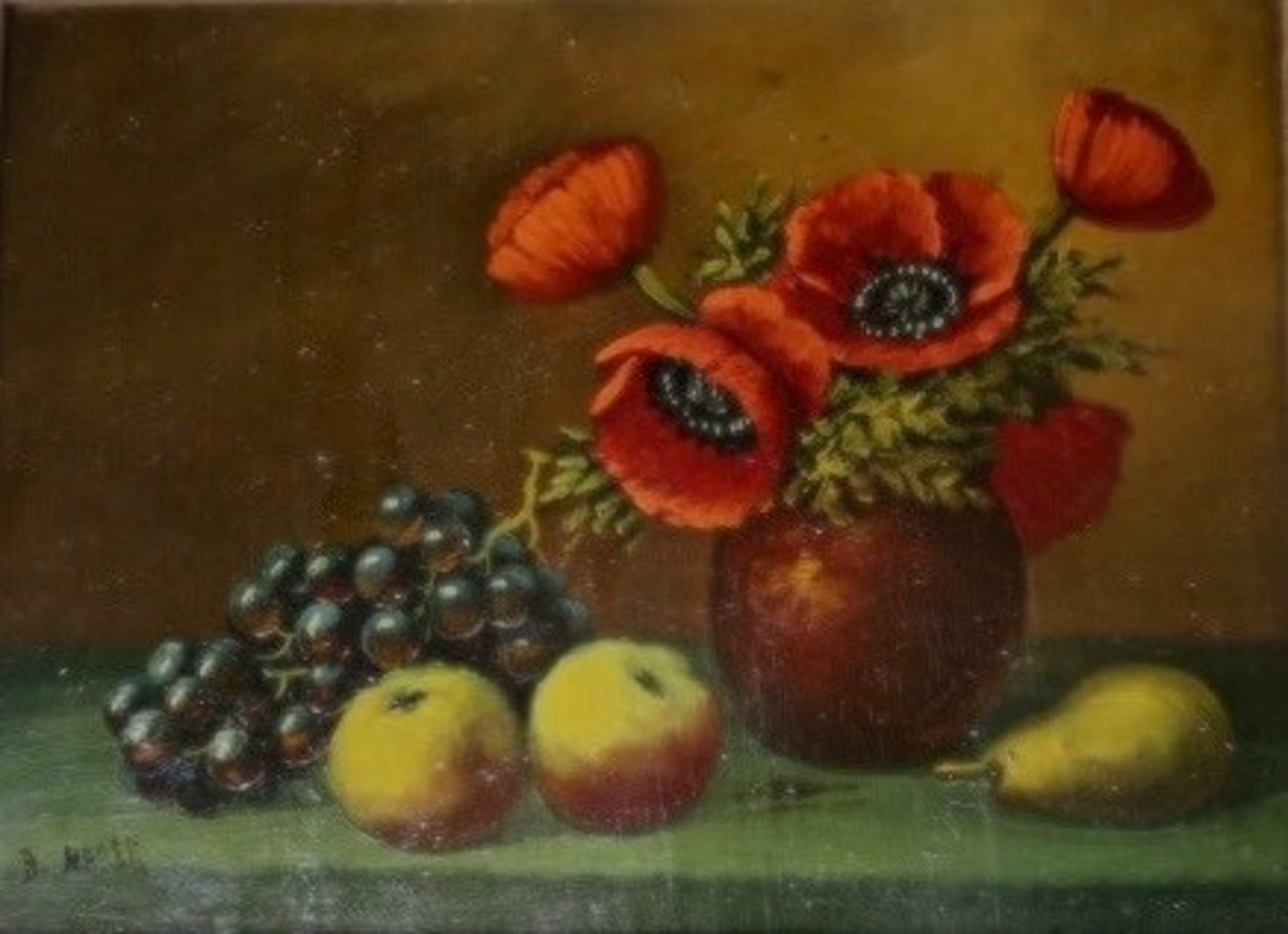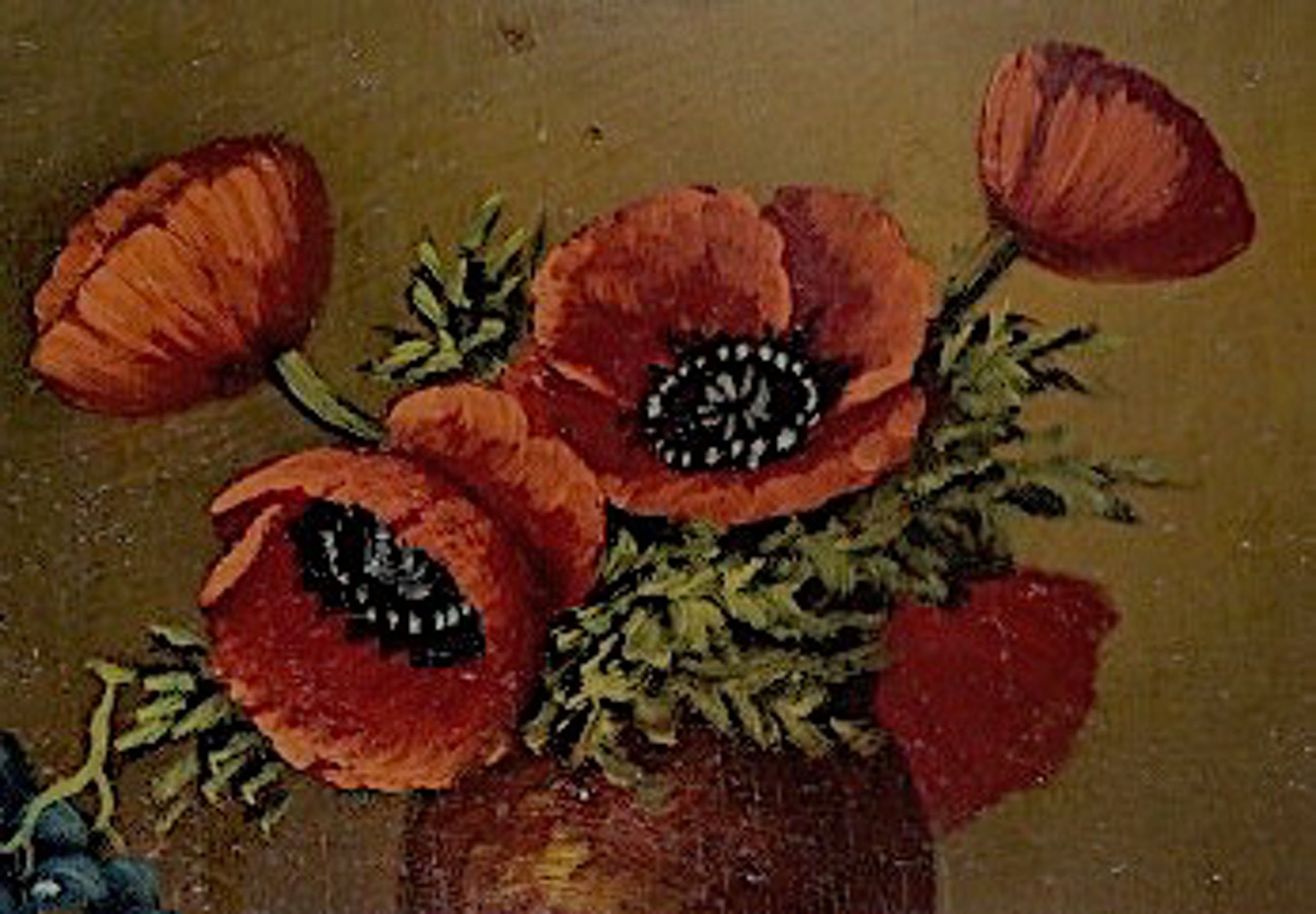 Hollandse School Stilleven met Klaprozen en Fruit Onduidelijk gesigneerd: Van Haren? Omgeving en periode Tillie Moes