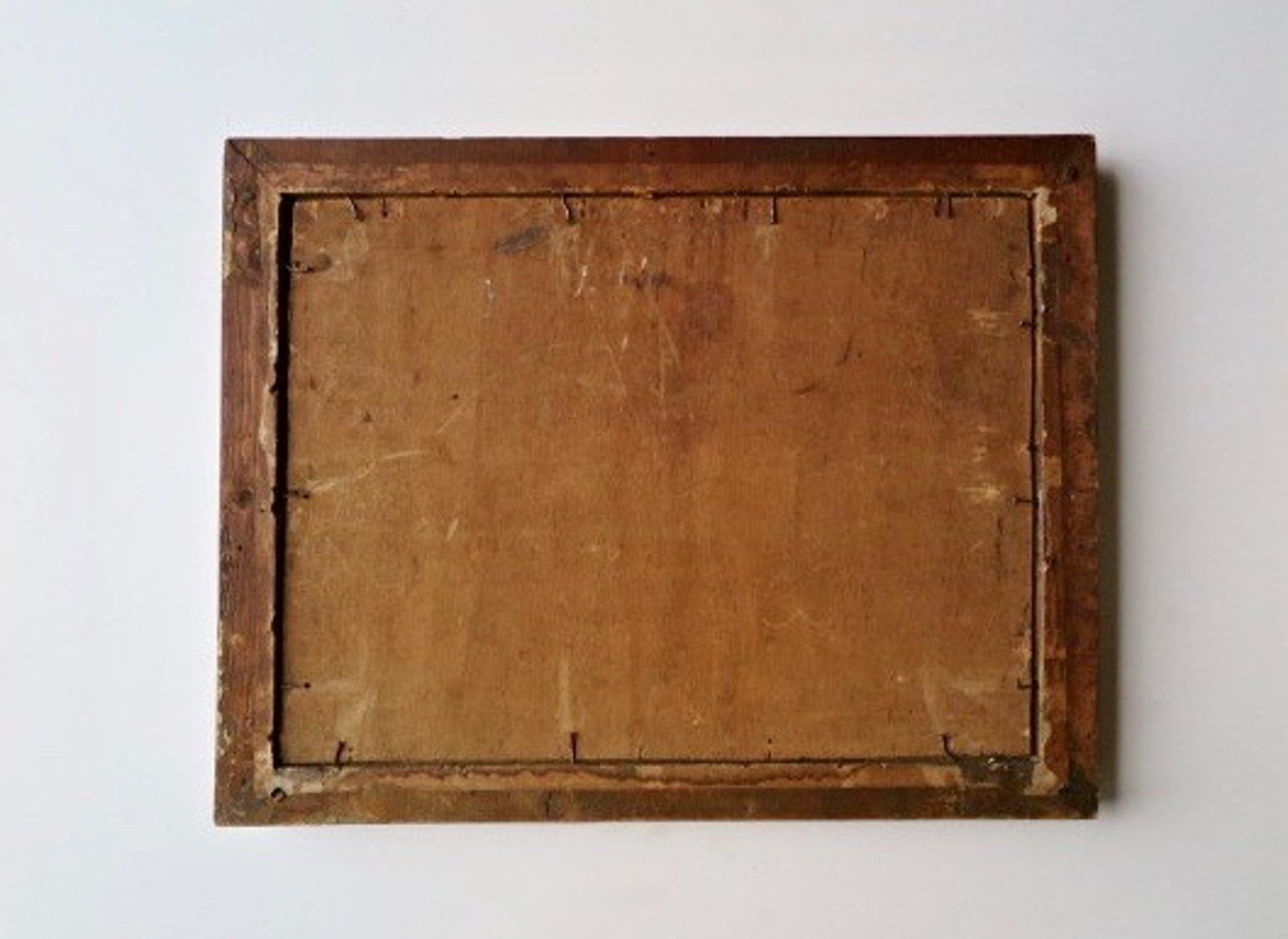 Bij bepaalde lichtinval is een lichte verticale streepstructuur zichtbaar door de verf heen. Waarschijnlijk van het onderliggende paneel, maar kan ook veroorzaakt zijn door het aanbrengen van vernis met een kwast.
