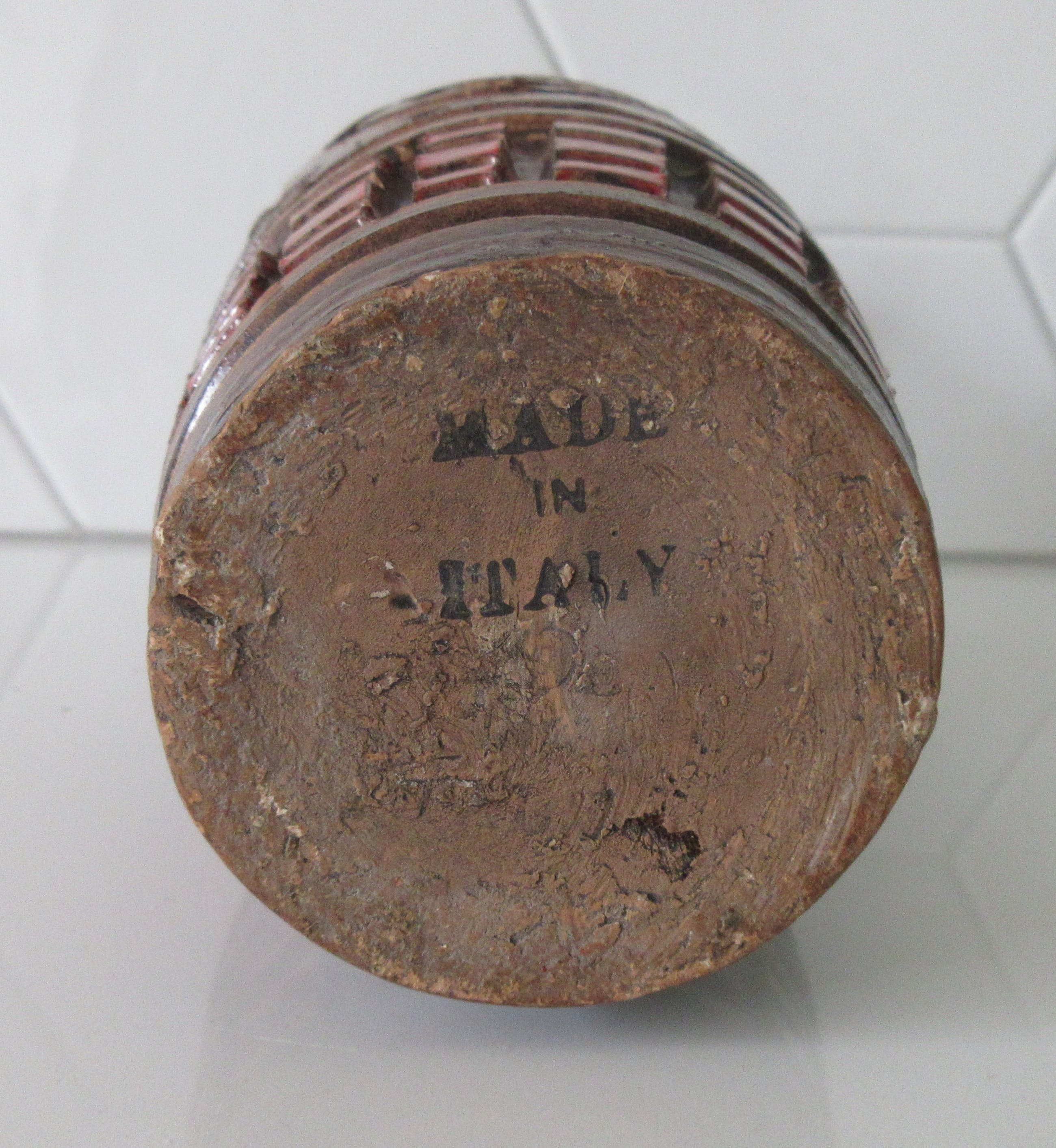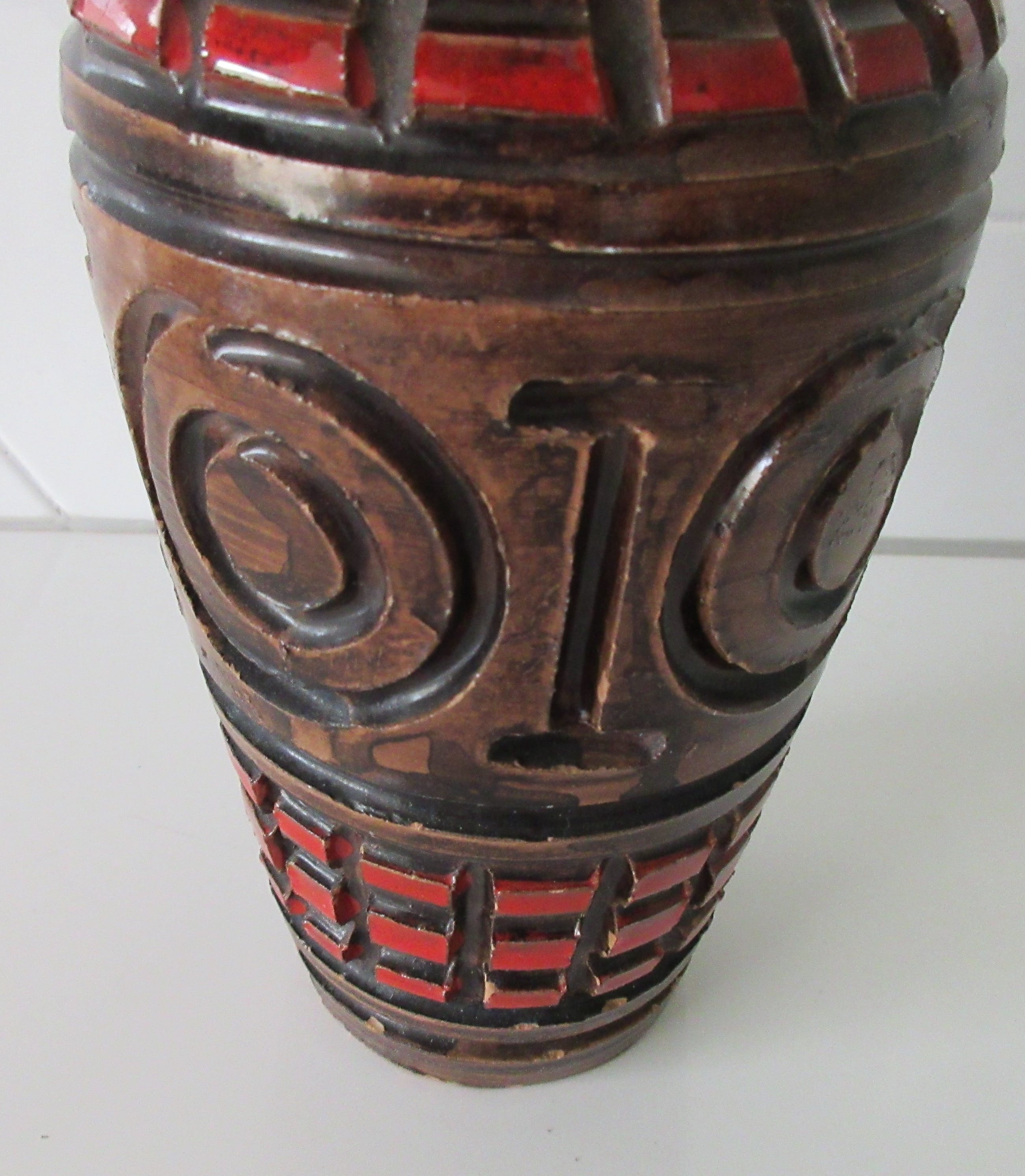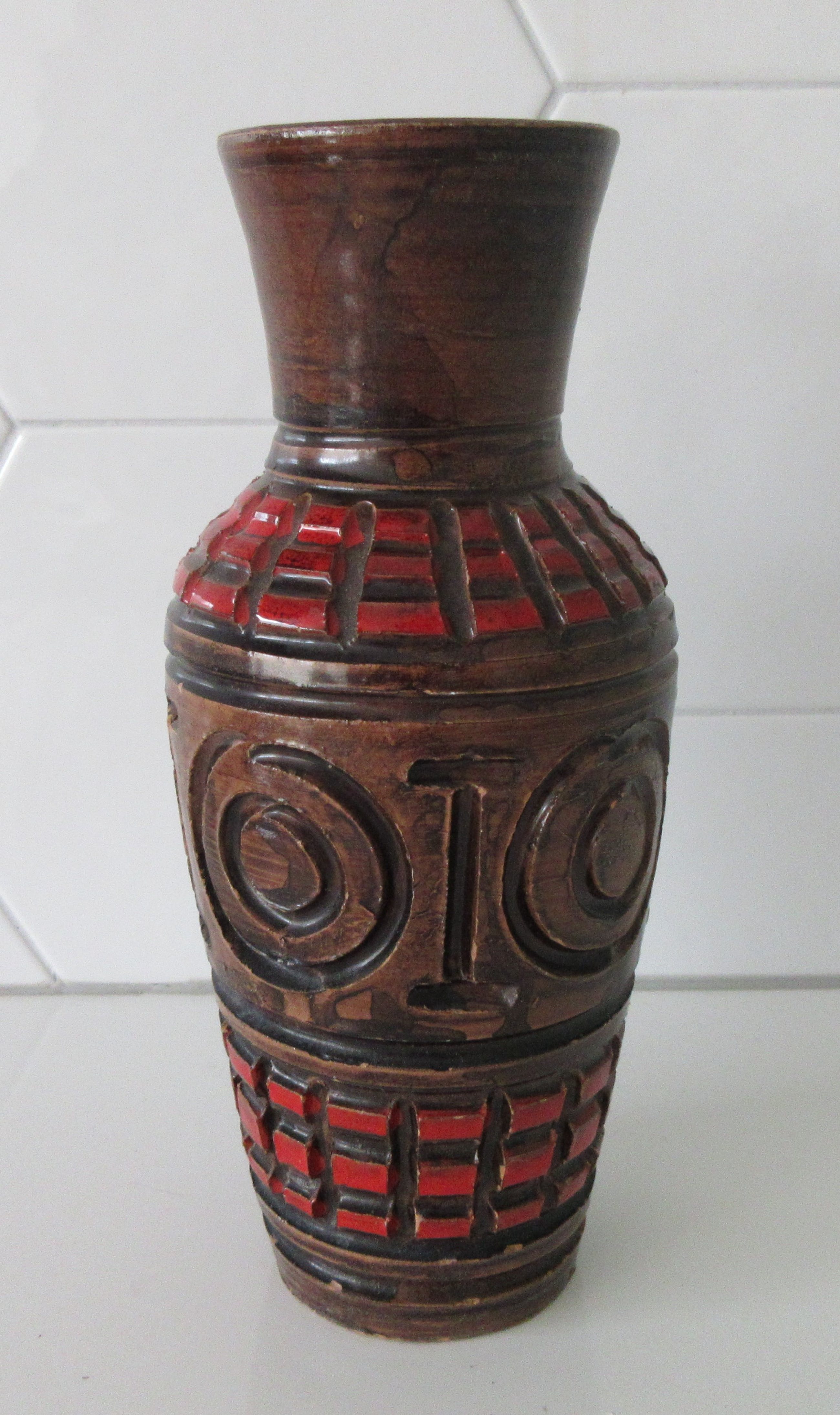 Rood bruine Italiaanse vintage aardewerken Sgraffito vaas. Het sgraffito decor is erg diep ingesneden, er zijn daardoor meerdere glazuur flinters door gebruik. Maker of ontwerper onbekend. Mogelijk Bitossi of Fratelli Fanciulacci. De vaas is gemerkt Made in Italy op de onderzijde.