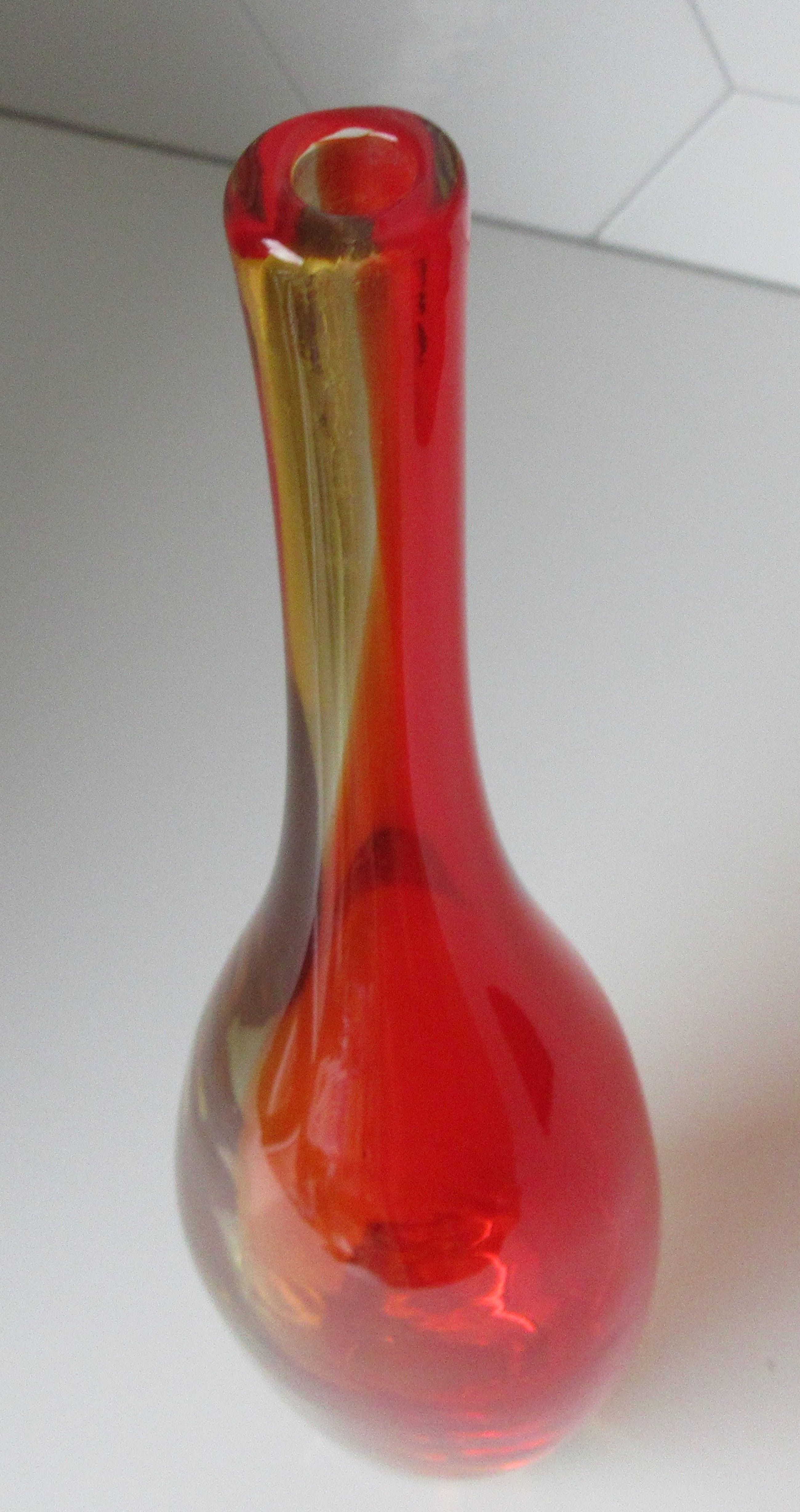 Mooie dikwandig rood gele en blankglazen Flesvaas voorzien van een gepolijst pontil merk. Herkomst onduidelijk, mogelijk Italie. In prima conditie, alleen wat gebruikskrasjes op de voet. Niet gemerkt.
