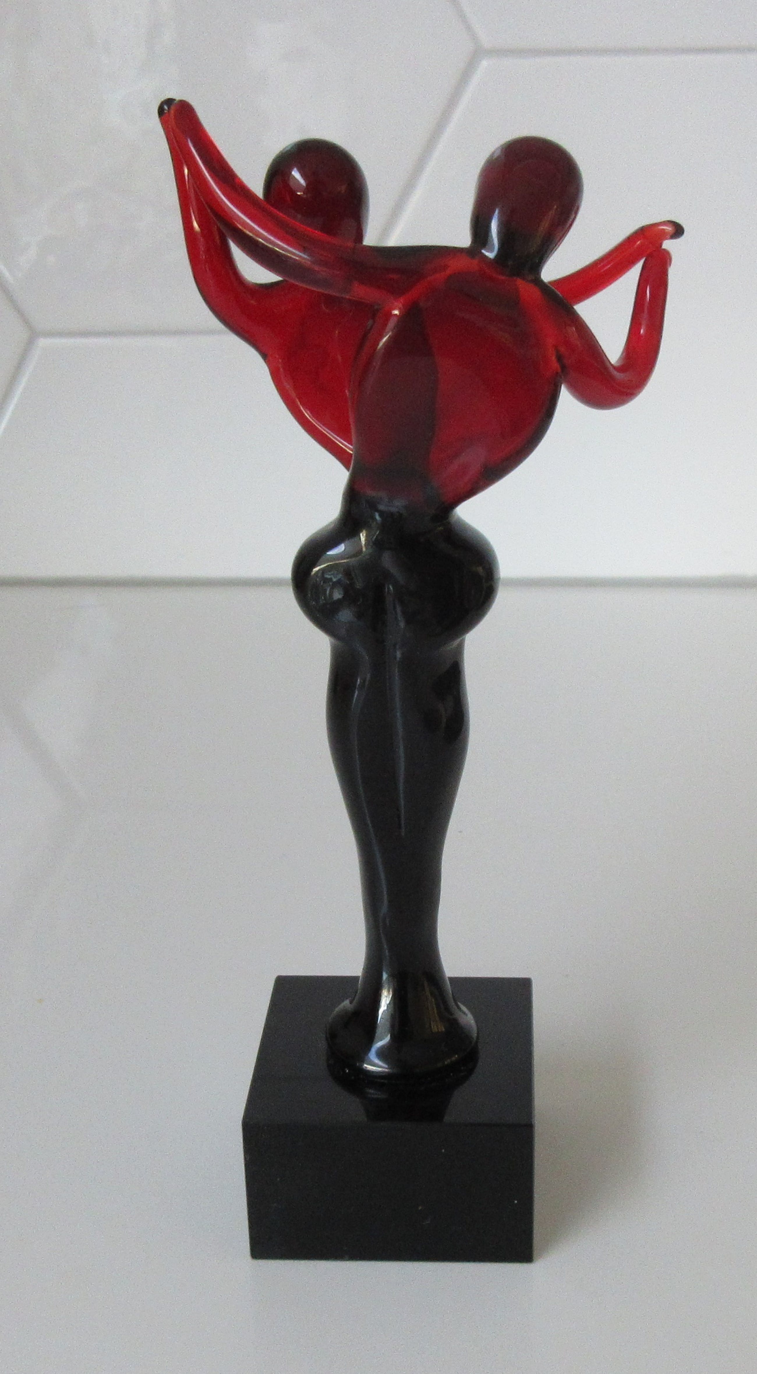 Mooi bordeaux rood glazen sculptuur op zwart glazen voet van een verliefd stel dat elkaar innig vasthoudt en met elkaar versmolten is.. In prima conditie, niet gemerkt.