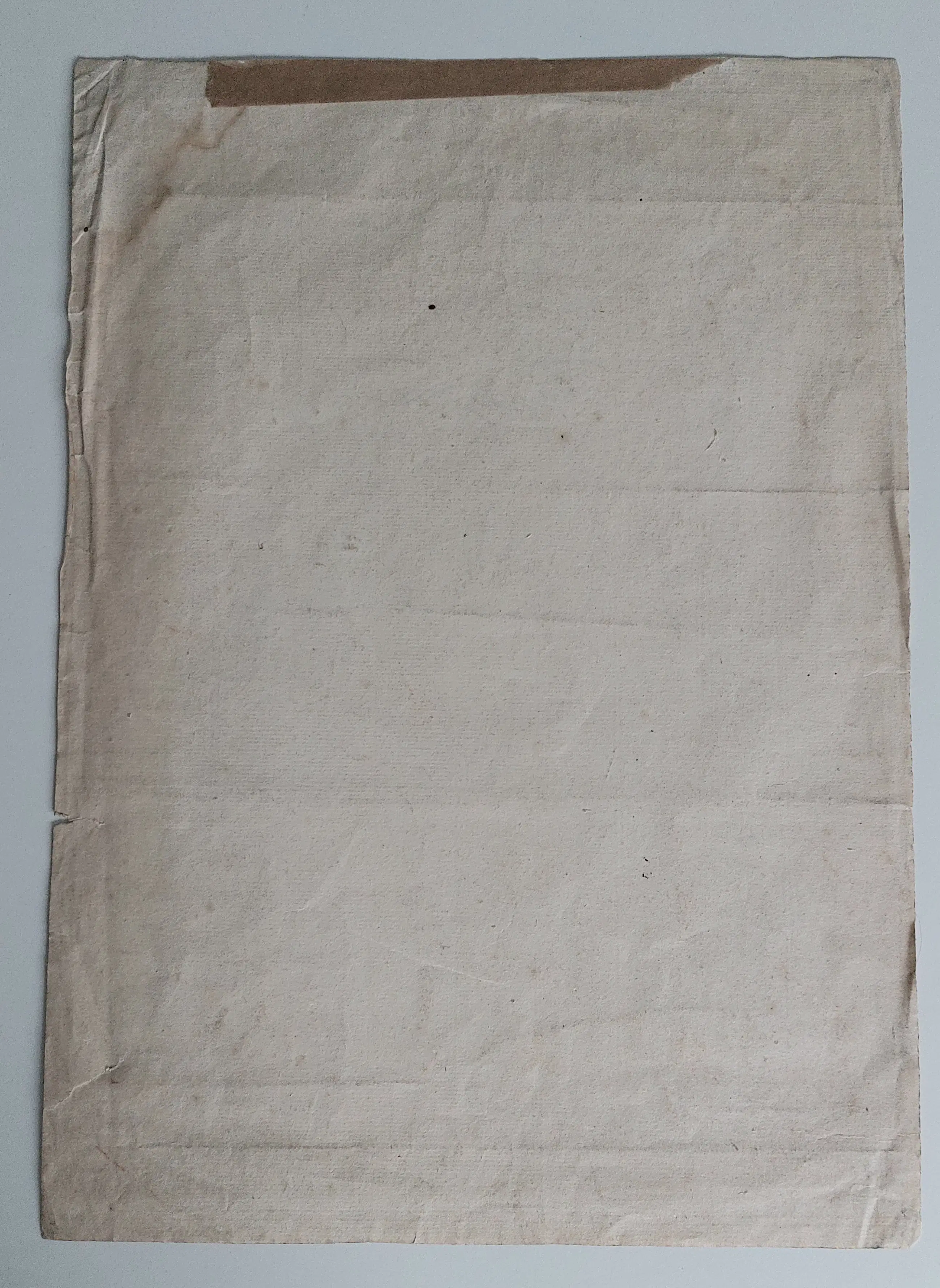 De krijtekening zelf ziet er nog strak en helder uit. Gezien de ouderdom is de conditie van het papier redelijk, rechtsonder twee kleine scheurtjes ( 1cm / 2 cm )in het papier, hoek linksonder en - boven resten van plakkertjes, rechtsboven resten van vochtschade.