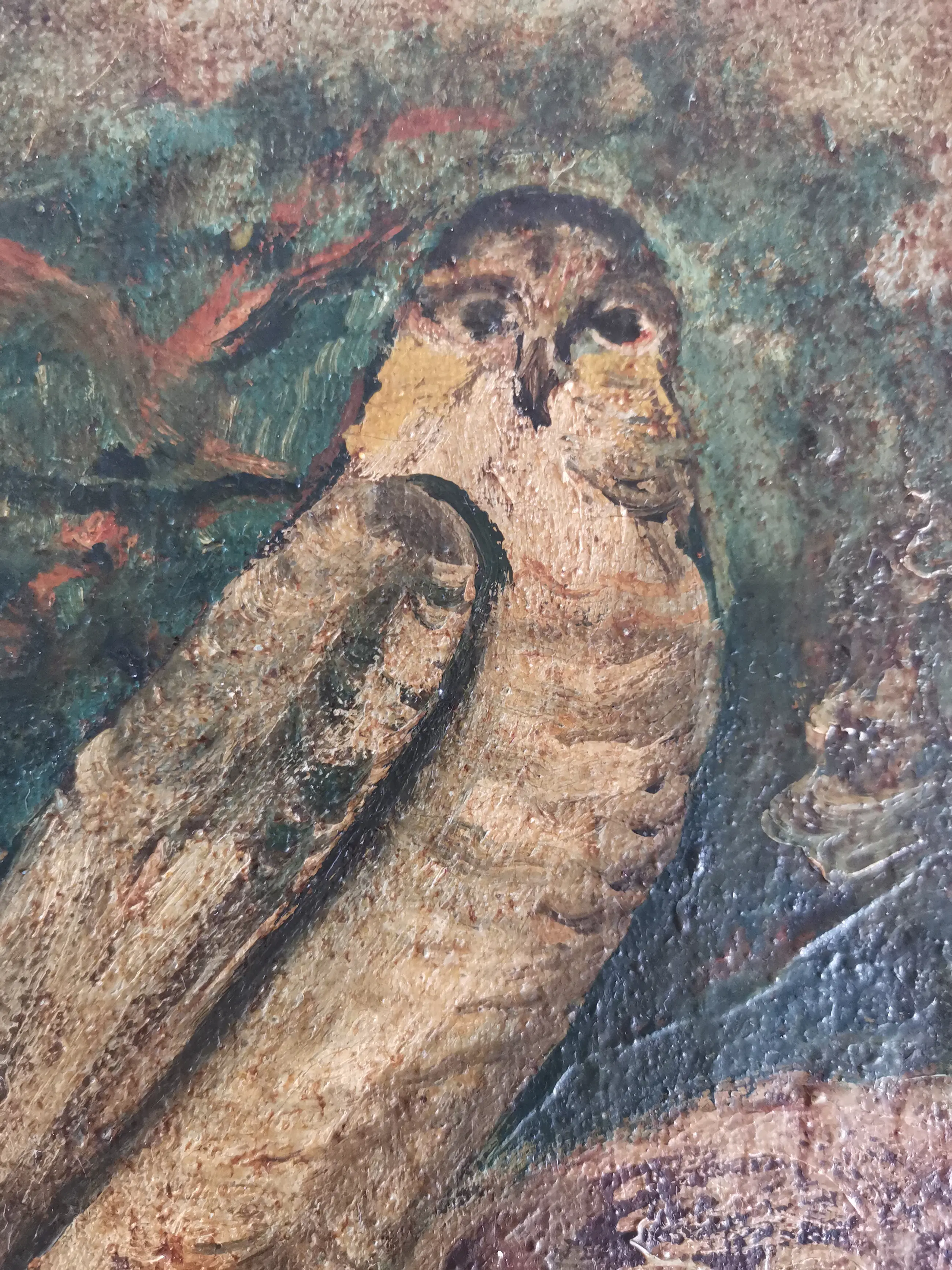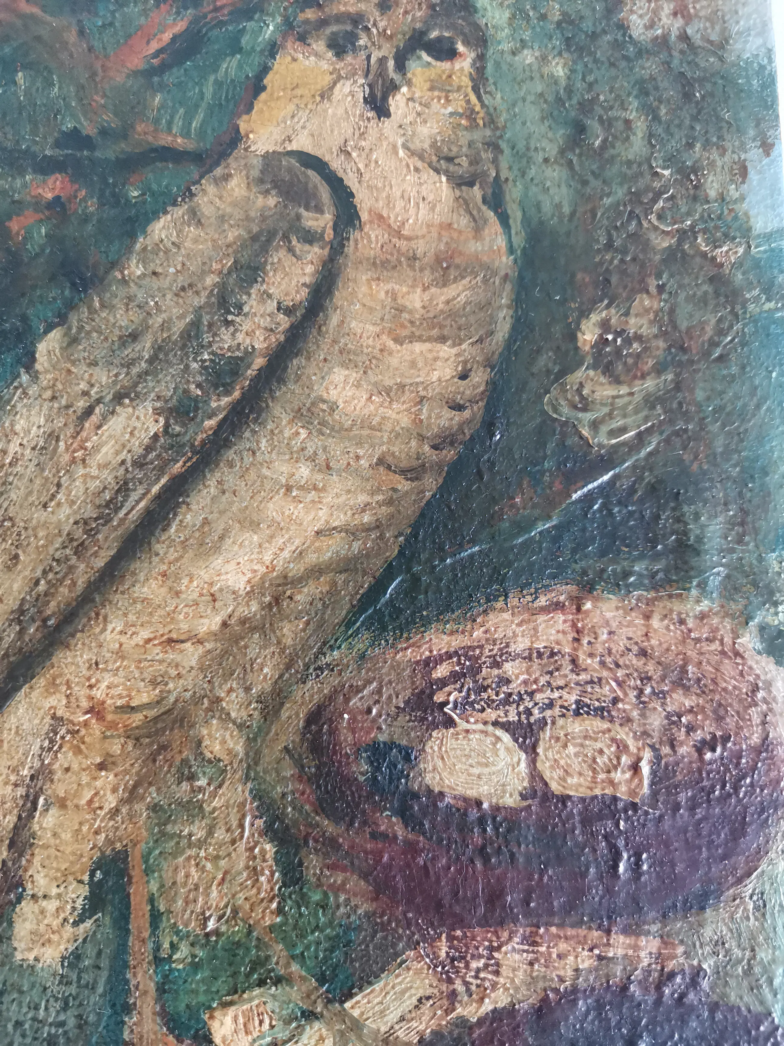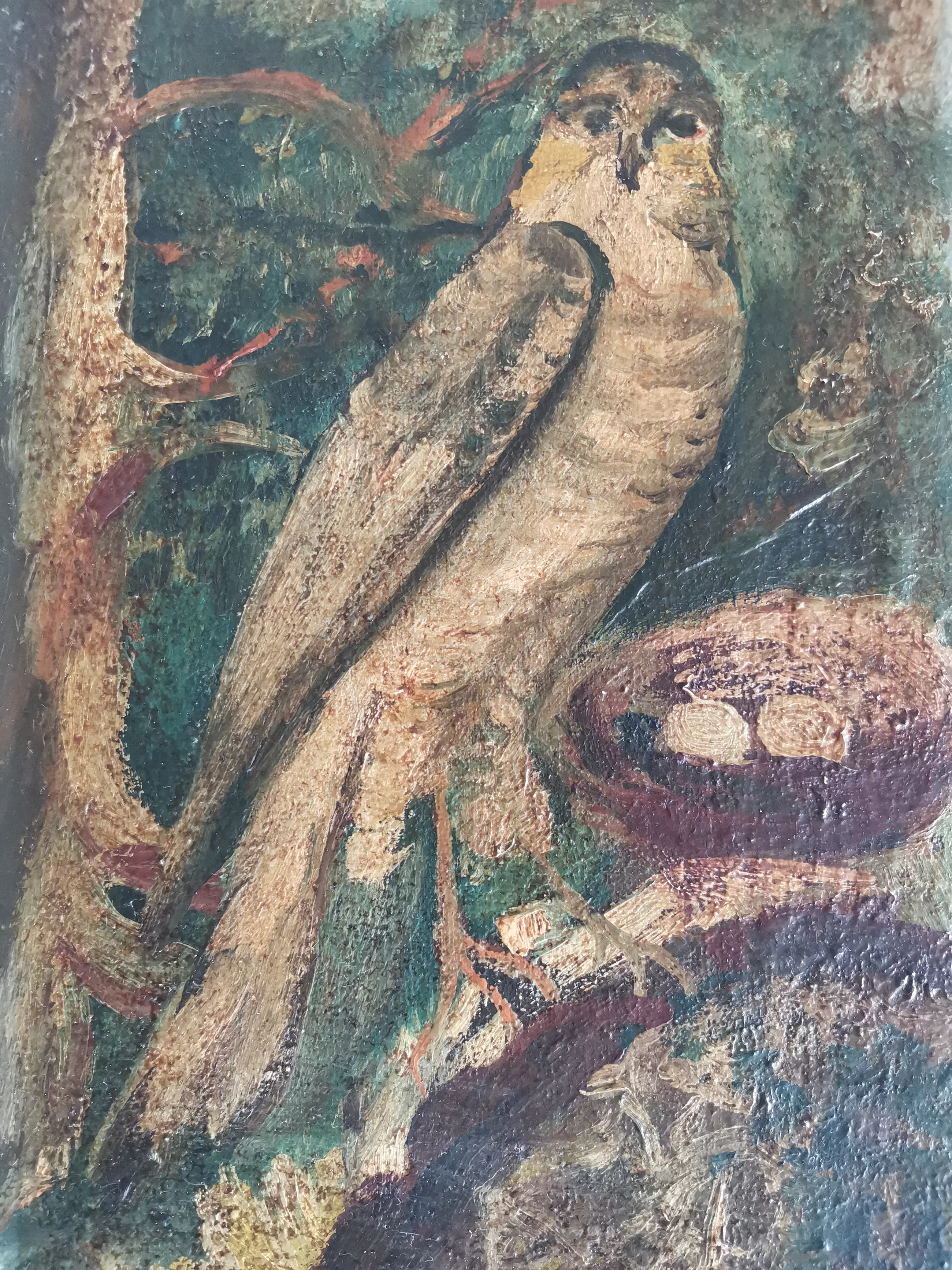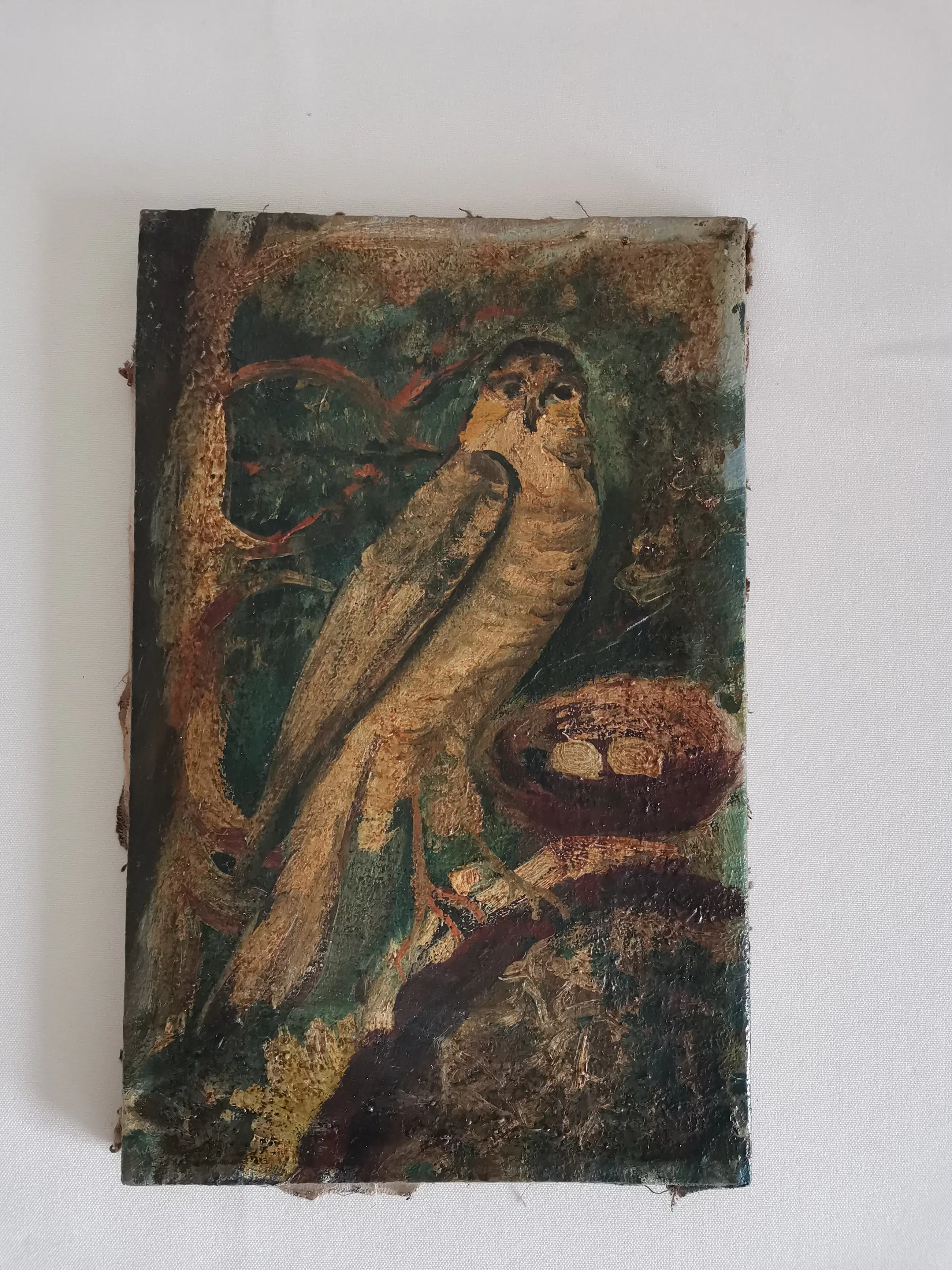 Zeer mooi en oud schilderij van een roofvogel bij zijn n'est met eieren. Dit werk is handgesigneerd onderaan links, maar door de ouderdom onleesbaar geworden. Het schilderij is olieverf op doek. De verfstructuur is zeer goed en de kleuren realistisch. Dit werk is zeer oud maar in goede staat. Het werk is 28 cm hoog en 18 cm breed. Het schilderij is niet ingelijst. Word aangetekend en verzekerd Verzonden.
