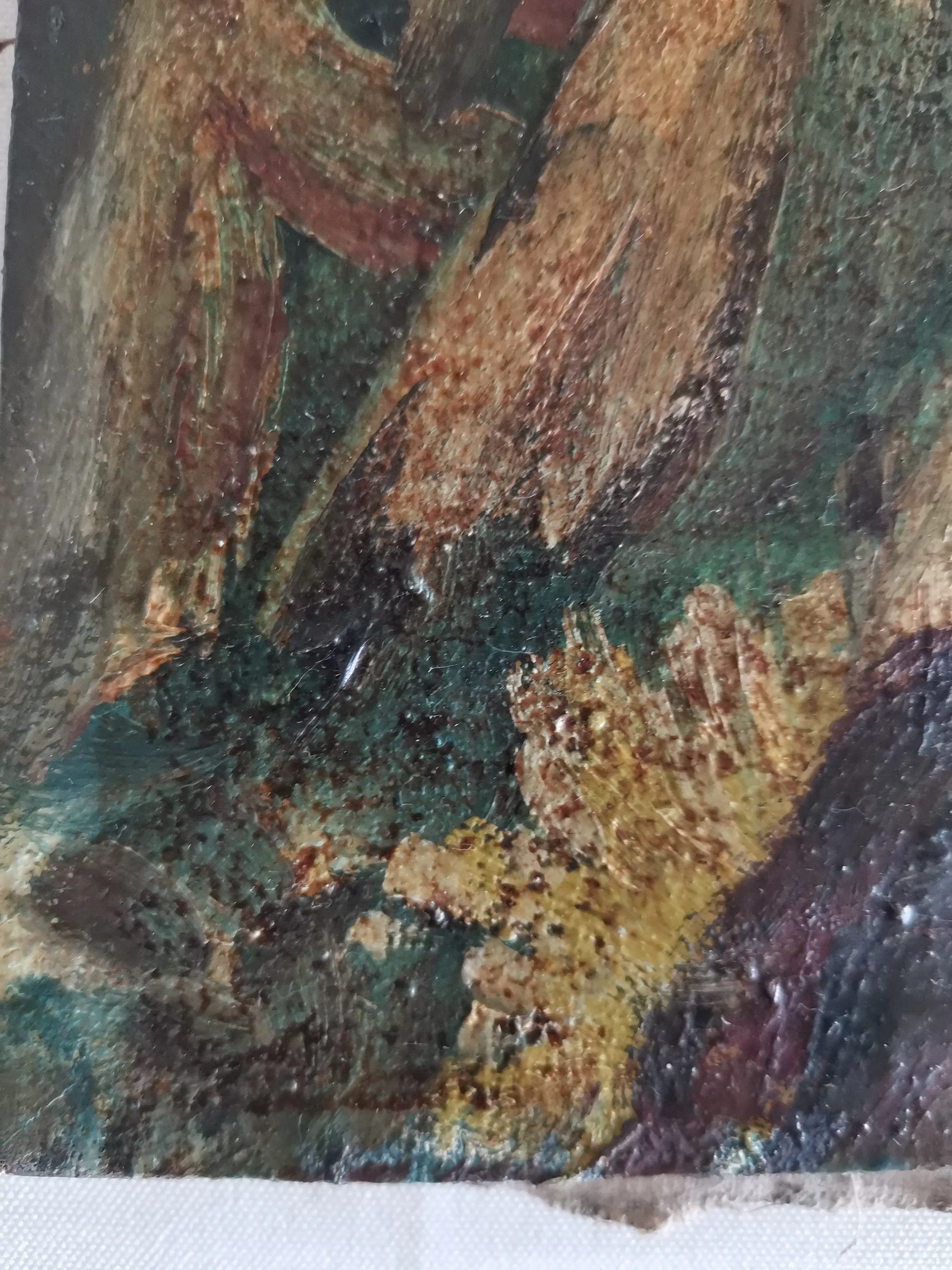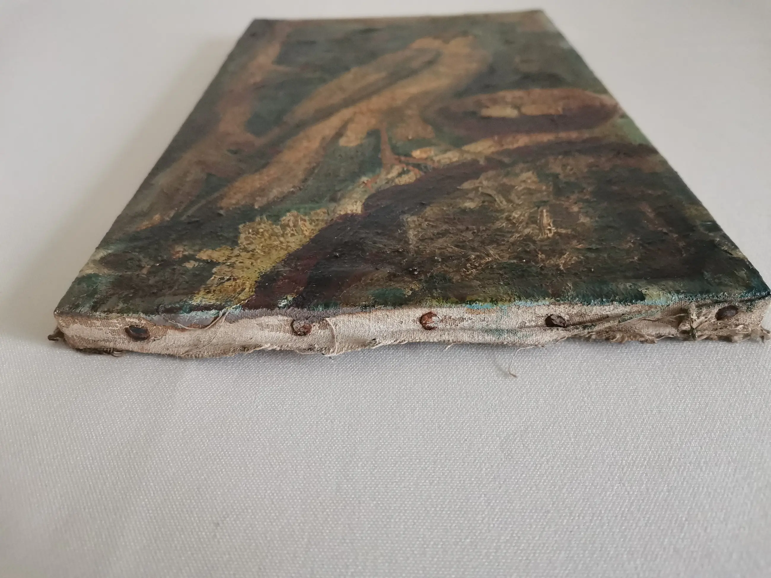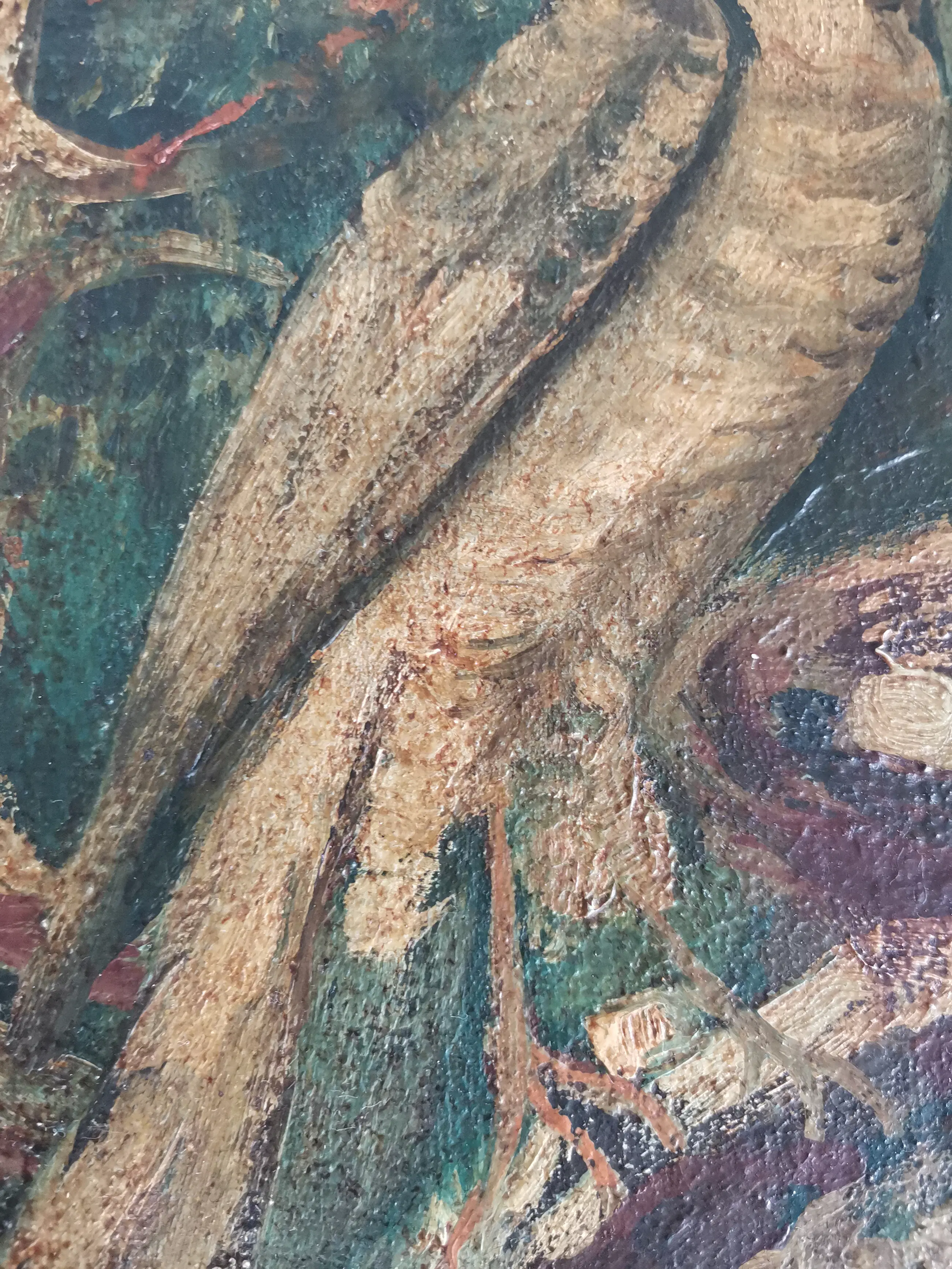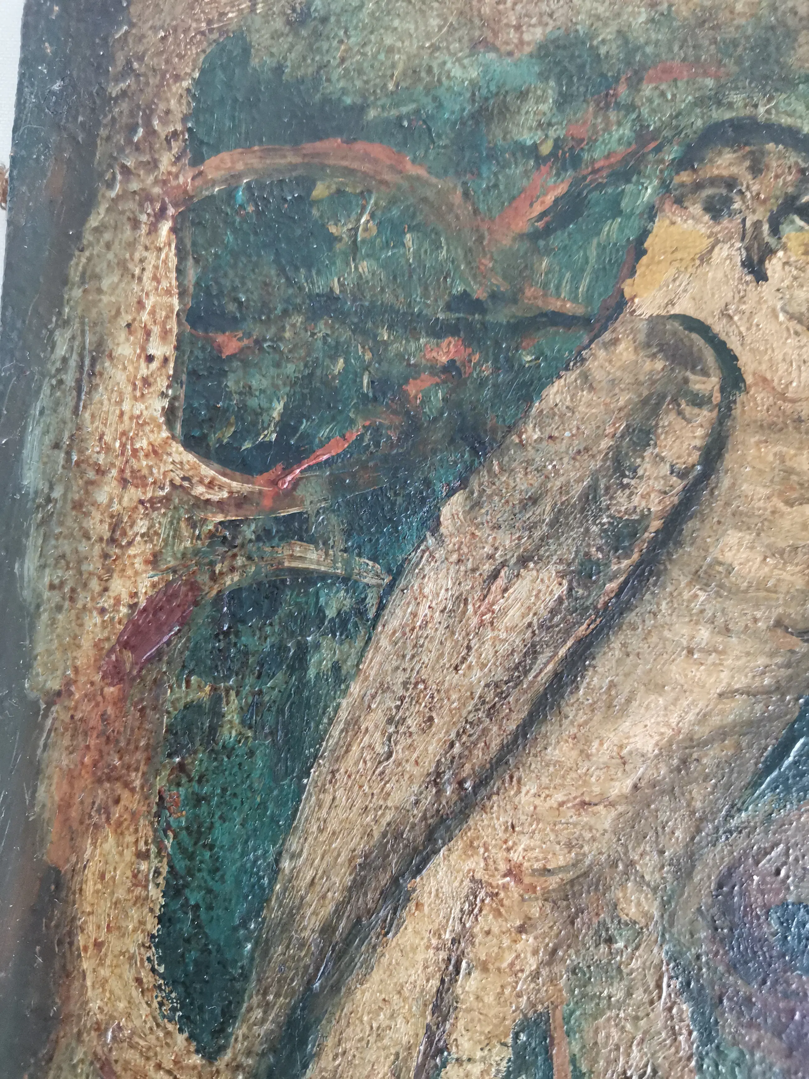 Zeer mooi en oud schilderij van een roofvogel bij zijn n'est met eieren. Dit werk is handgesigneerd onderaan links, maar door de ouderdom onleesbaar geworden. Het schilderij is olieverf op doek. De verfstructuur is zeer goed en de kleuren realistisch. Dit werk is zeer oud maar in goede staat. Het werk is 28 cm hoog en 18 cm breed. Het schilderij is niet ingelijst. Word aangetekend en verzekerd Verzonden.