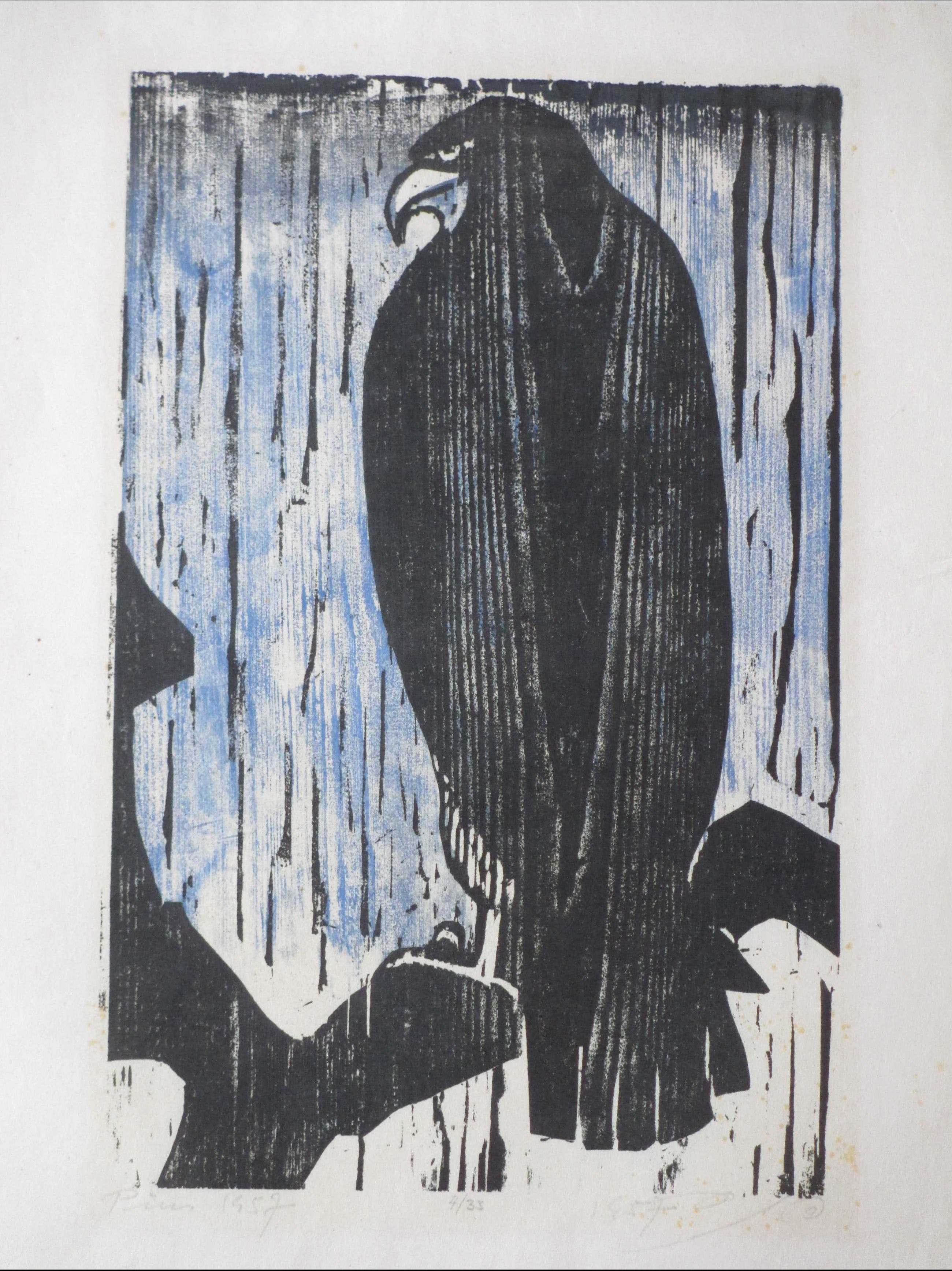 Onbekend - Roofvogel op een tak - Kleurenhoutsnede - Verkocht