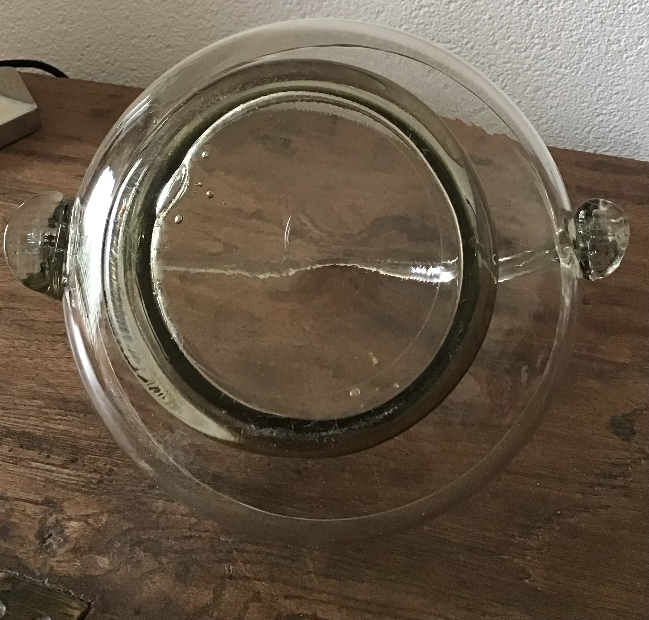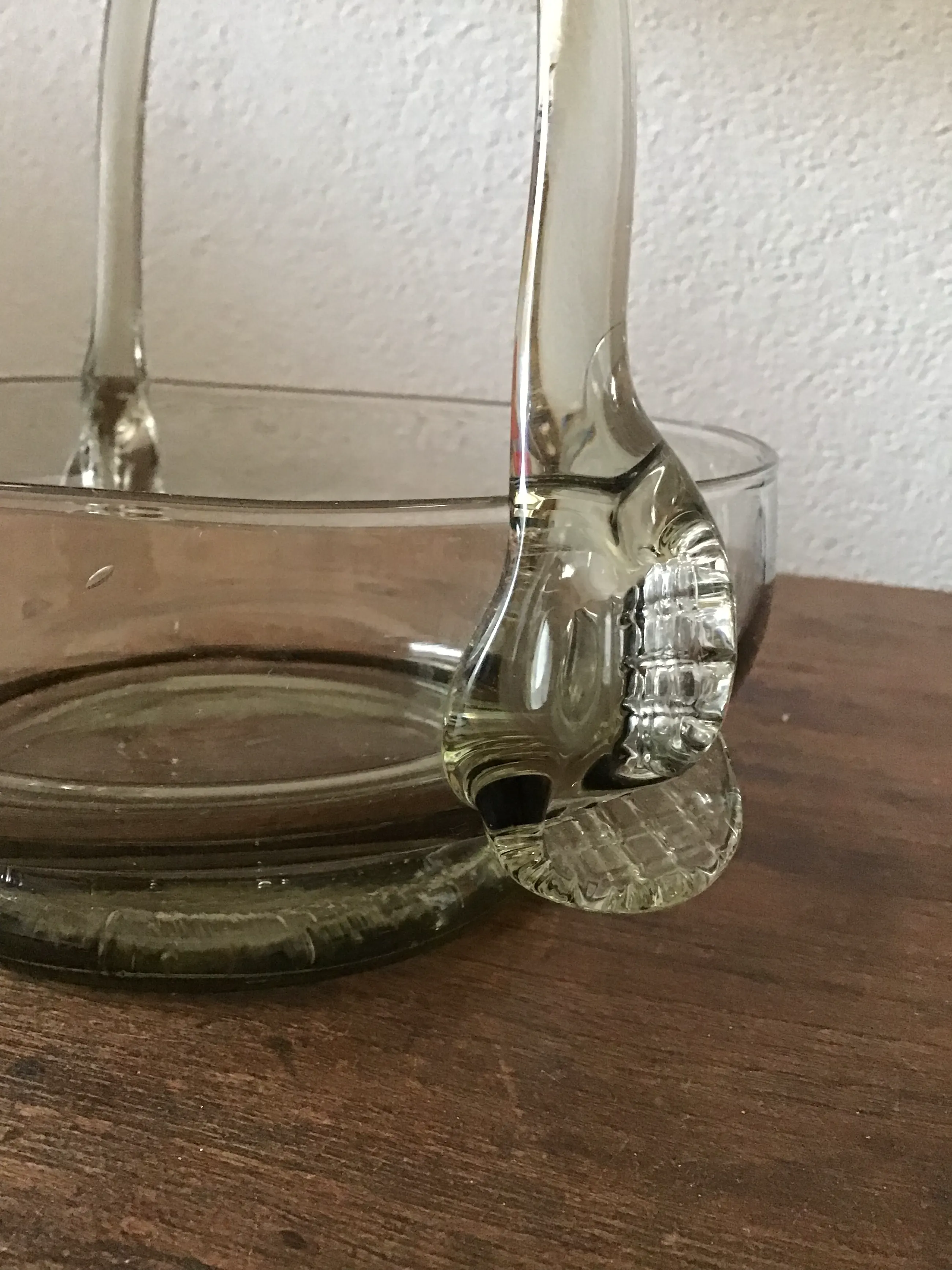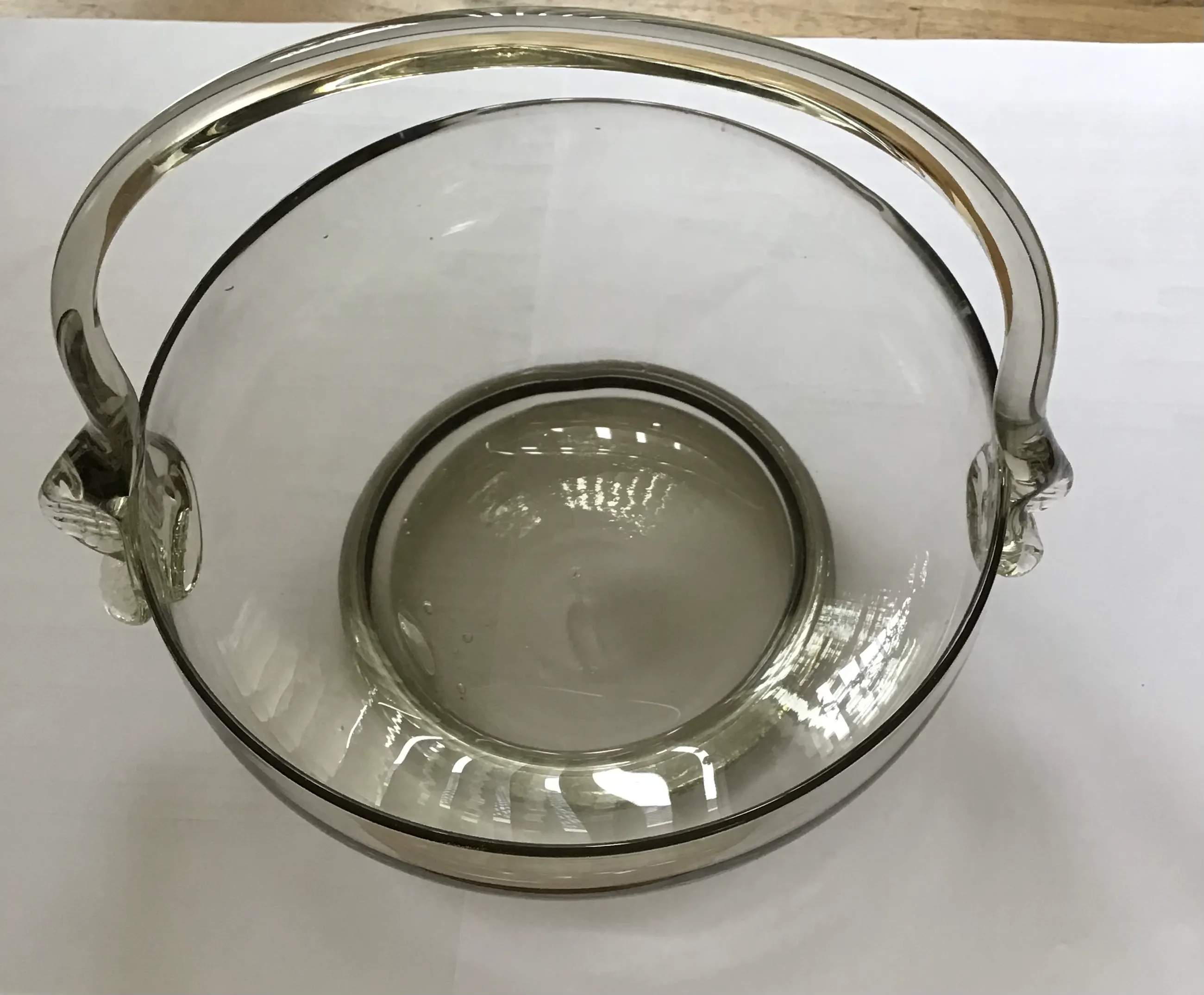 Bijzonder rookgas schaaltje op voet Met hengsel Handgeblazen Hengsels zijn niet aan beide kanten gelijk Onderin luchtbellen Doorsnee 18 cm Hoogte met hengsel 18 cm Zonder hengsel 8 cm Wordt aangetekend verzonden