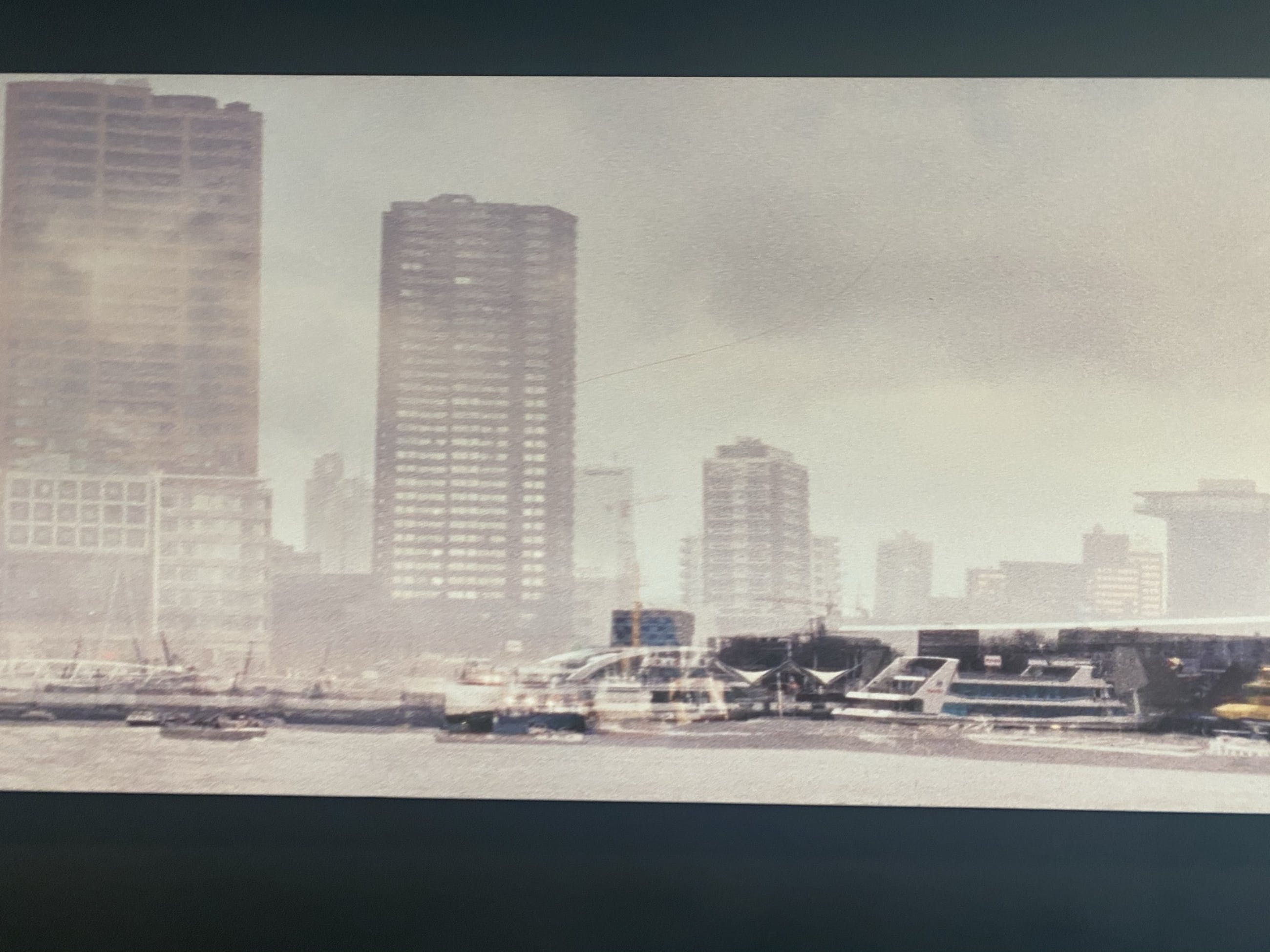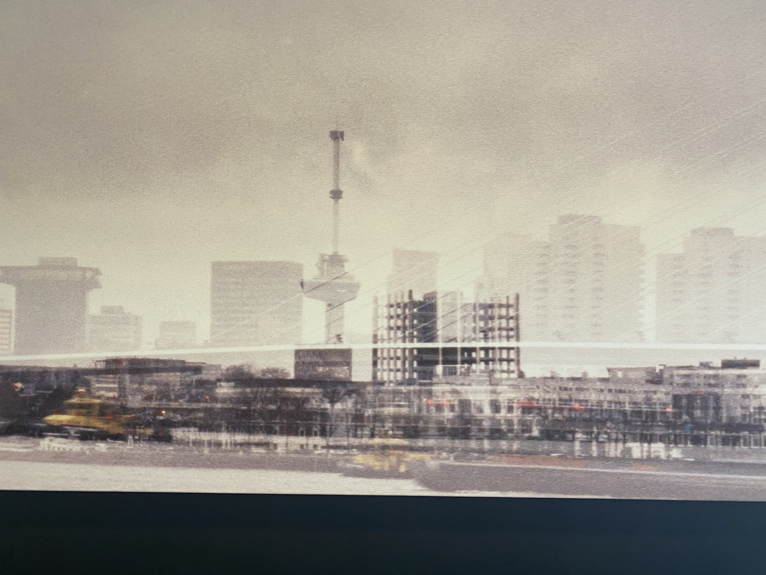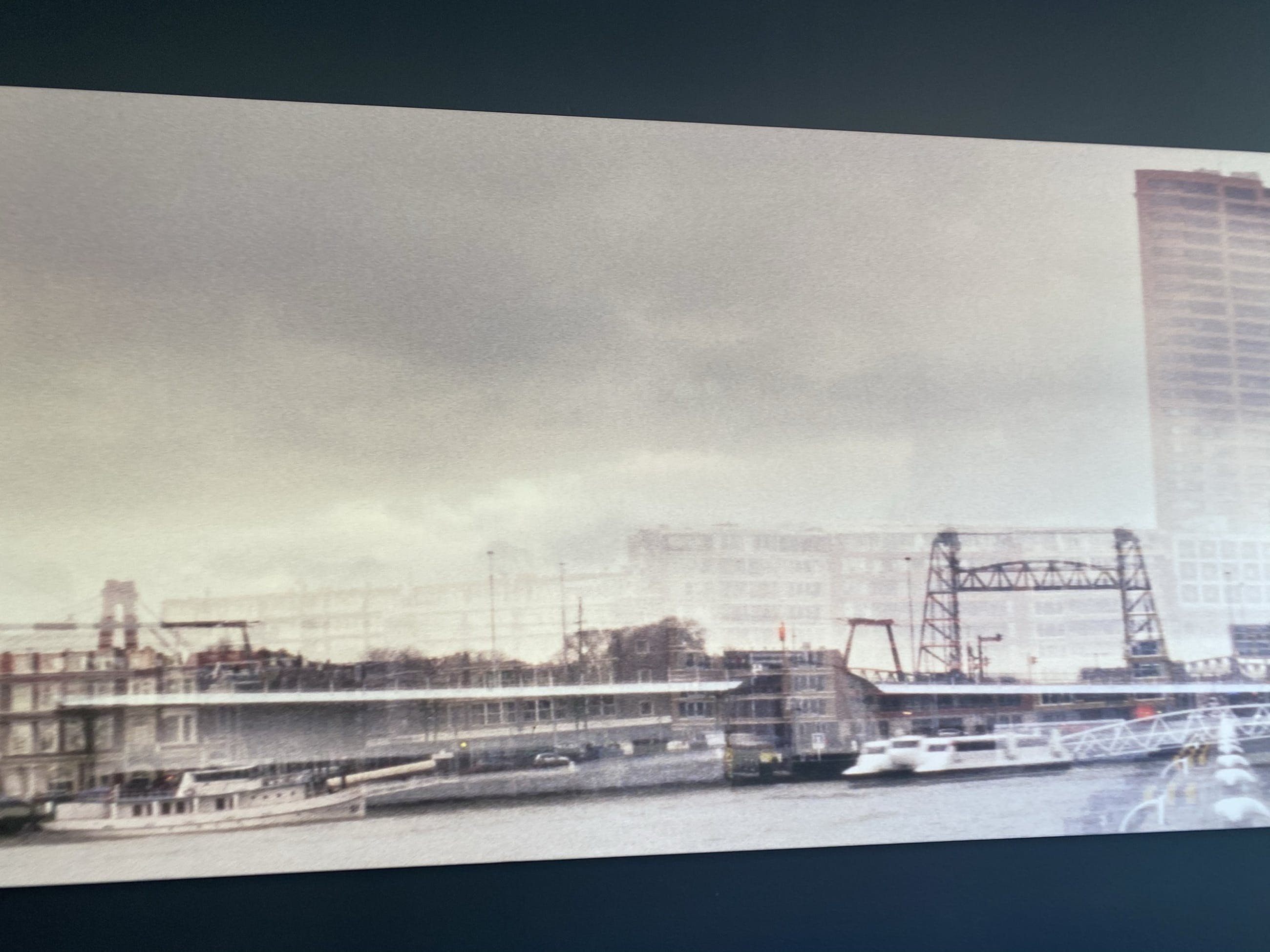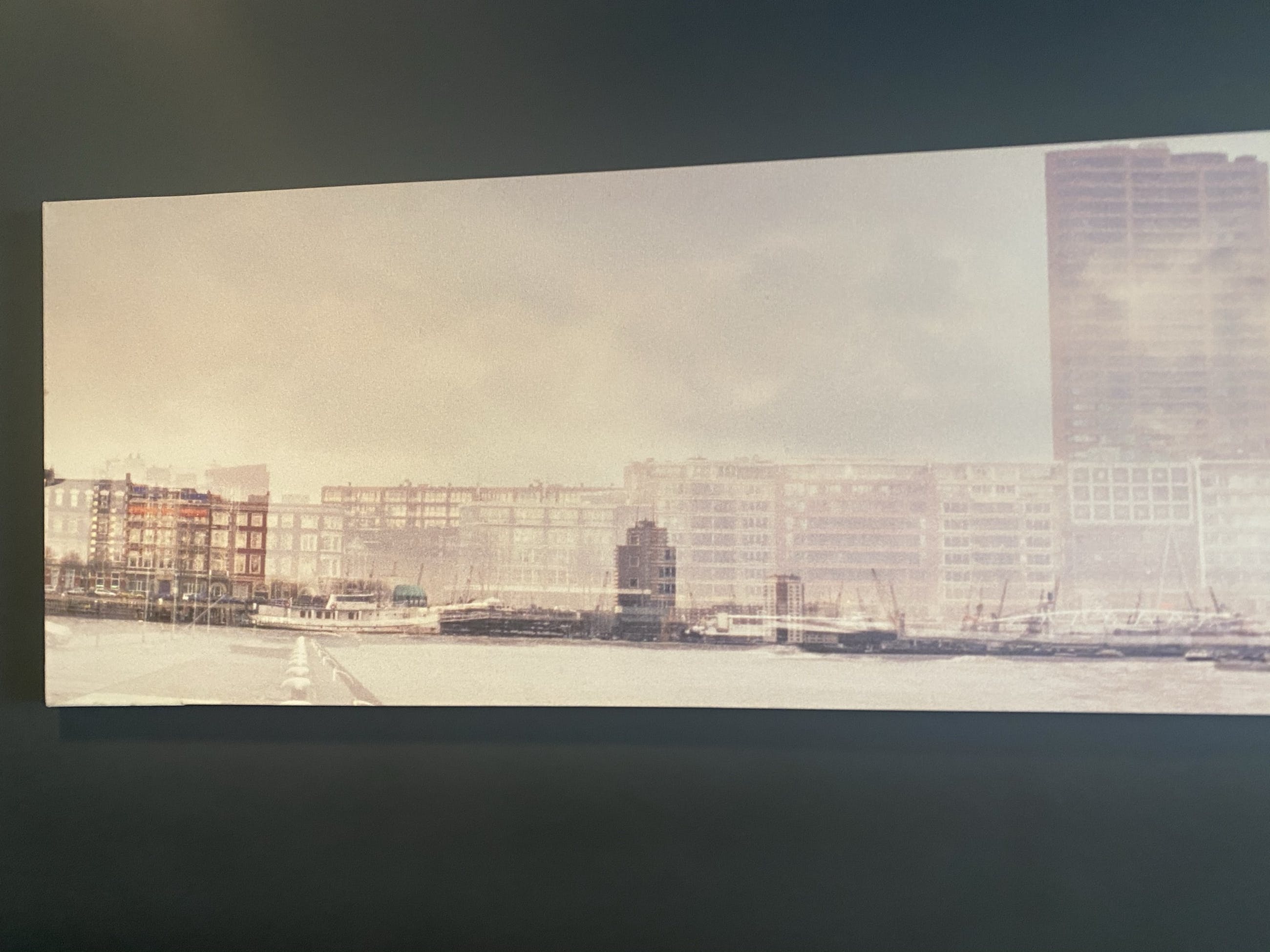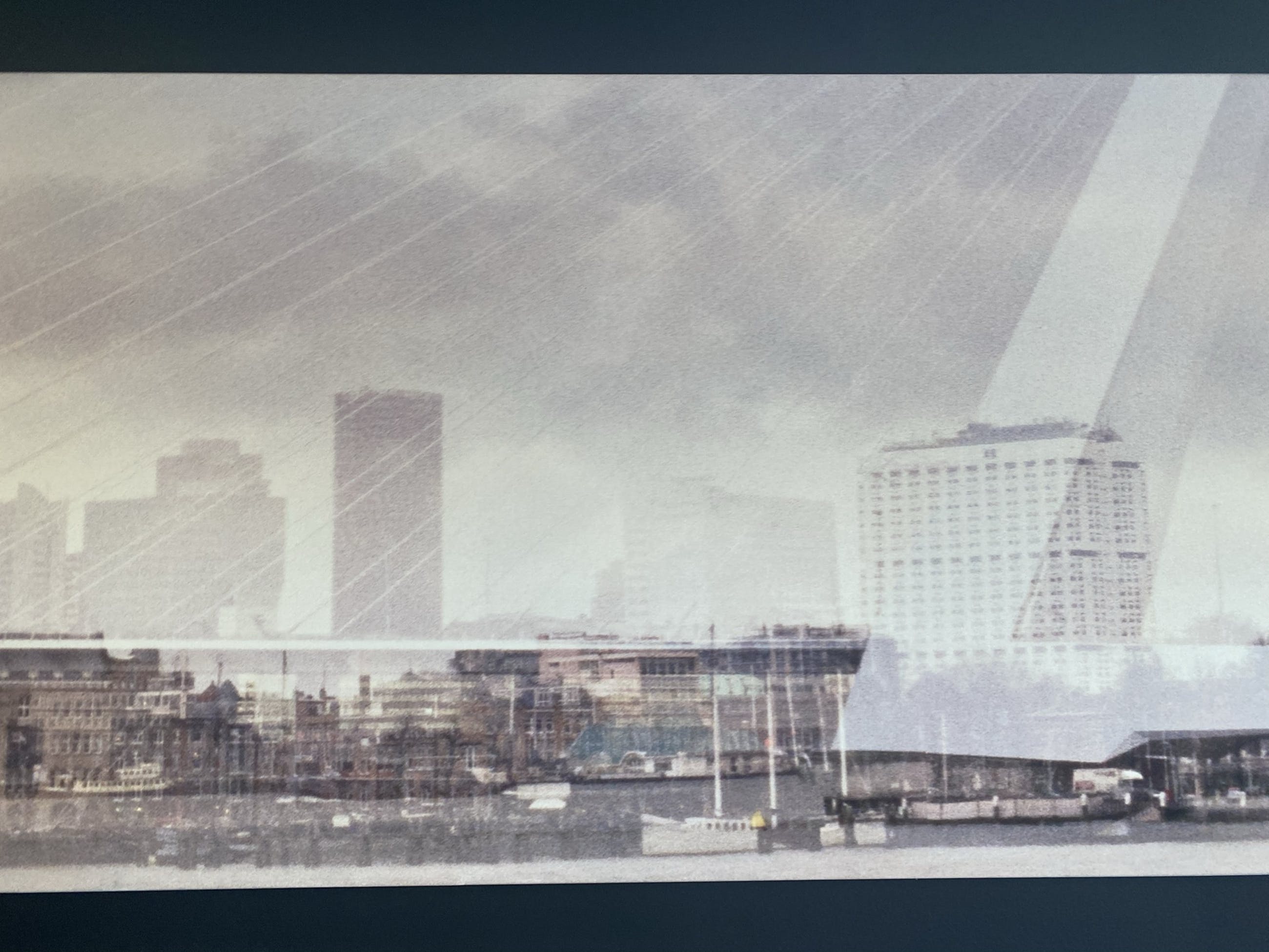 Lidy Veldhuyzen maakte dit doek in 2008. Foto’s van Rotterdamse iconen werden over elkaar heen geplaatst. Het is een schitterend doek.