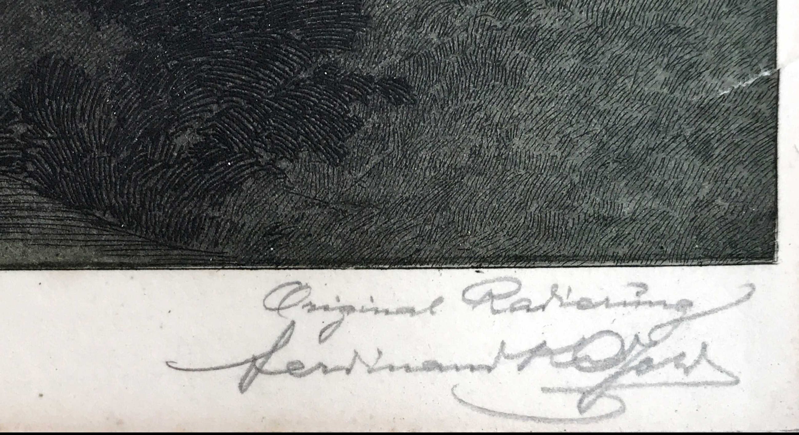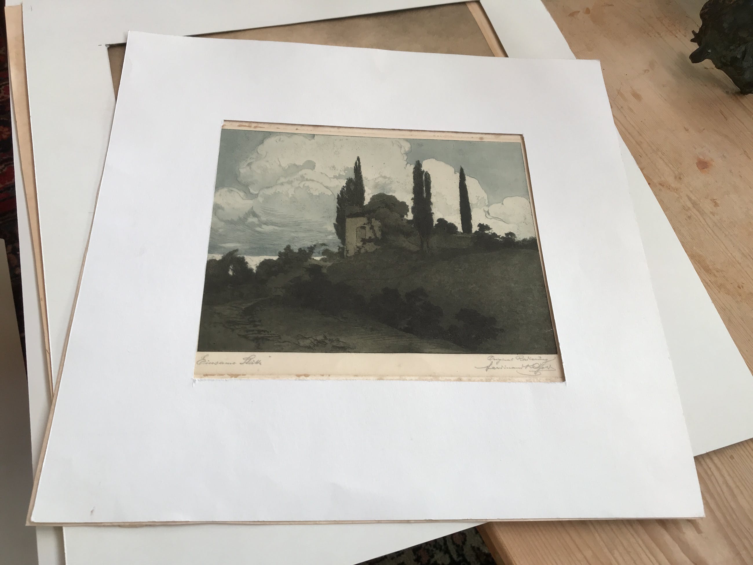 beschadiging van passepartout resten, verkleuring(en) in papier. Klein scheurtje in de ets