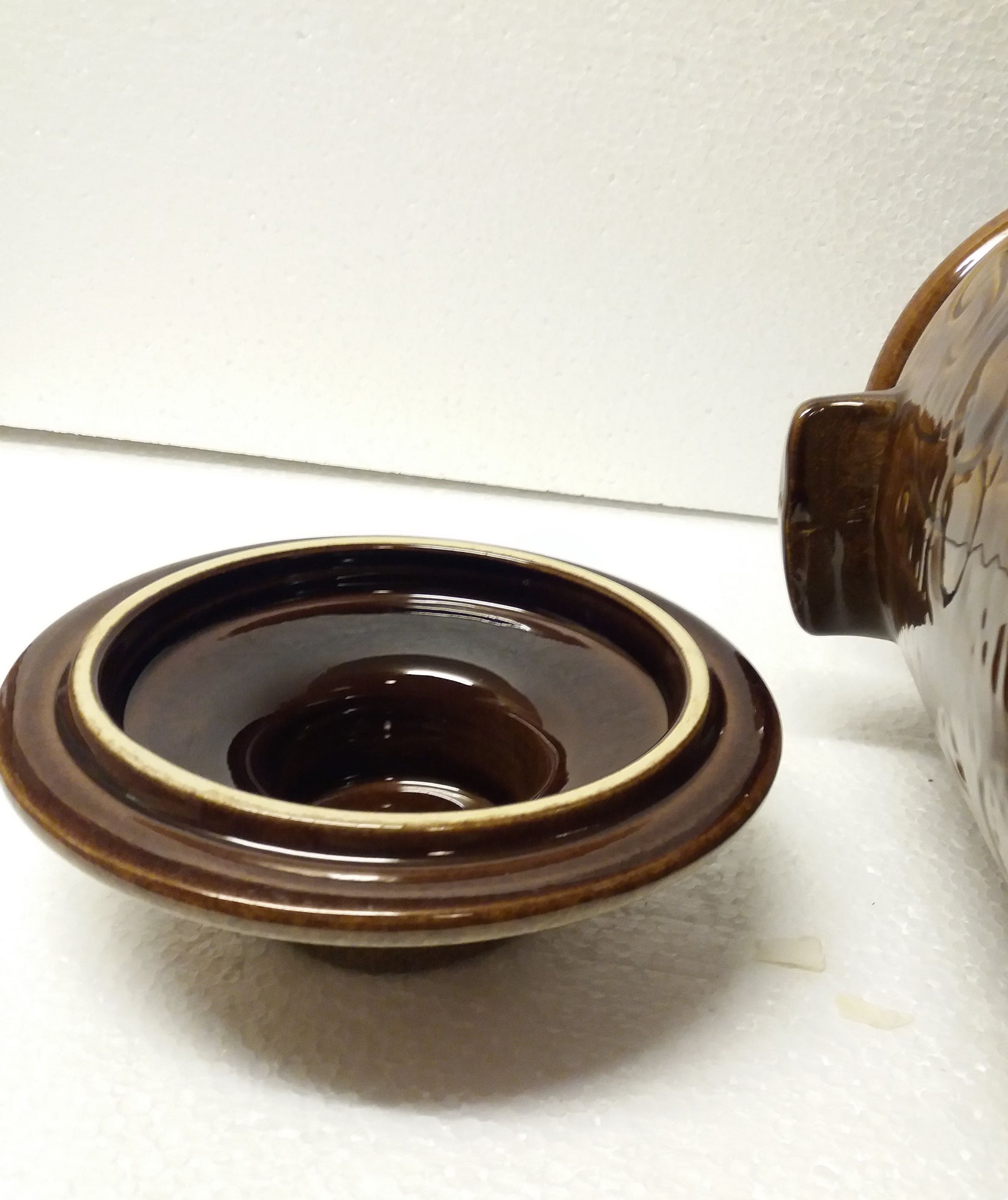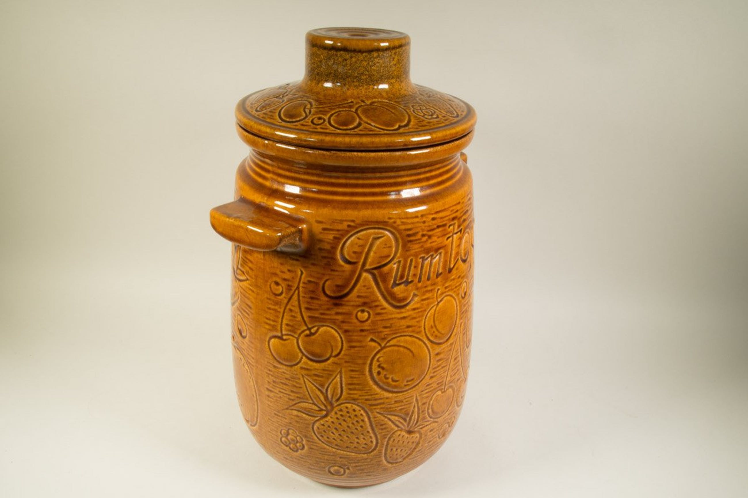 Prachtige vintage Rumtopf pot gemaakt door Scheurich. Gemerkt op de bodem "W. Germany 204-28" Hoogte: 34 cm incl deksel (28 cm zonder deksel) Gewicht: 2850 gram Kleur: oker