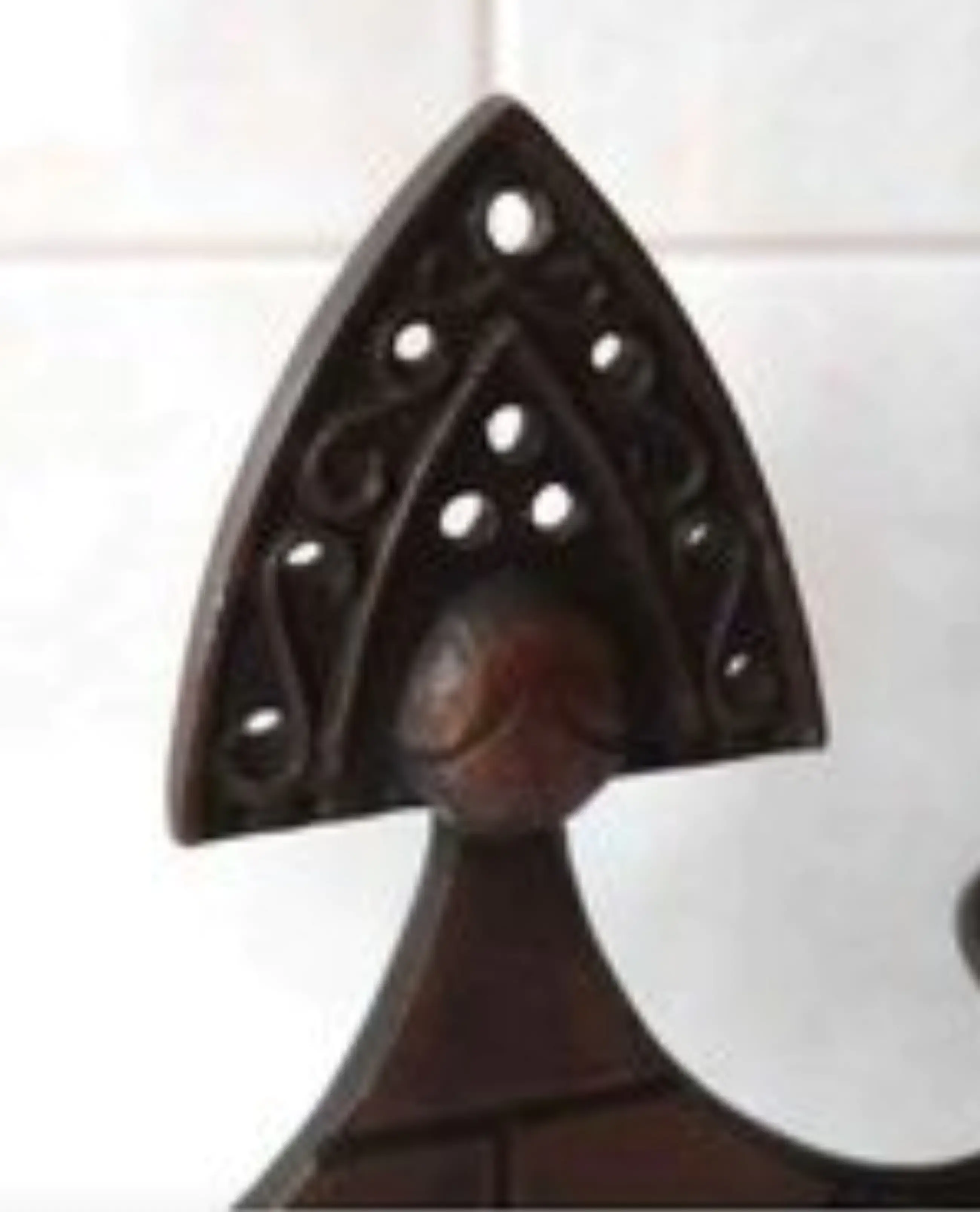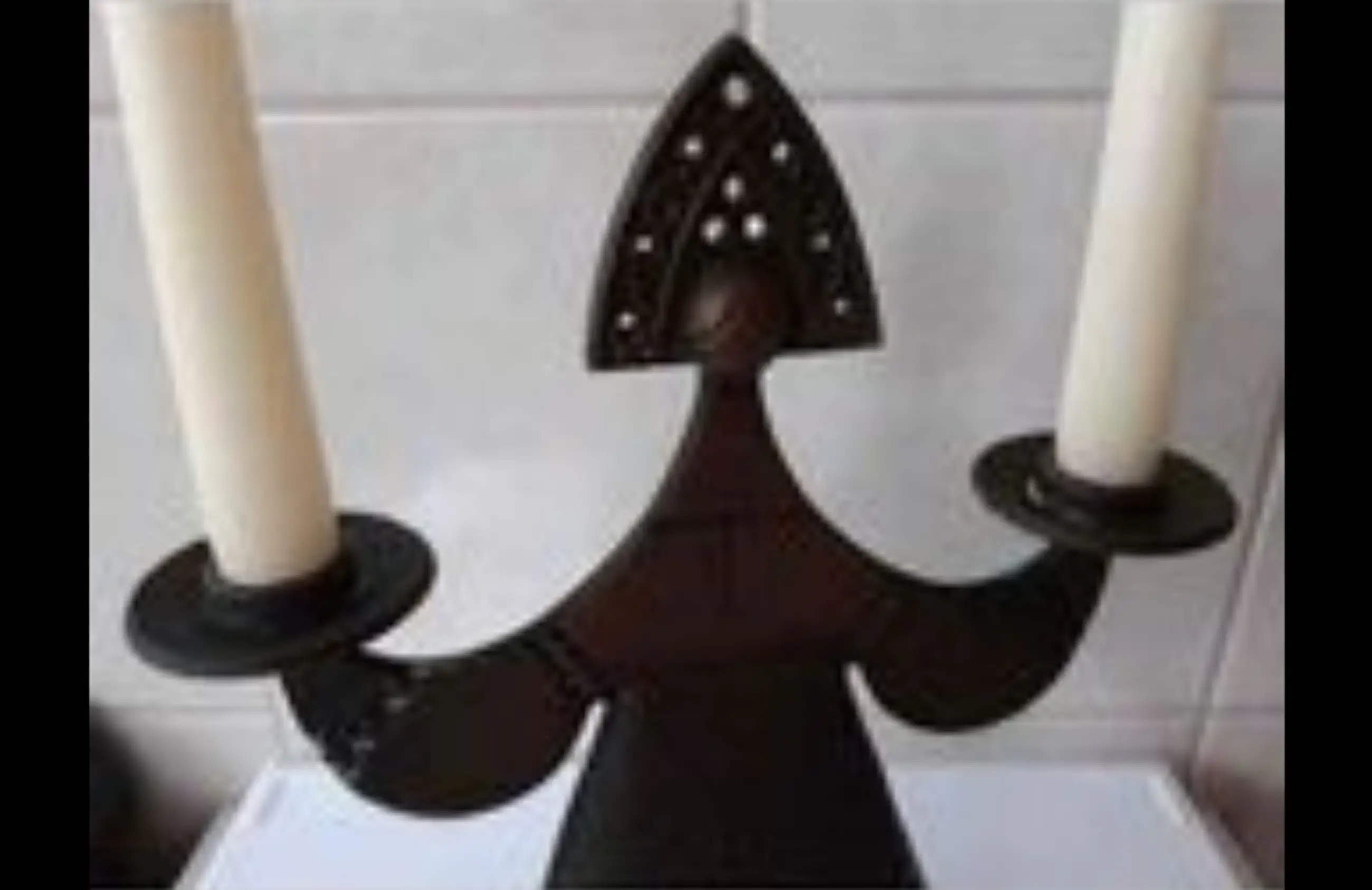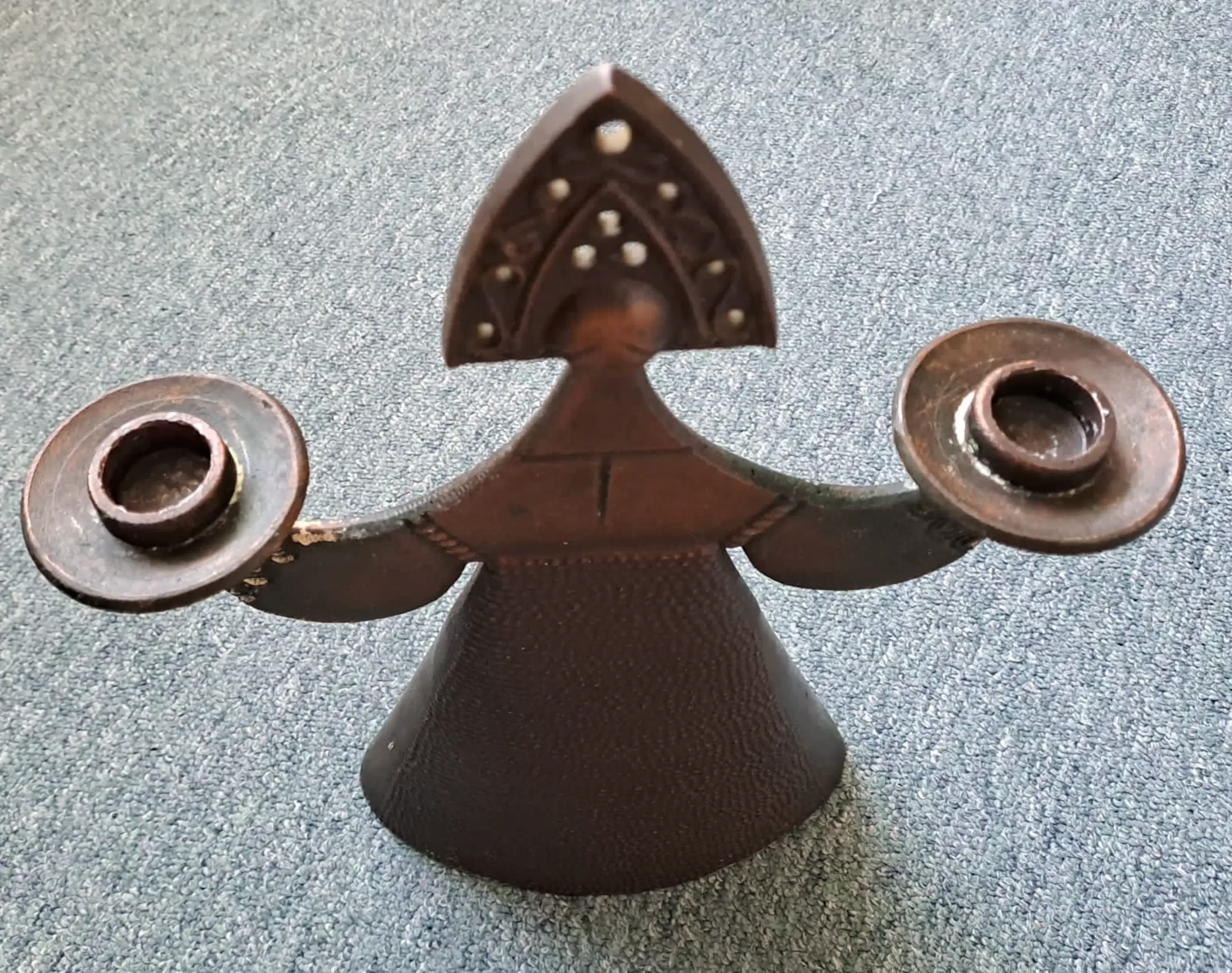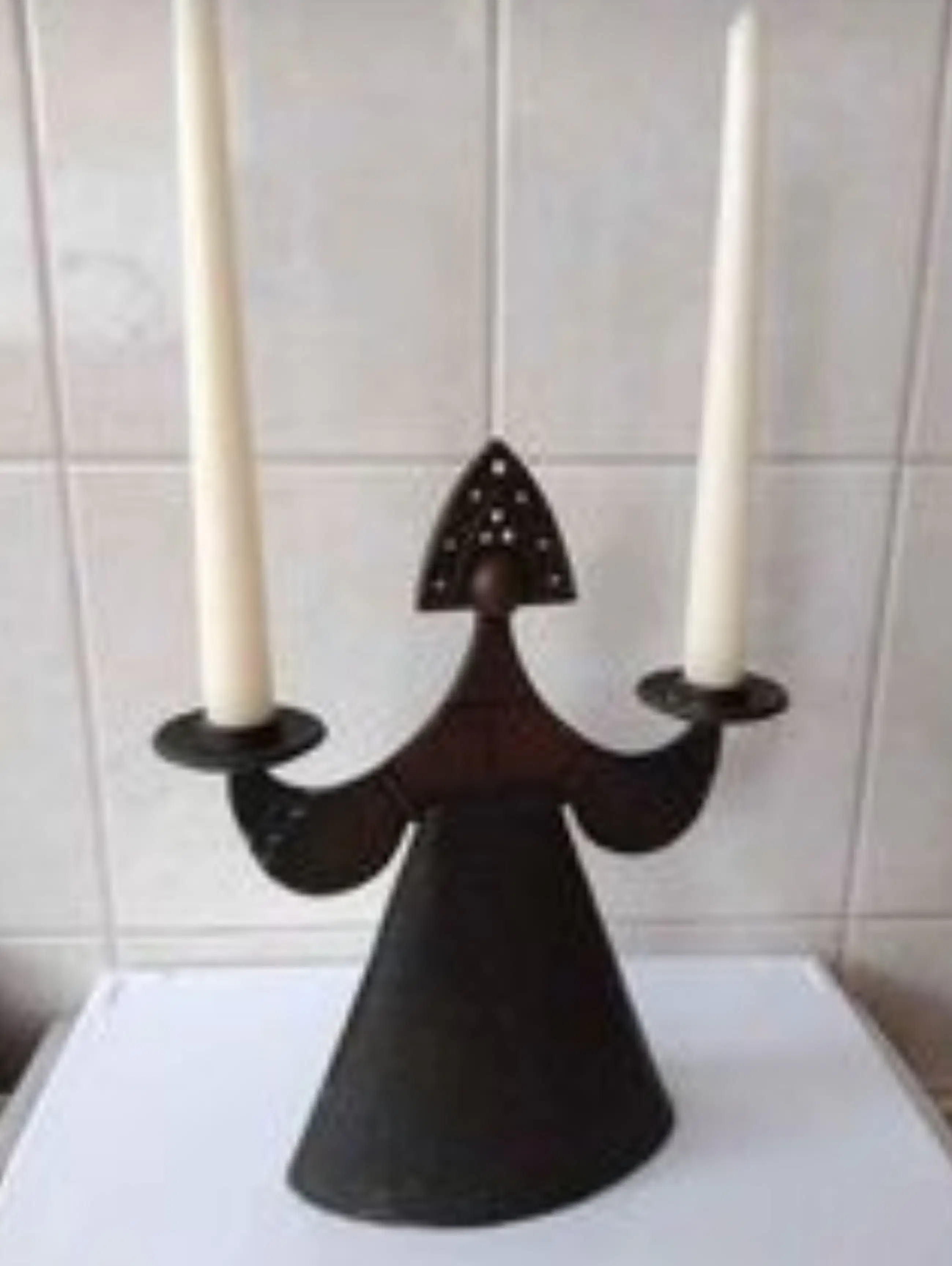Design 2 -armige kandelaar in de vorm van een gestileerde vrouwenfiguur met kokoshink hoofdtooi. Land van herkomst: Rusland Vervaardigd tussen 1970 en 1979 Materiaal: brons/ koper