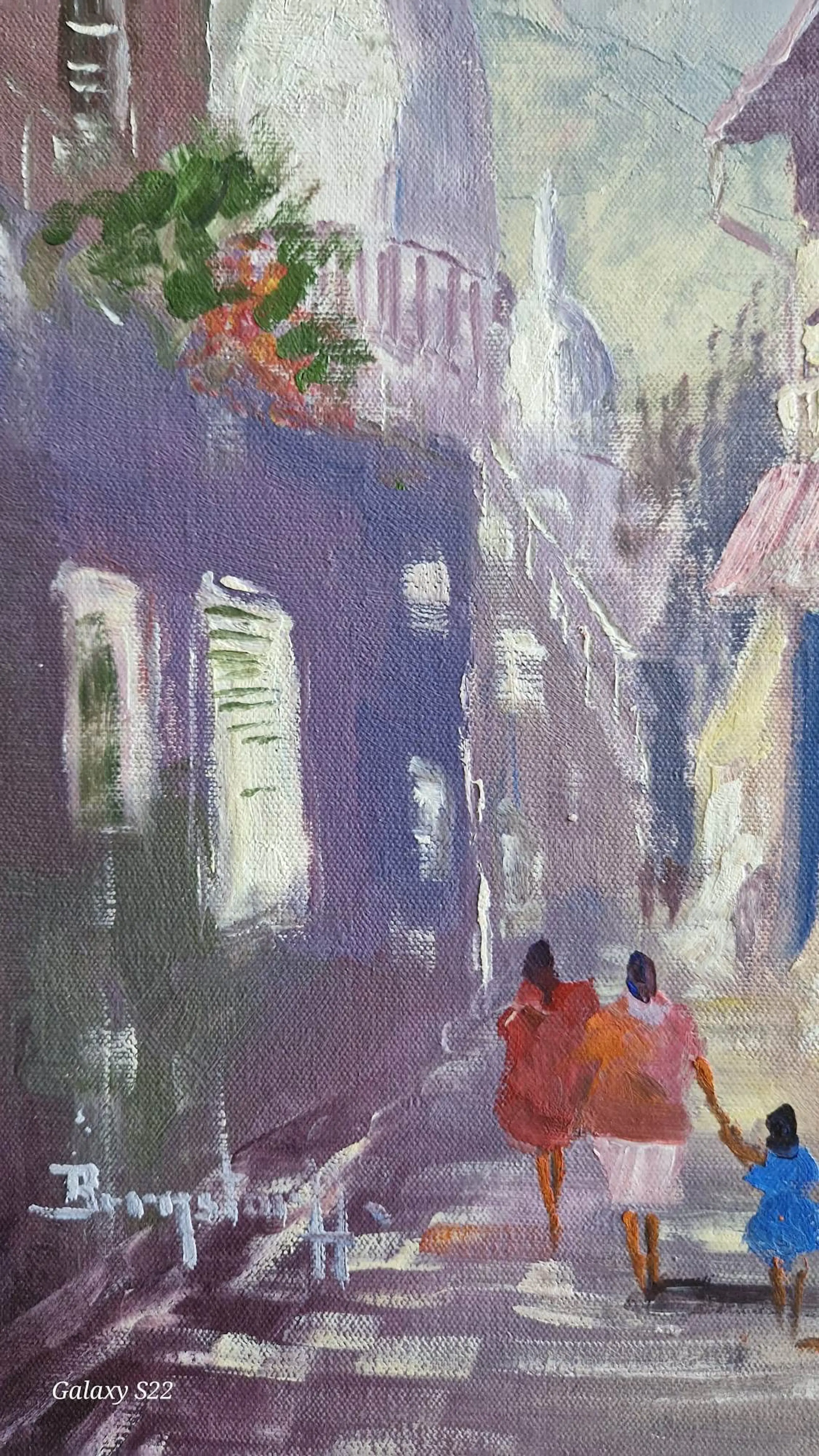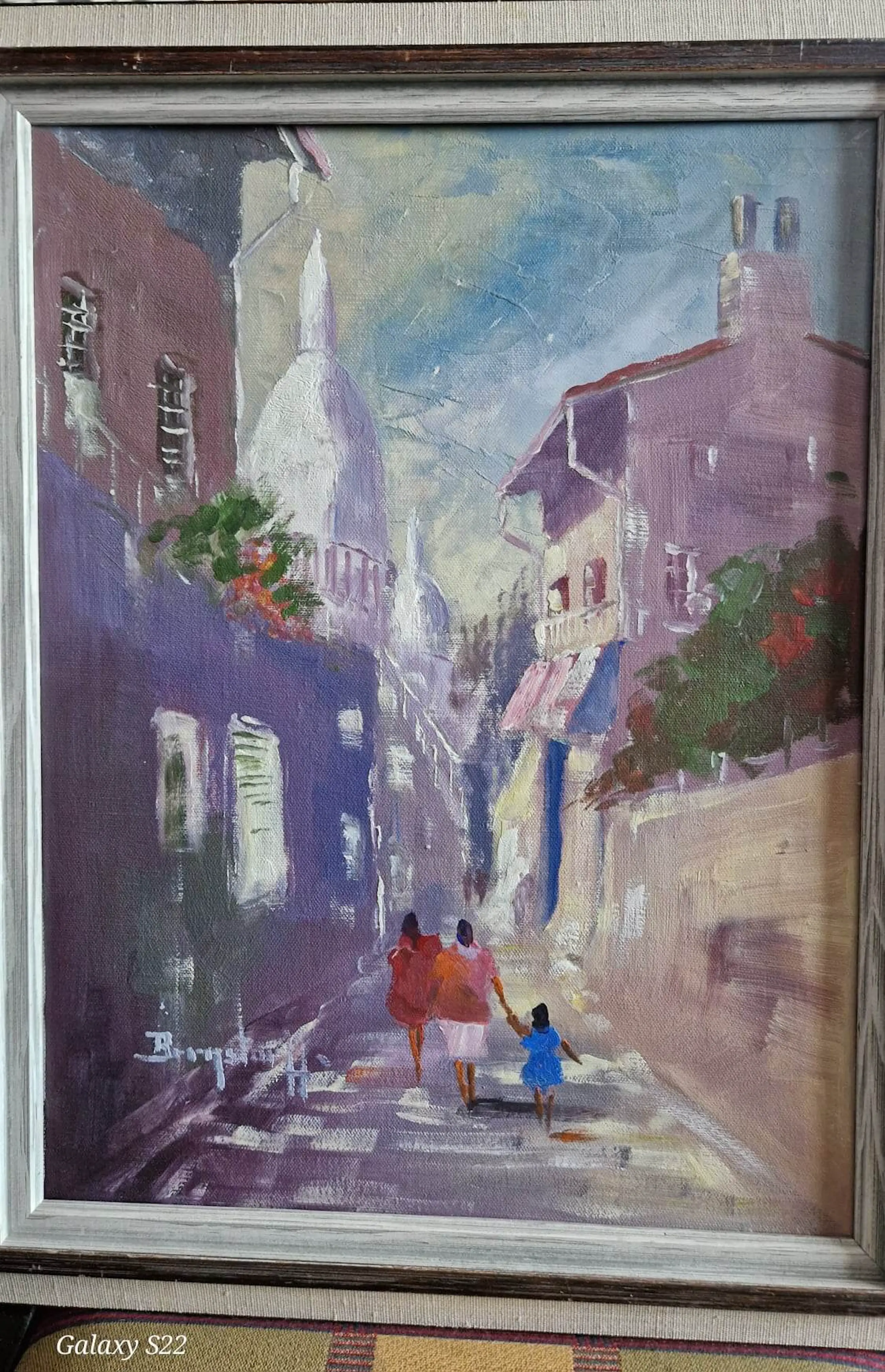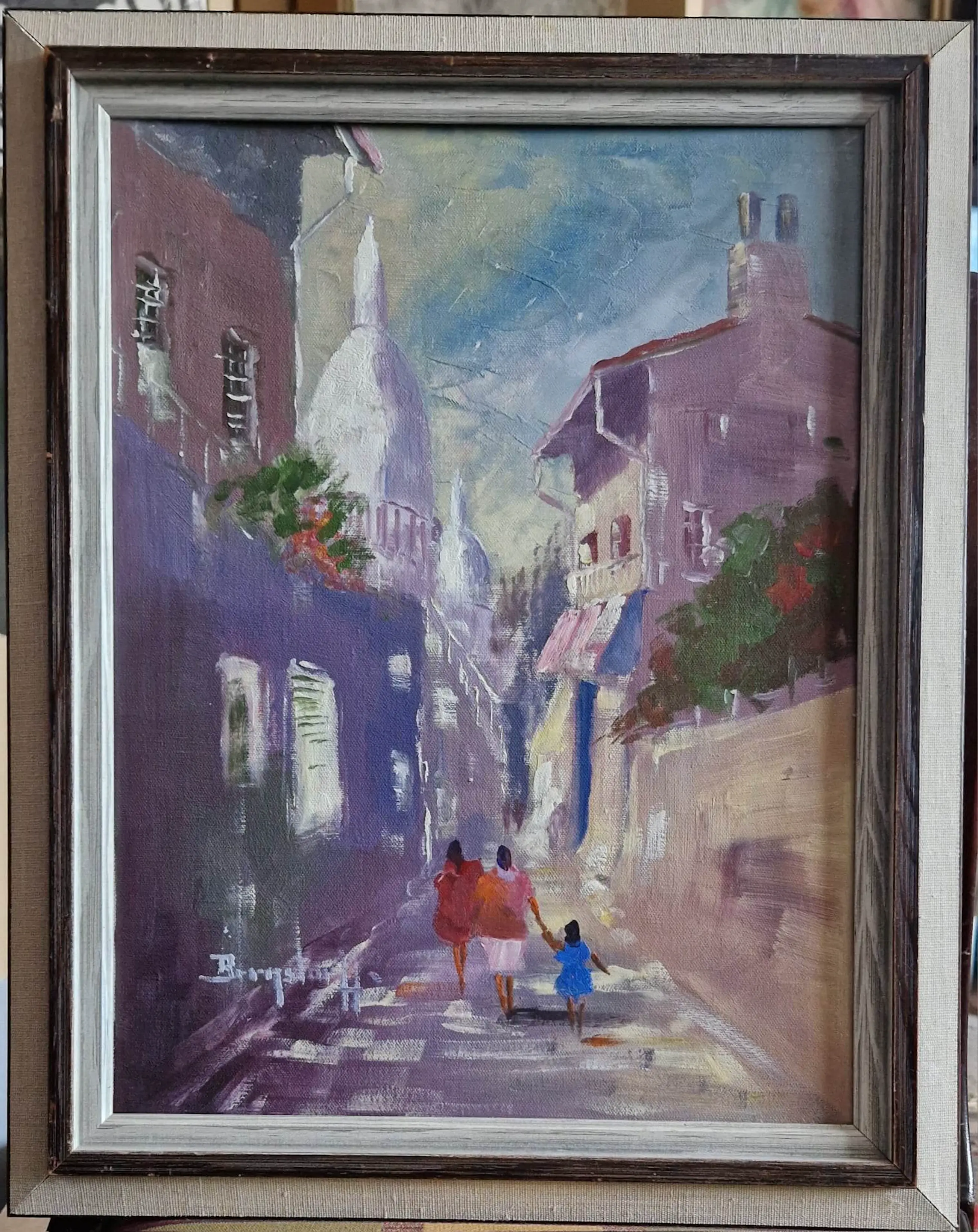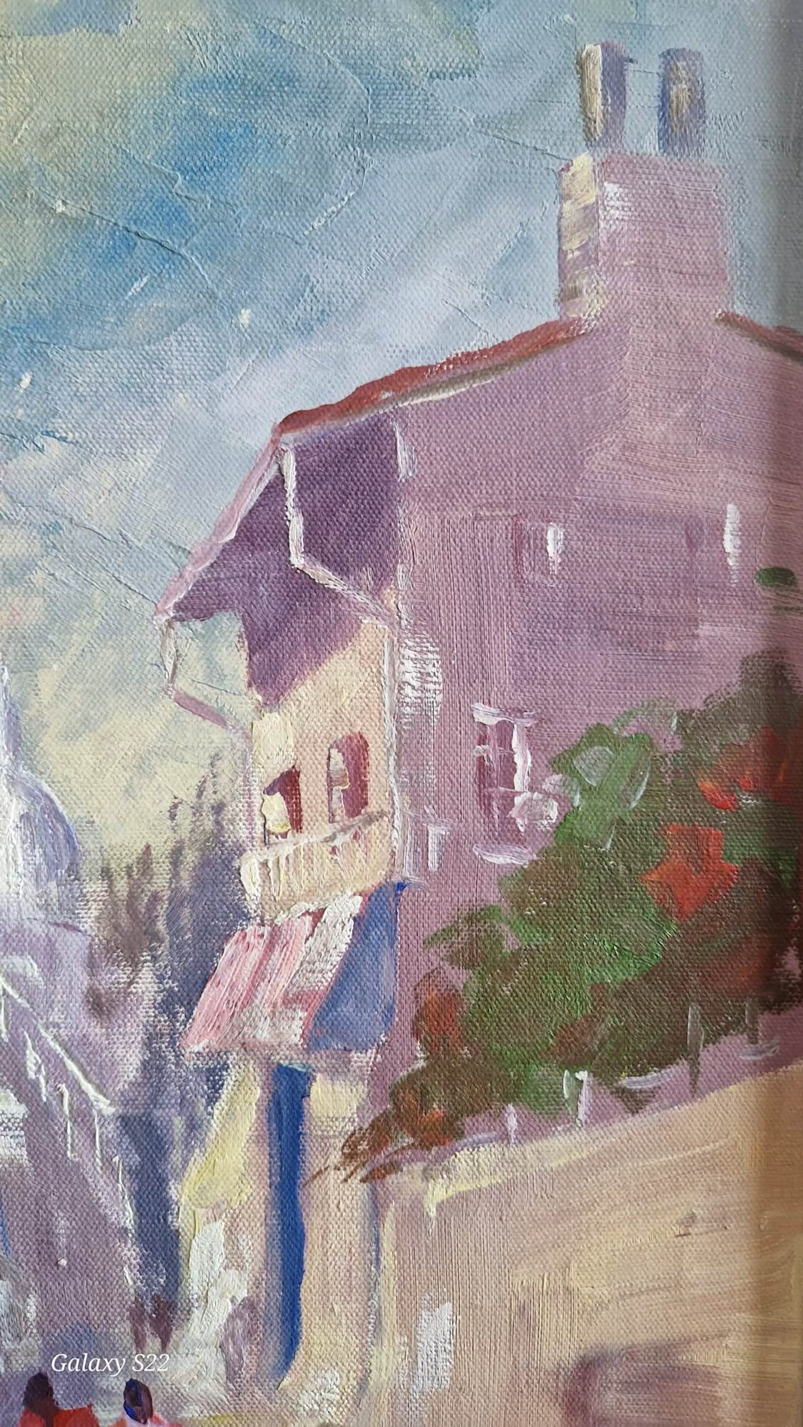 Een prachtige foto "Een stadsstraat" Scandinavische sportschool Olieverf op doek, houten lijst. Mogelijk eerste helft 20e eeuw. Afmetingen zonder lijst, hoogte 40 cm, breedte 30 cm