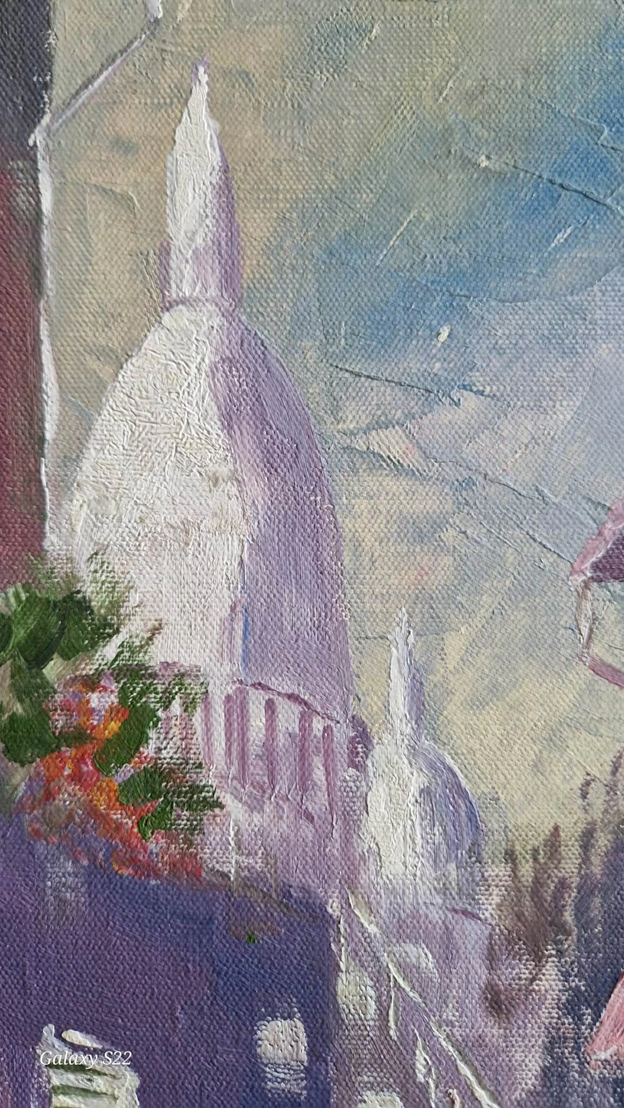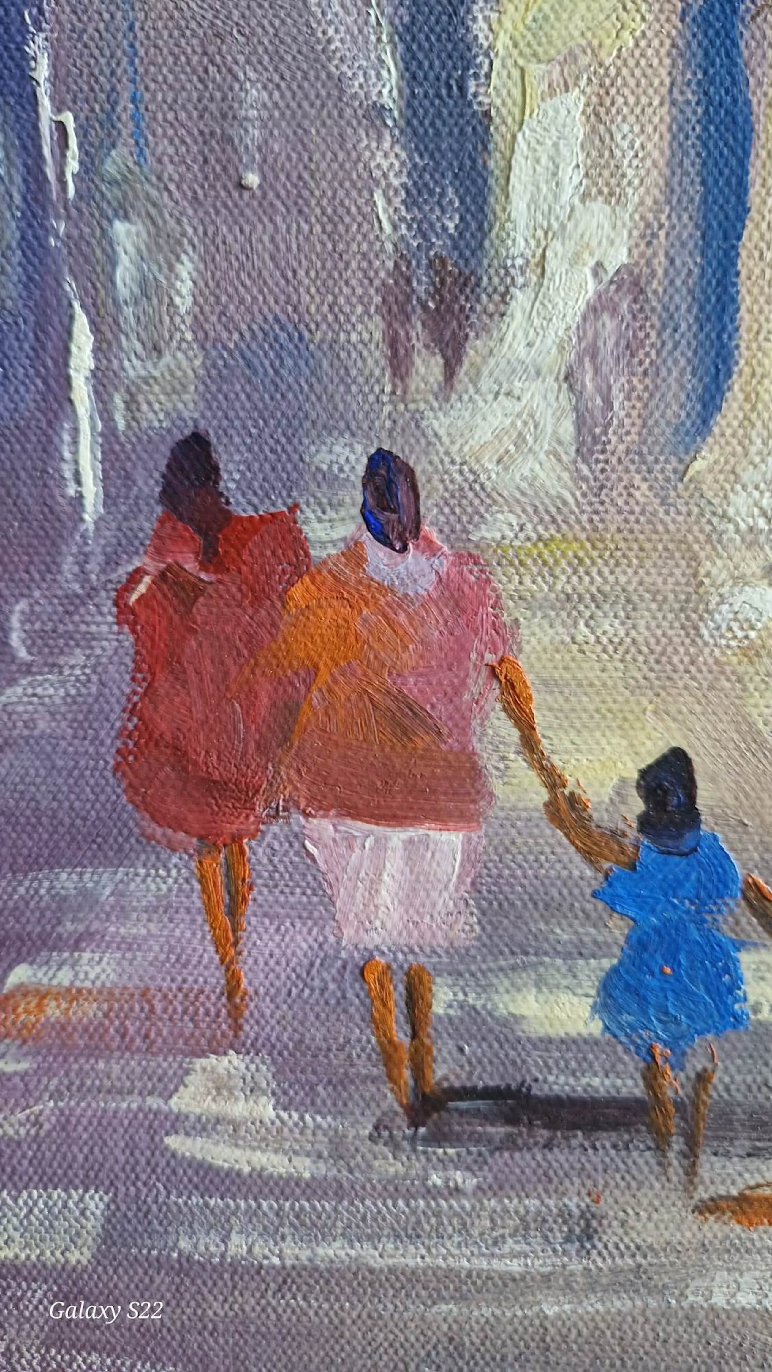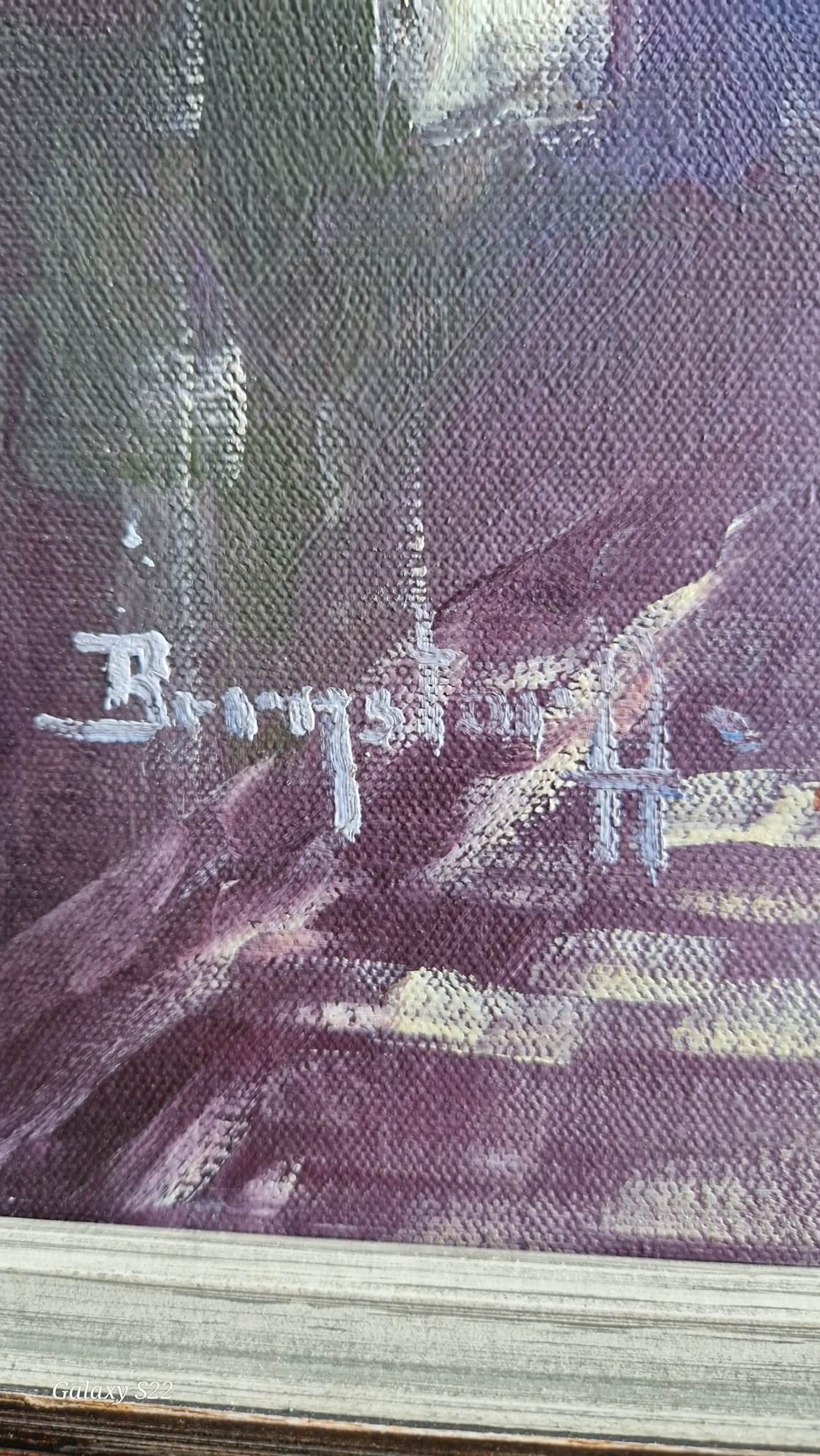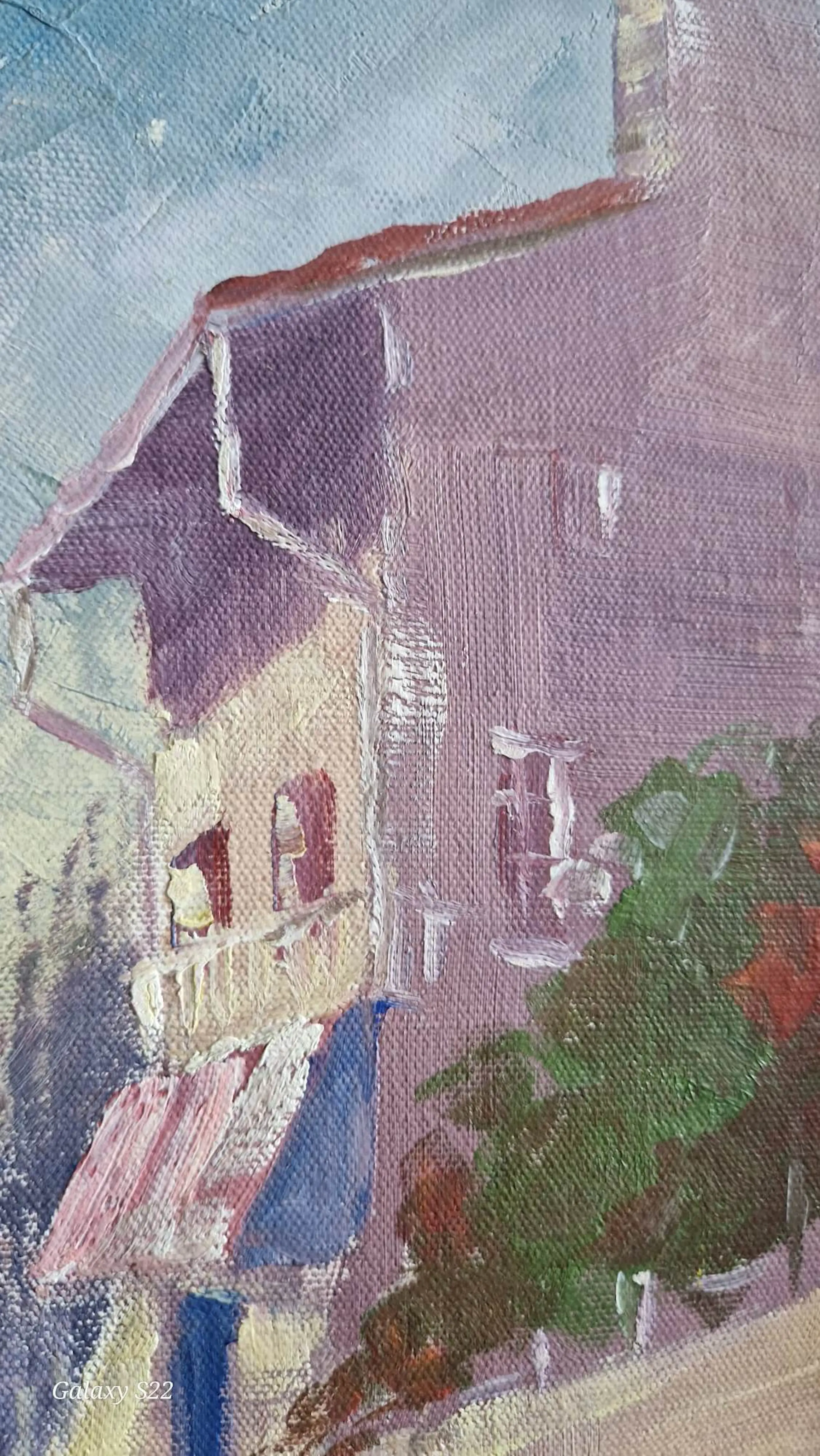 Een prachtige foto "Een stadsstraat" Scandinavische sportschool Olieverf op doek, houten lijst. Mogelijk eerste helft 20e eeuw. Afmetingen zonder lijst, hoogte 40 cm, breedte 30 cm