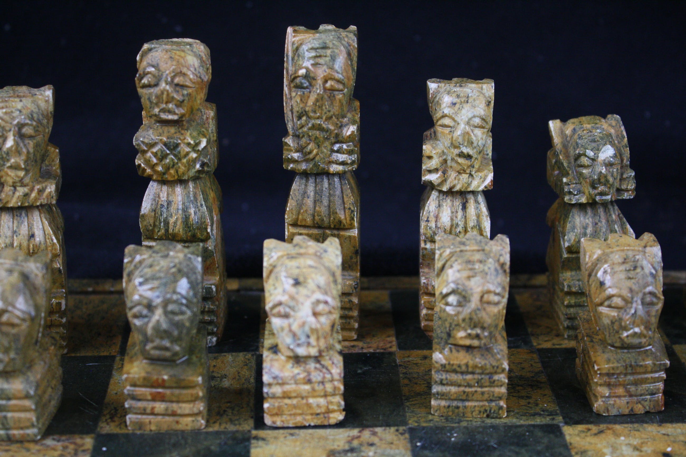 Aangeboden ter Uwer Overweging Fraai Natuurstenen Schaakspel uit Peru. Verkeerd in zeer goede staat voor de leeftijd,heeft wel ouderdoms sporen. Zeer Gedetialeerd Uitgevoerd Handgesneden eveneens het Bord onderkant van hout. Kijk goed naar de fotos waar U alle Detials kunt waarnemen. Zeer Decoratief,kavel stamt uit mijn prive collectie. Afmeting Hoog 9cm en Breed 30cm. Gewicht Totaal is 2400 Gram Wordt Zeer goed verpakt en Aangetekend opgestuurd met post.nl met trake en trace.