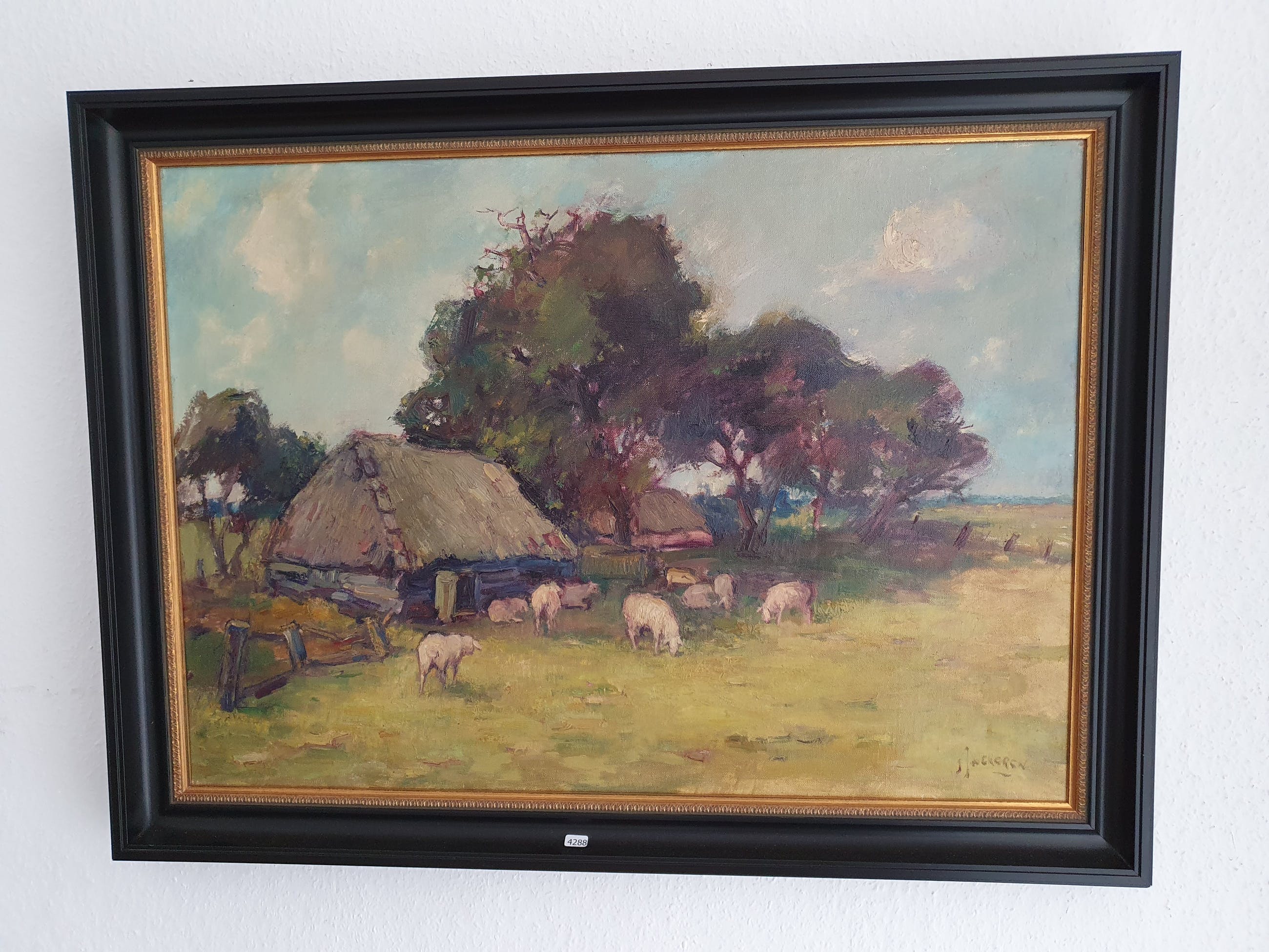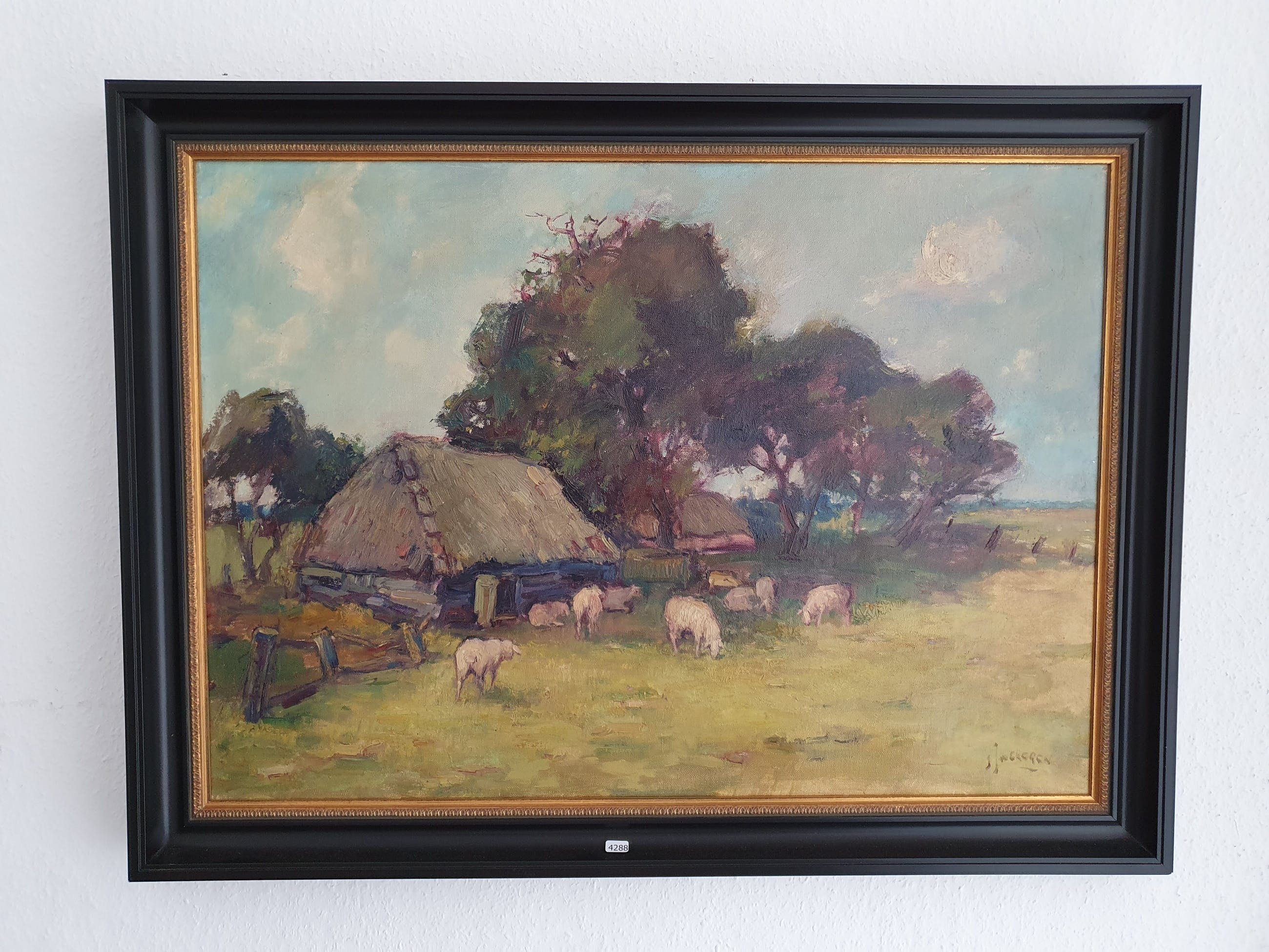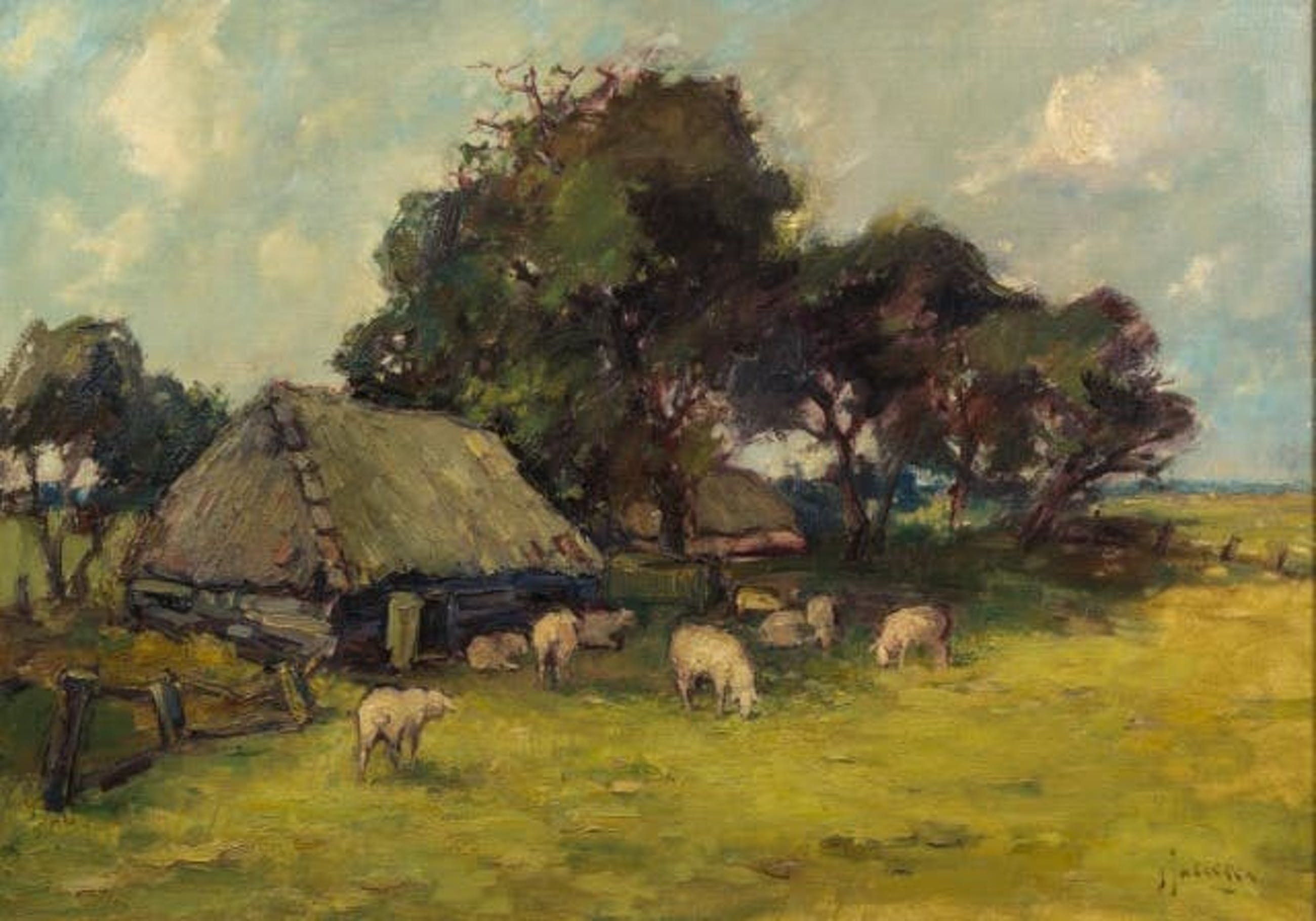 Hollandse School: schaapskooi onder de bomen, onduidelijk gesigneerd
