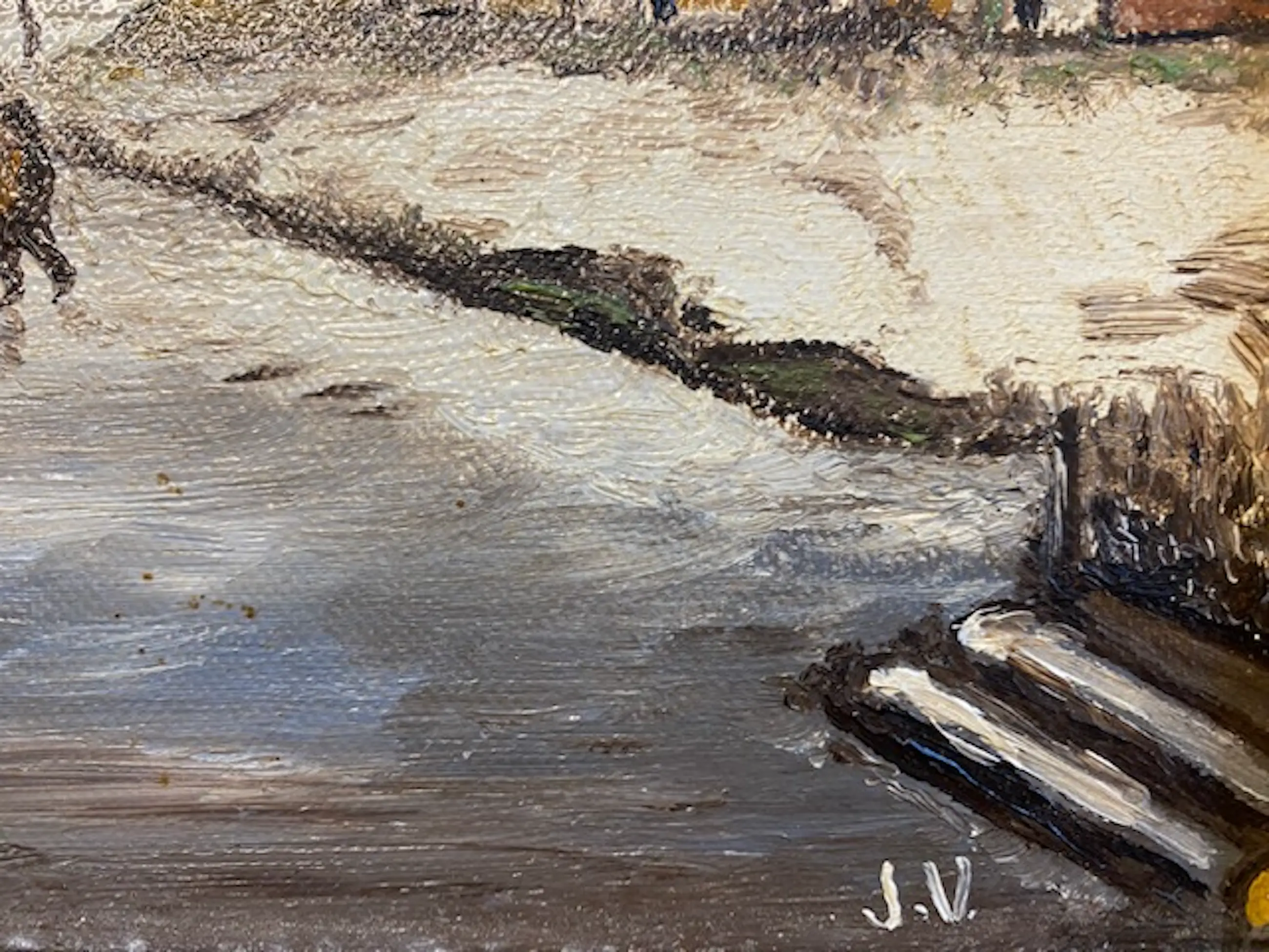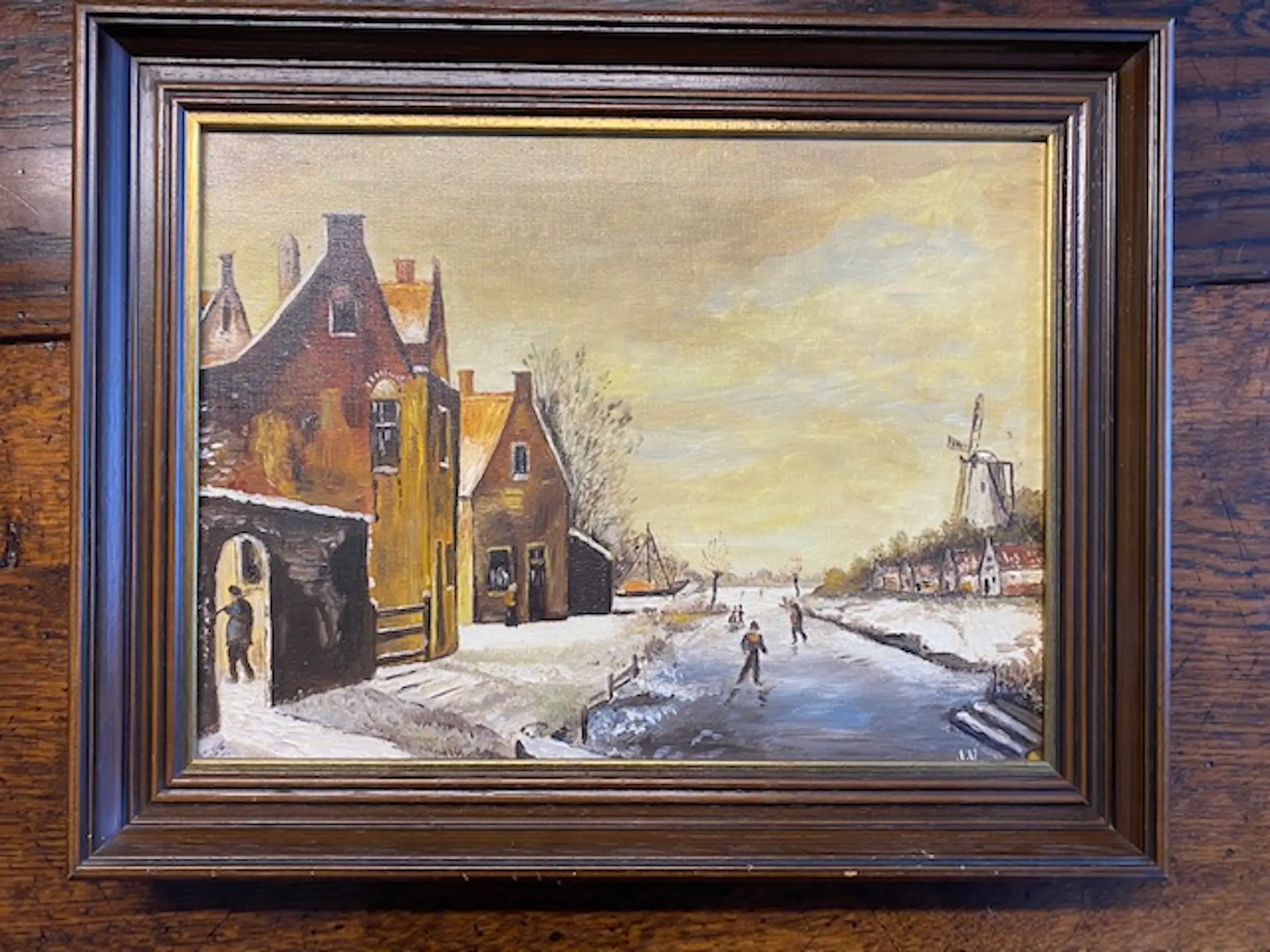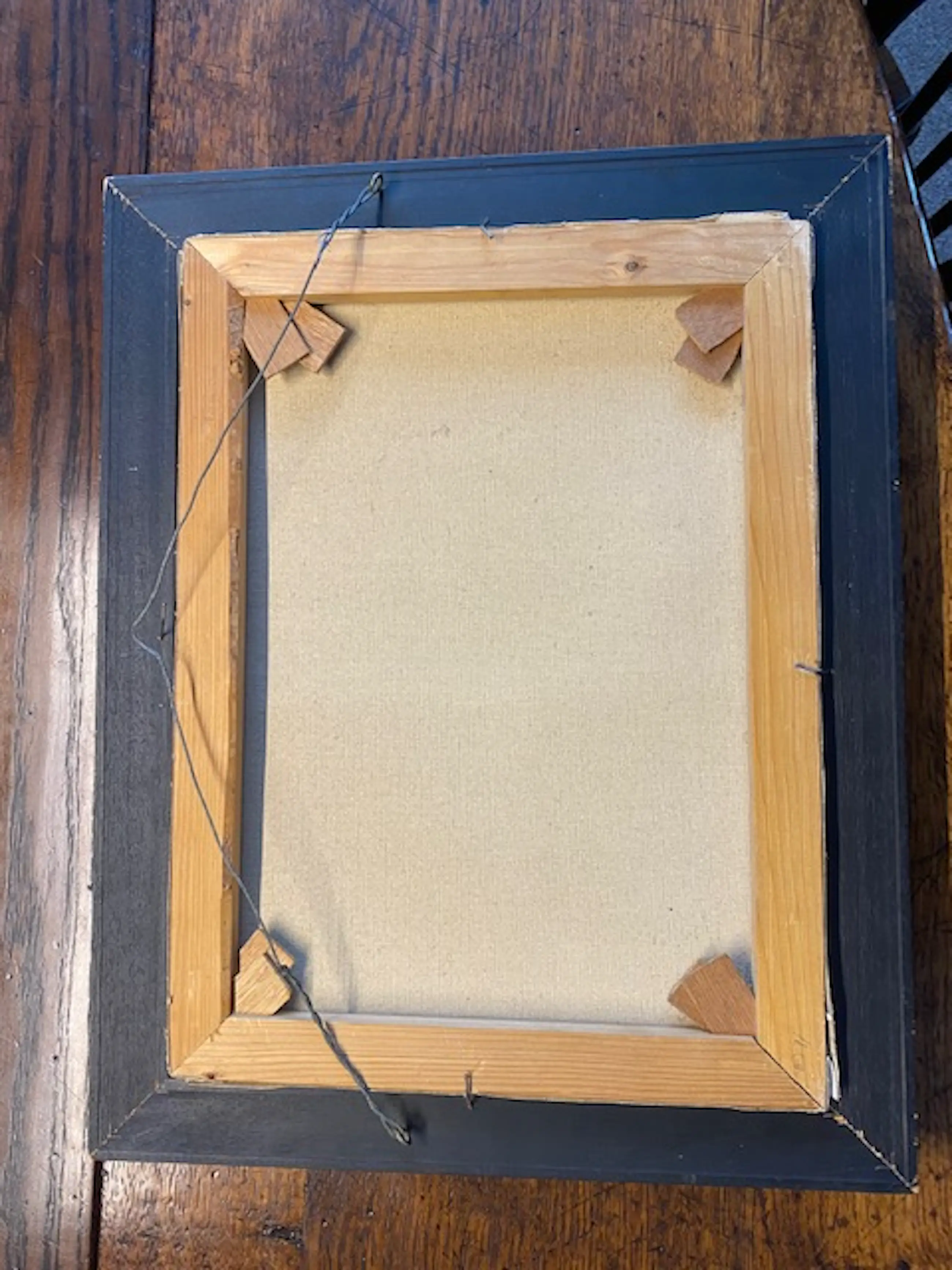 Zowel het schilderij als de originele houten lijst vertonen de gebruikelijke sporen van ouderdom maar zijn verder in goede staat.