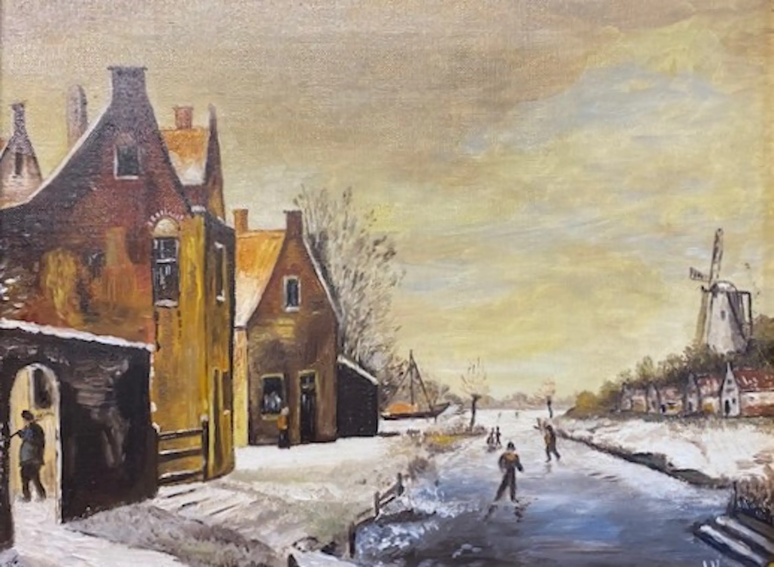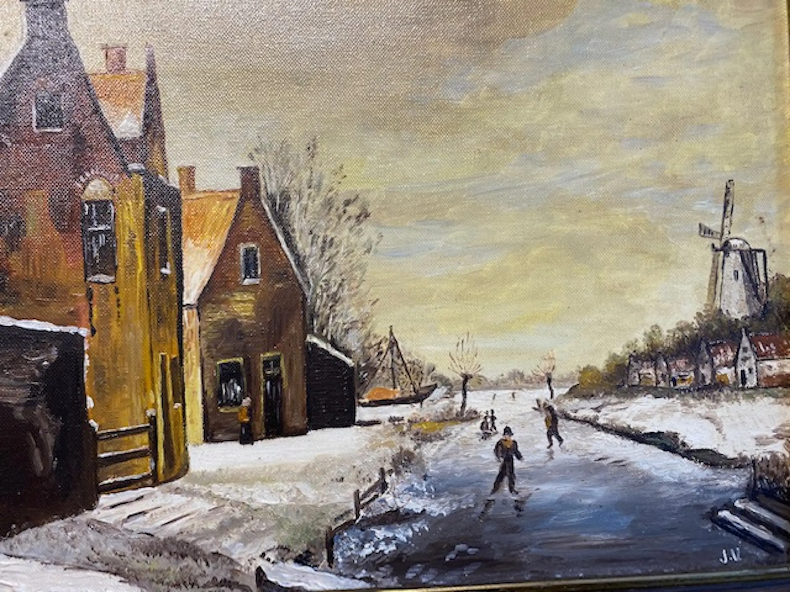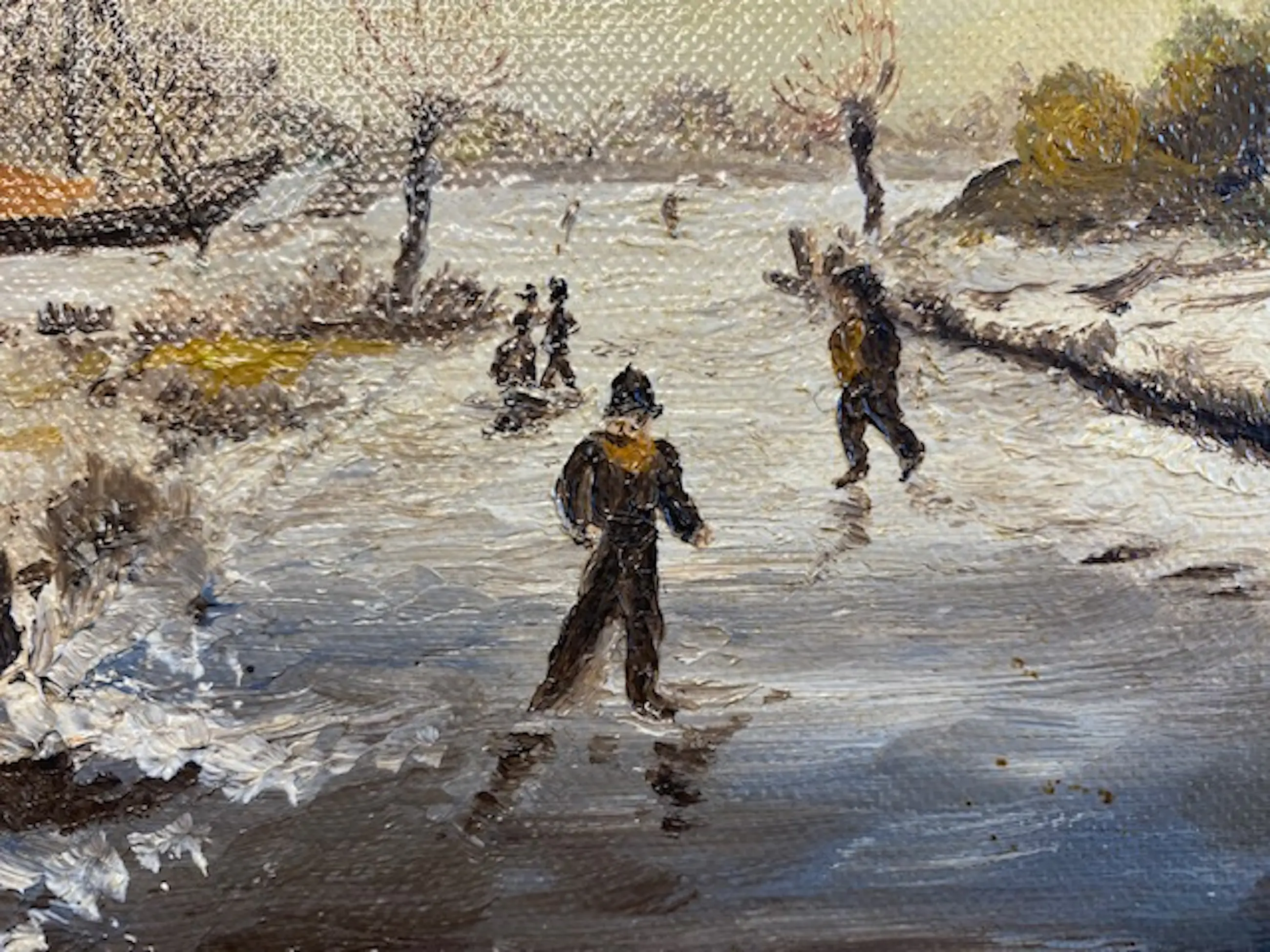 Zowel het schilderij als de originele houten lijst vertonen de gebruikelijke sporen van ouderdom maar zijn verder in goede staat.