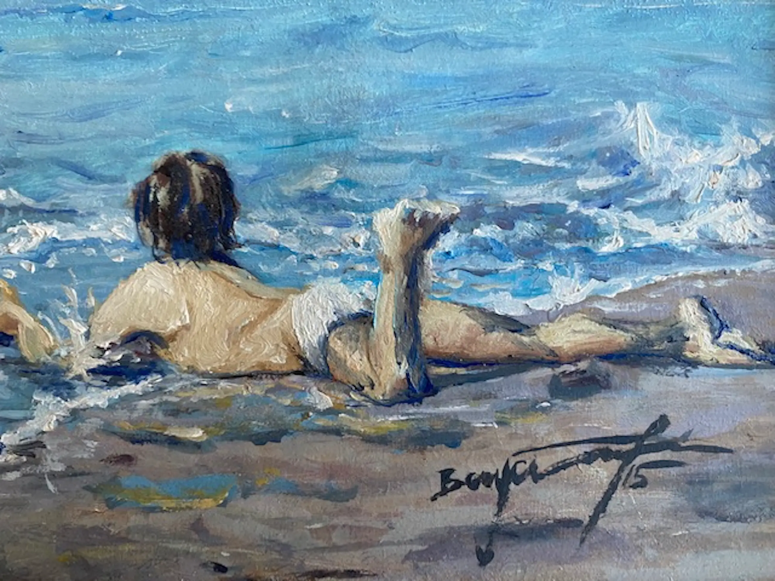impressie van een schelpen zoekend jongetje aan de kustlijn op het strand, helaas is de handtekening onleesbaar