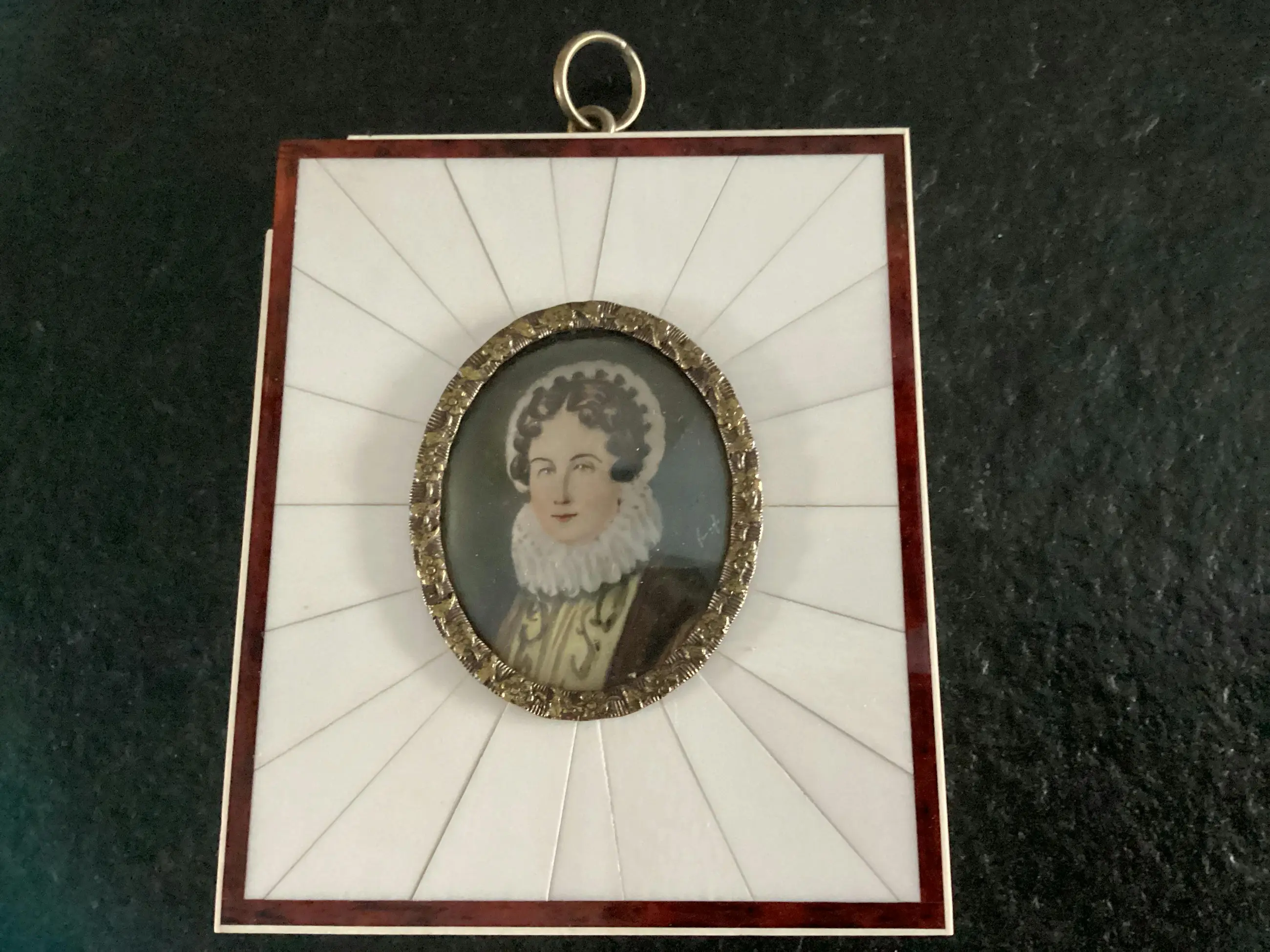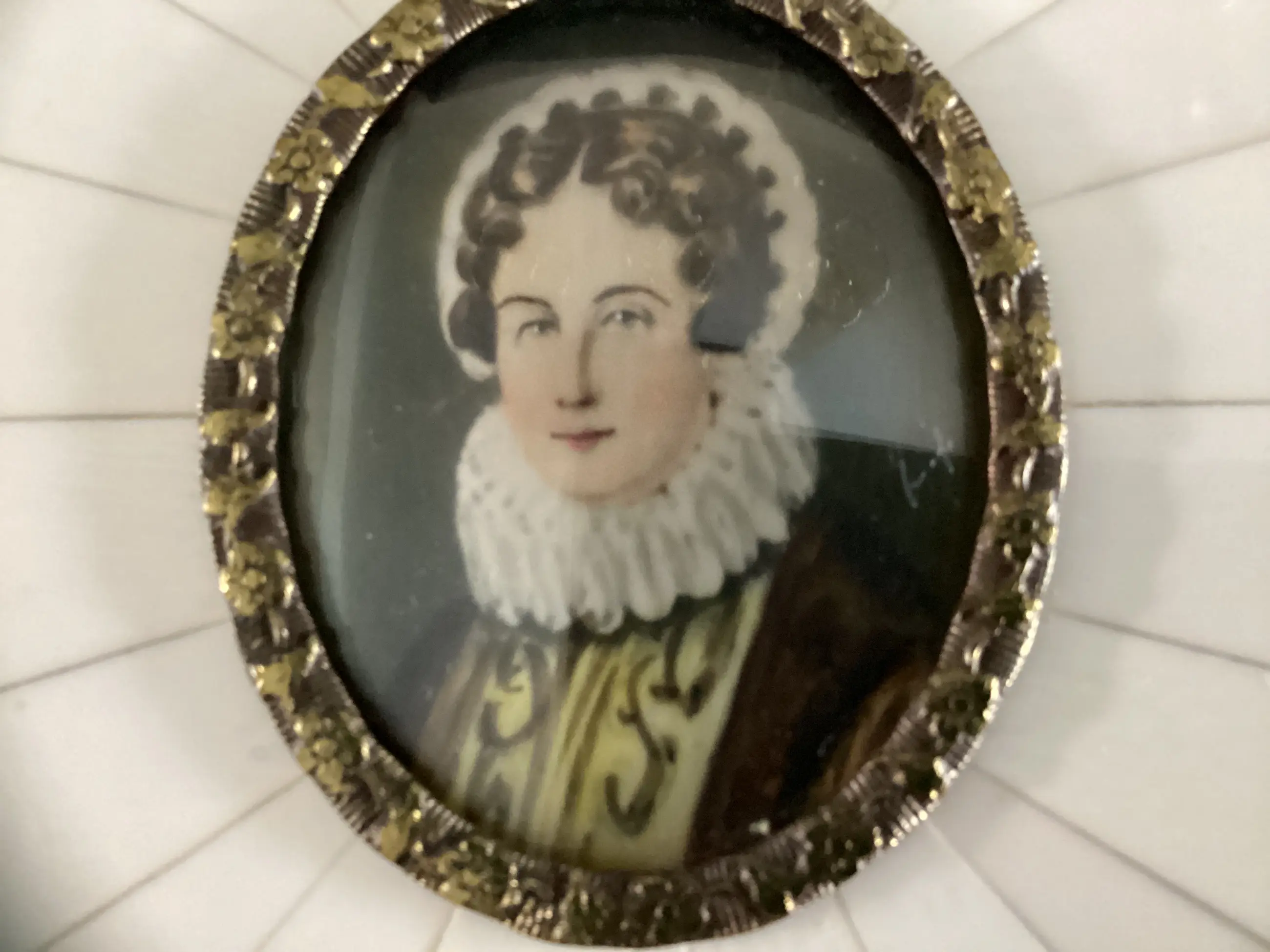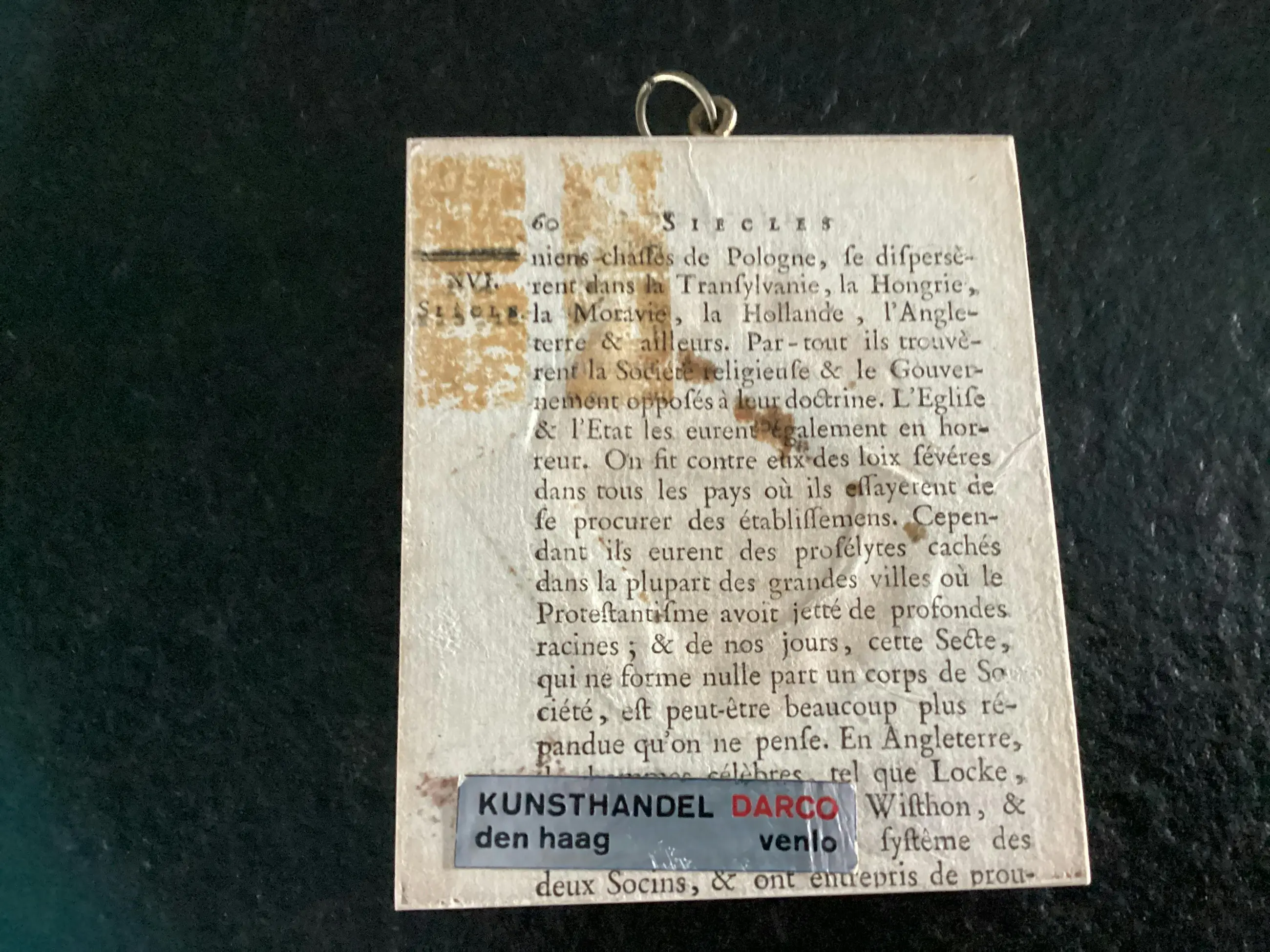 Klein vierkant schilderijtje  met portret van  1  vrouw. Achter op de lijst staat een Frans verhaal.
