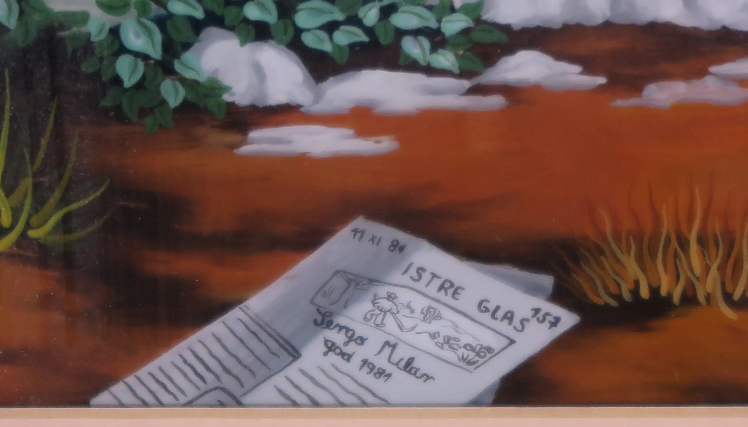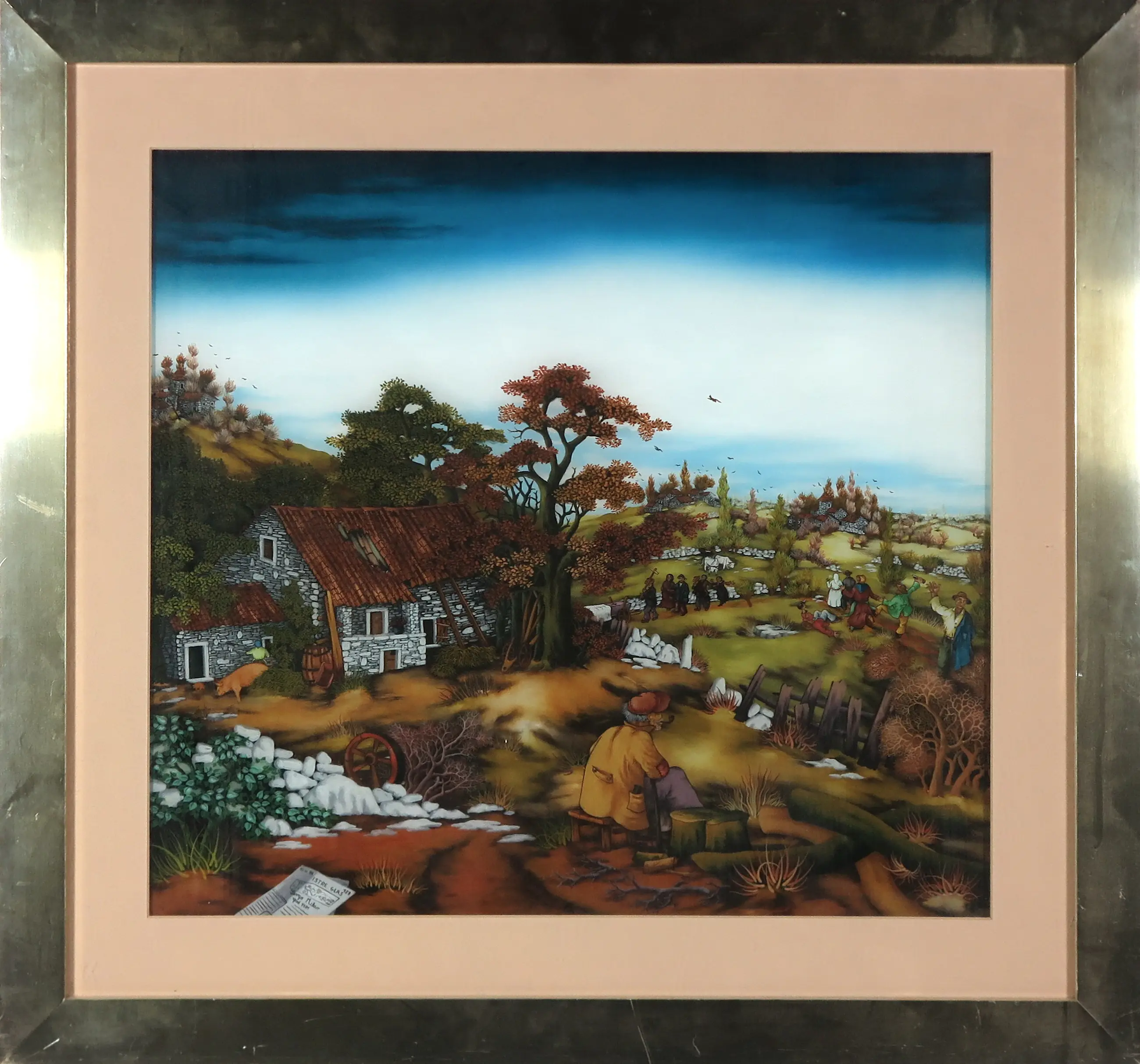 Ingelijst werk geschilderd op glas.