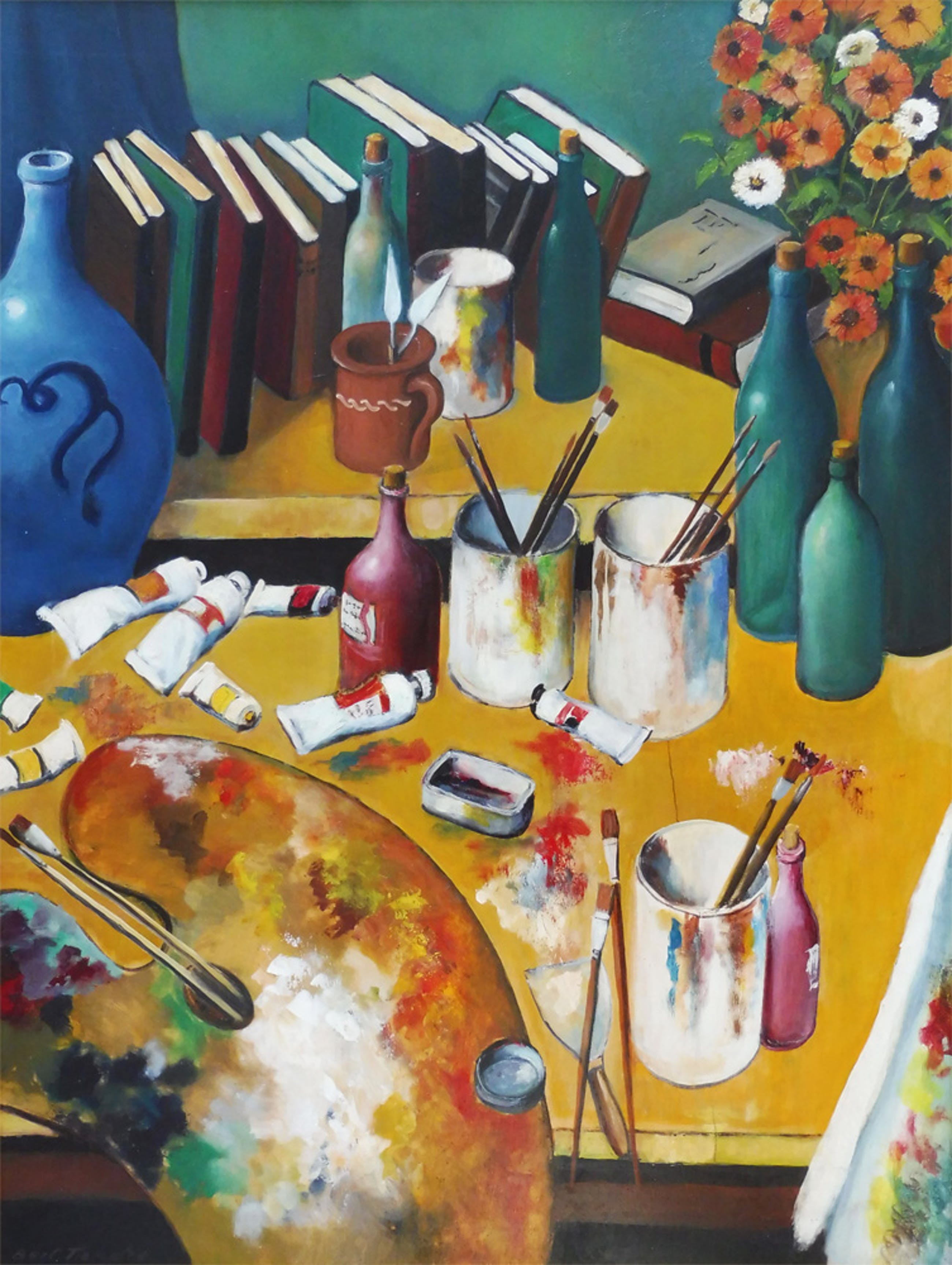 Over het werk: Schilderij in een witte lijst van B. Tiekstra. Het betreft een stilleven van een schildersatelier.