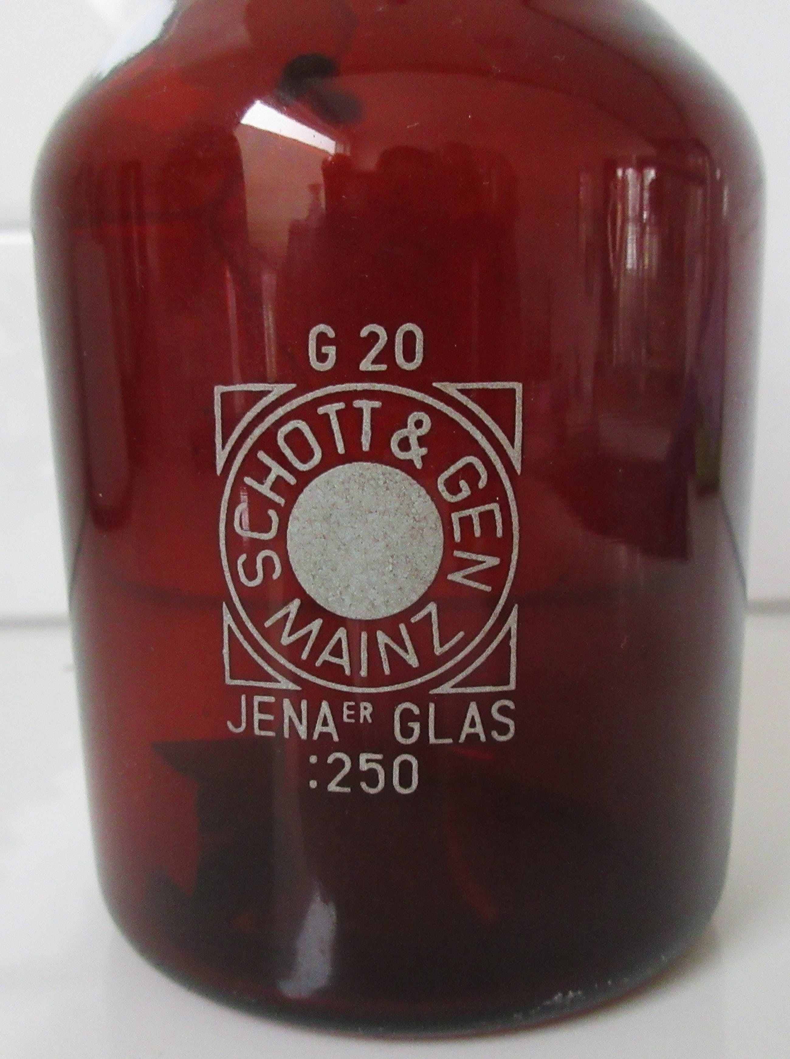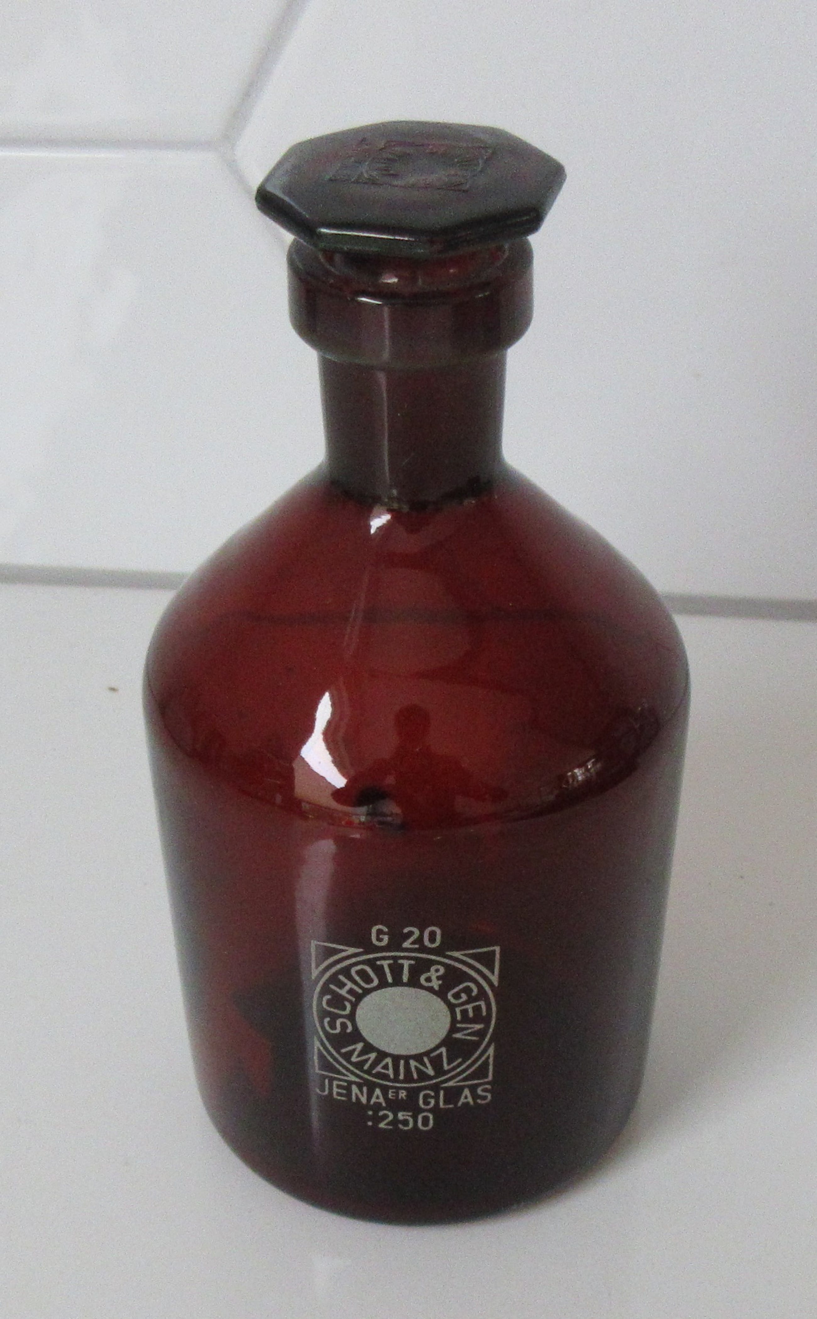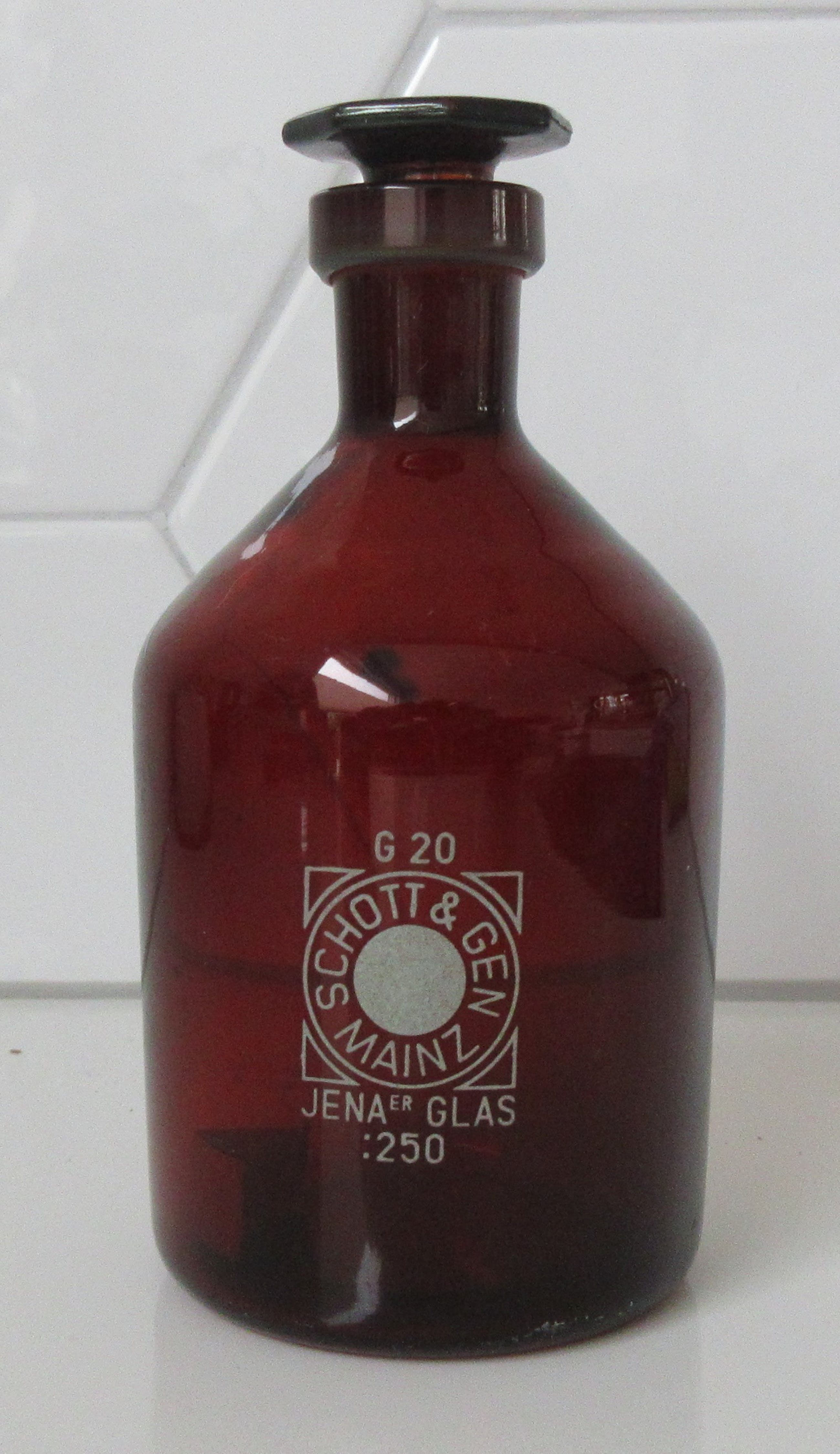 Schott & Gen Jenaer Glas Mainz - Bruine glazen apothekerspot 250. in prima onbeschadigde conditie incluis de stopper. Op de stopper voorzien van ingedrukt merk en op de voorzijde soort van etiket.