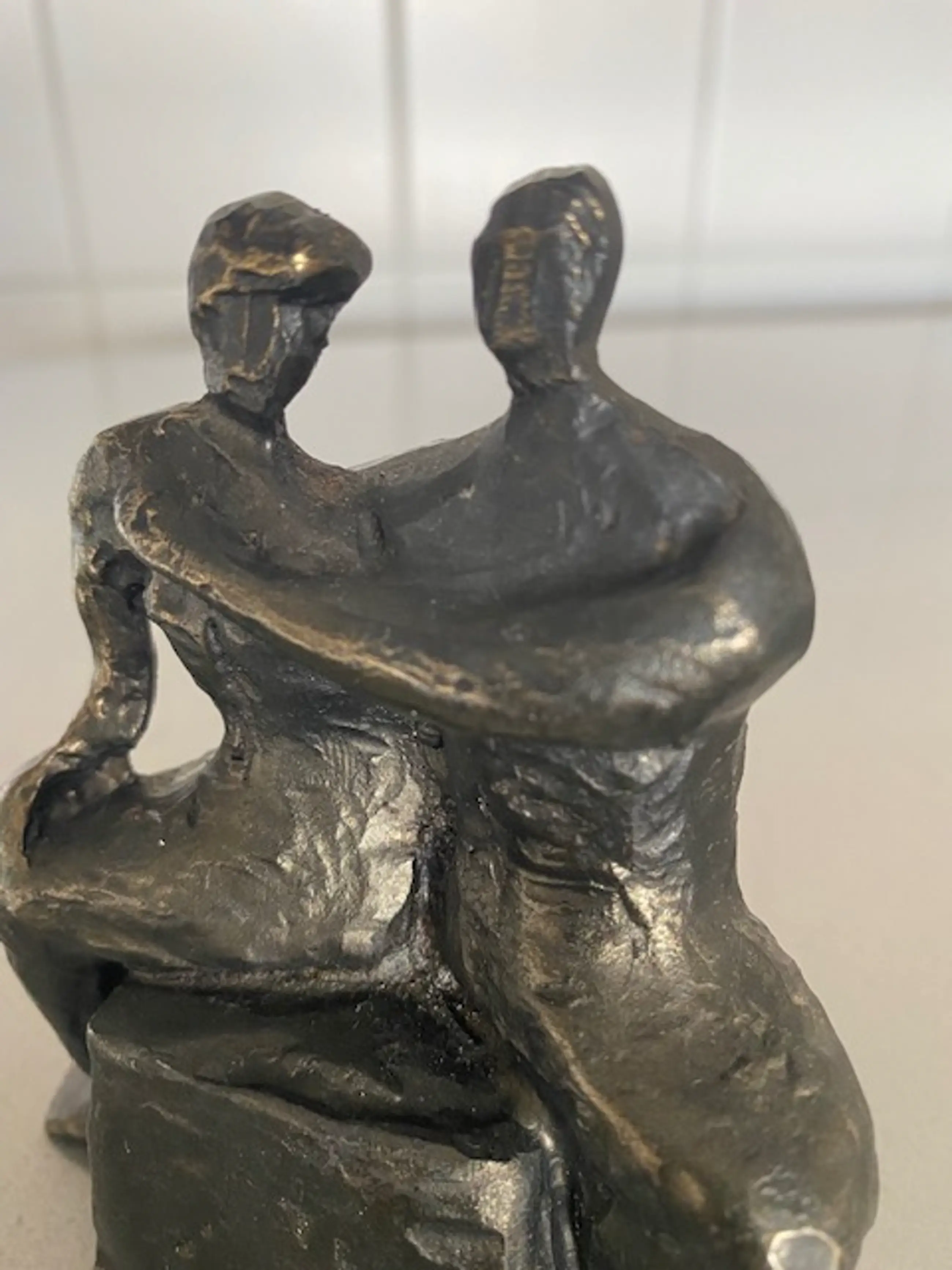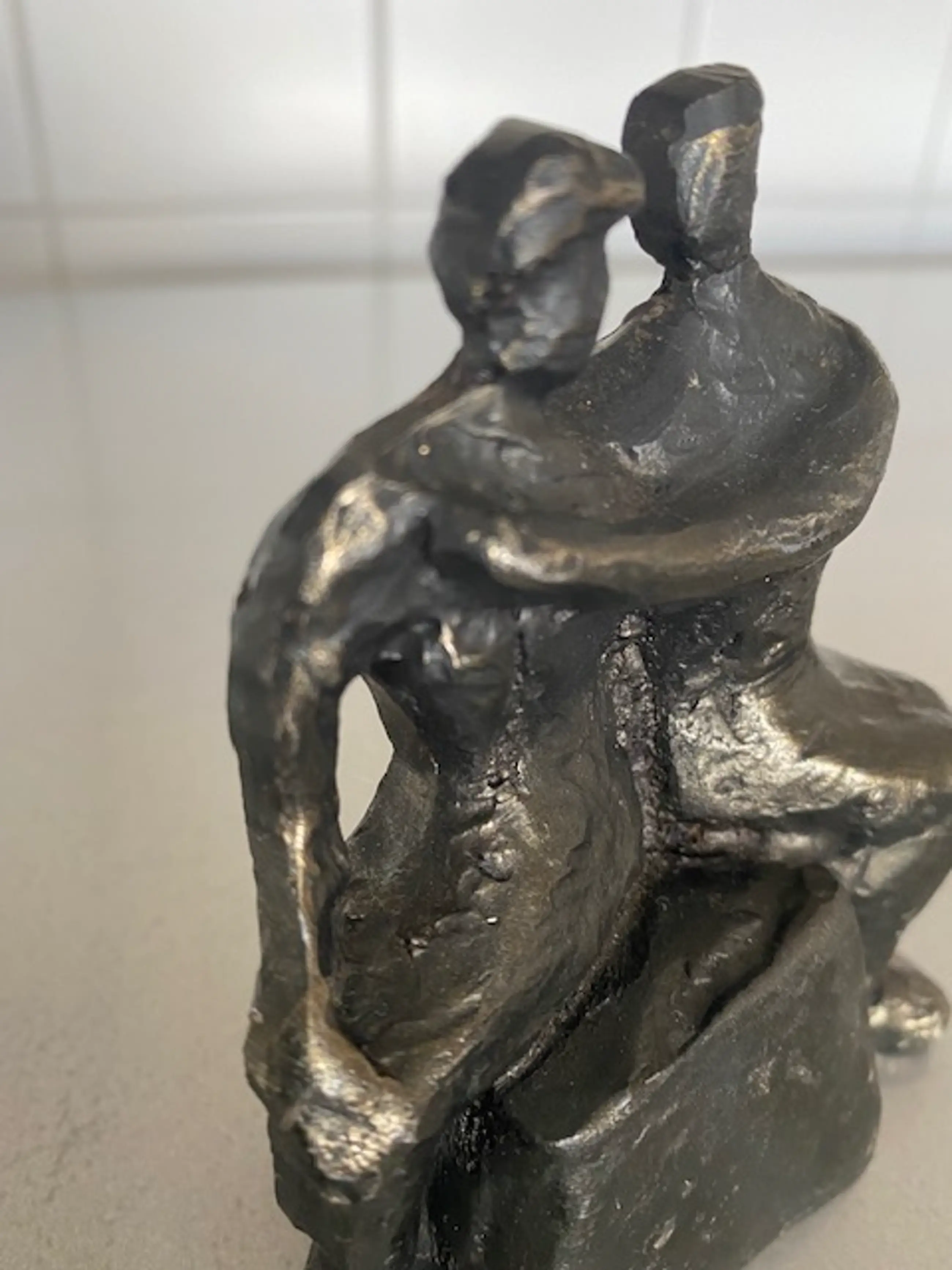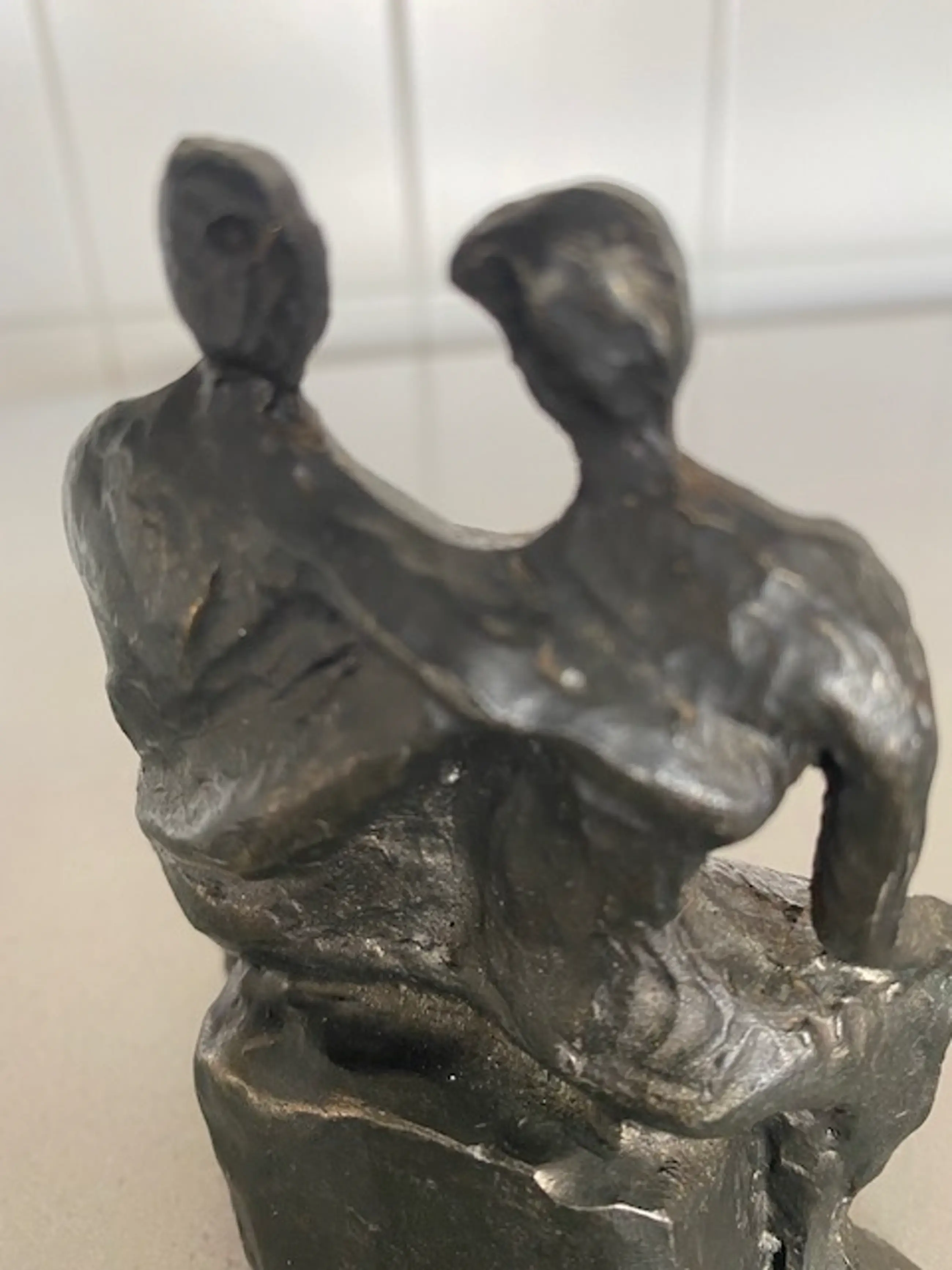 Het bronzen (legering) beeldje vertoont de gebruikelijke sporen van geringe ouderdom. De sokkel is geïntegreerd in het beeld