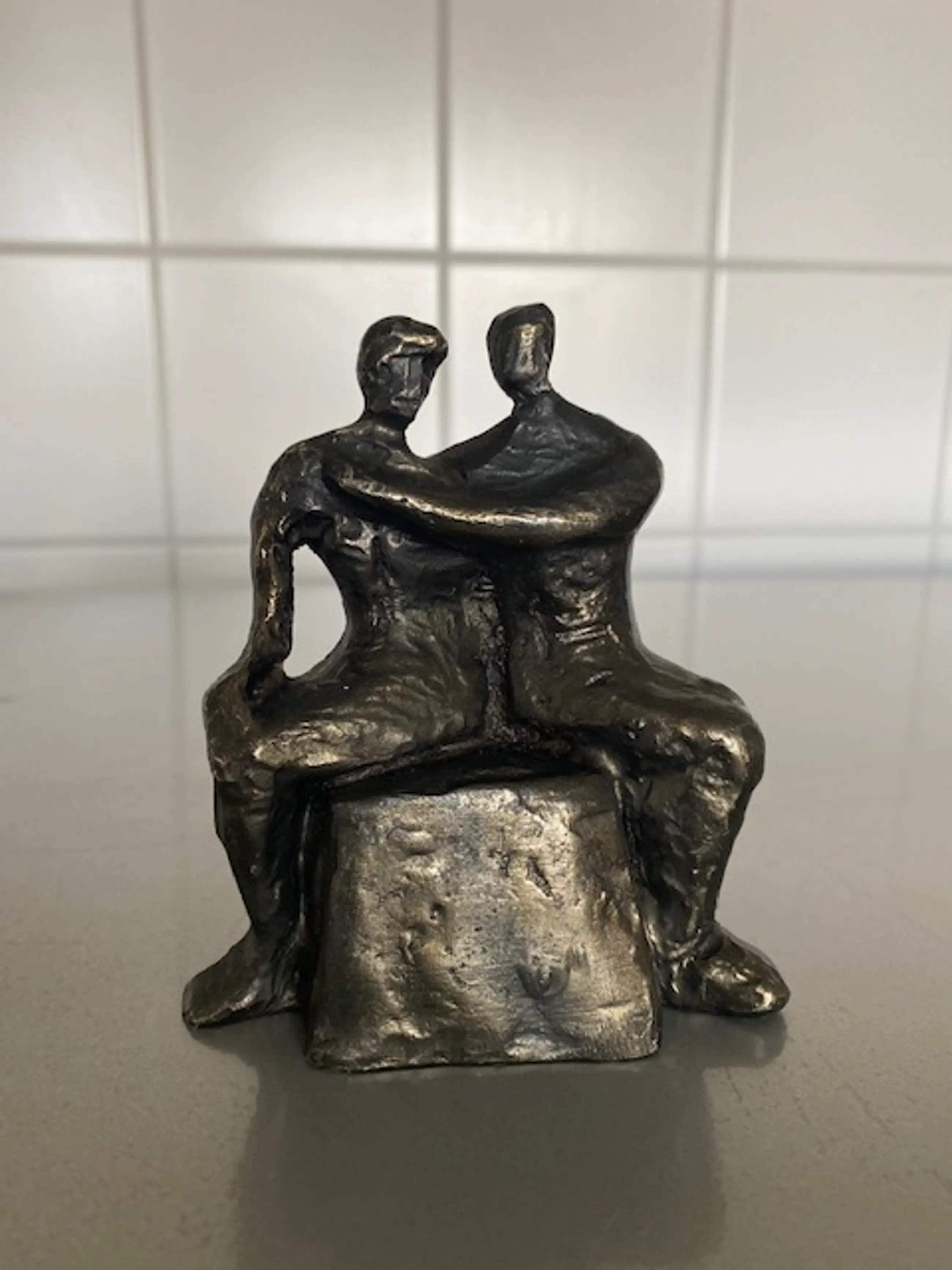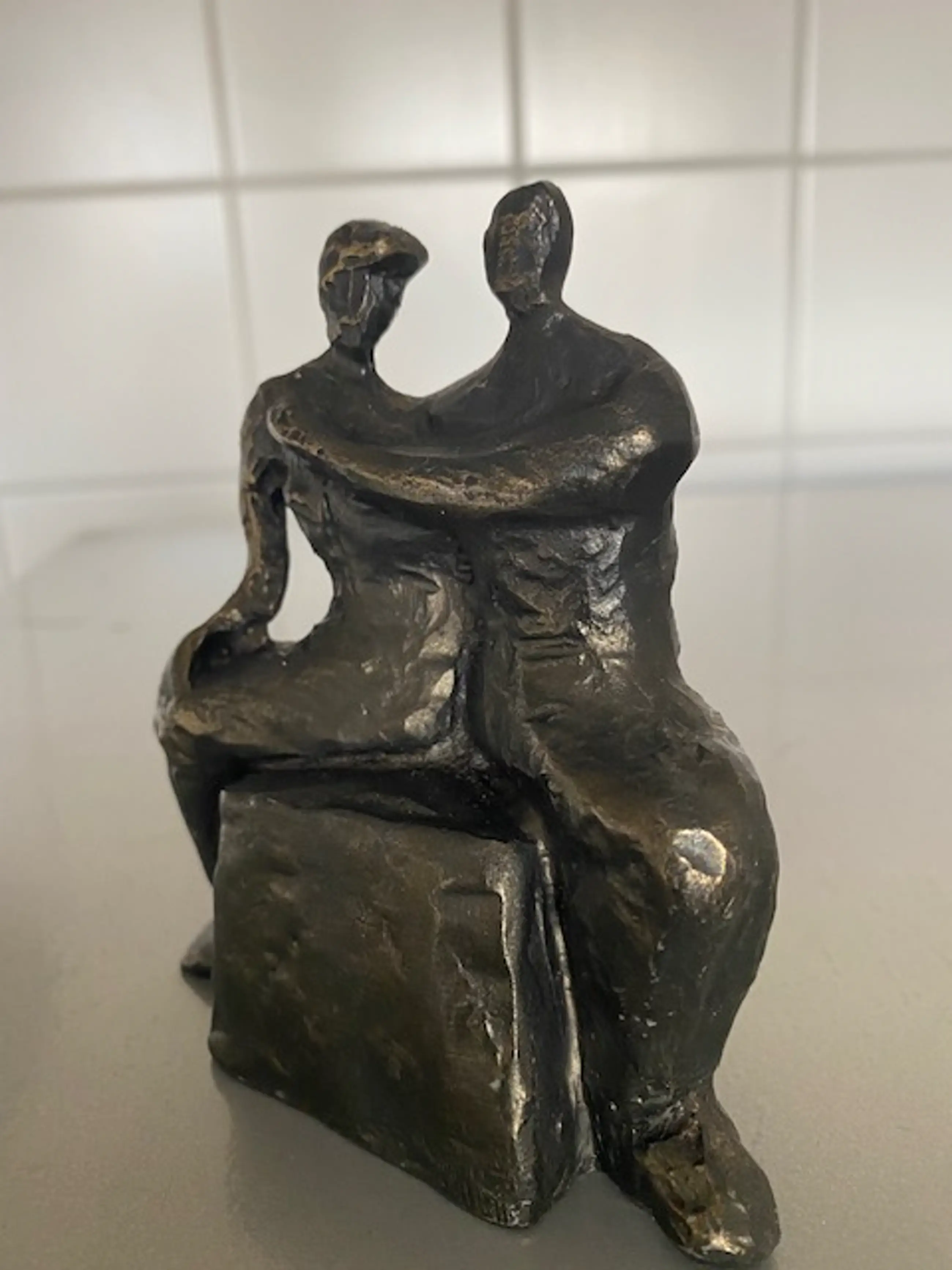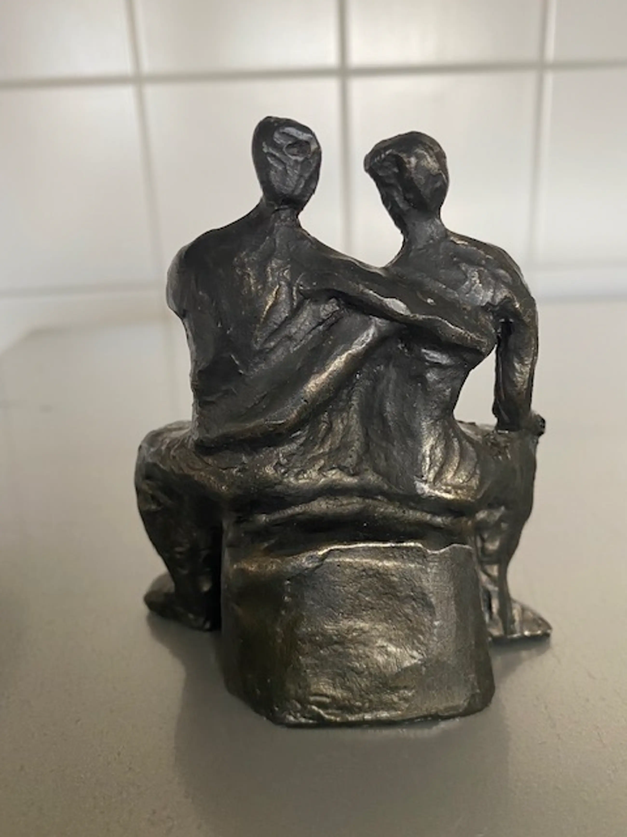 Het bronzen (legering) beeldje vertoont de gebruikelijke sporen van geringe ouderdom. De sokkel is geïntegreerd in het beeld