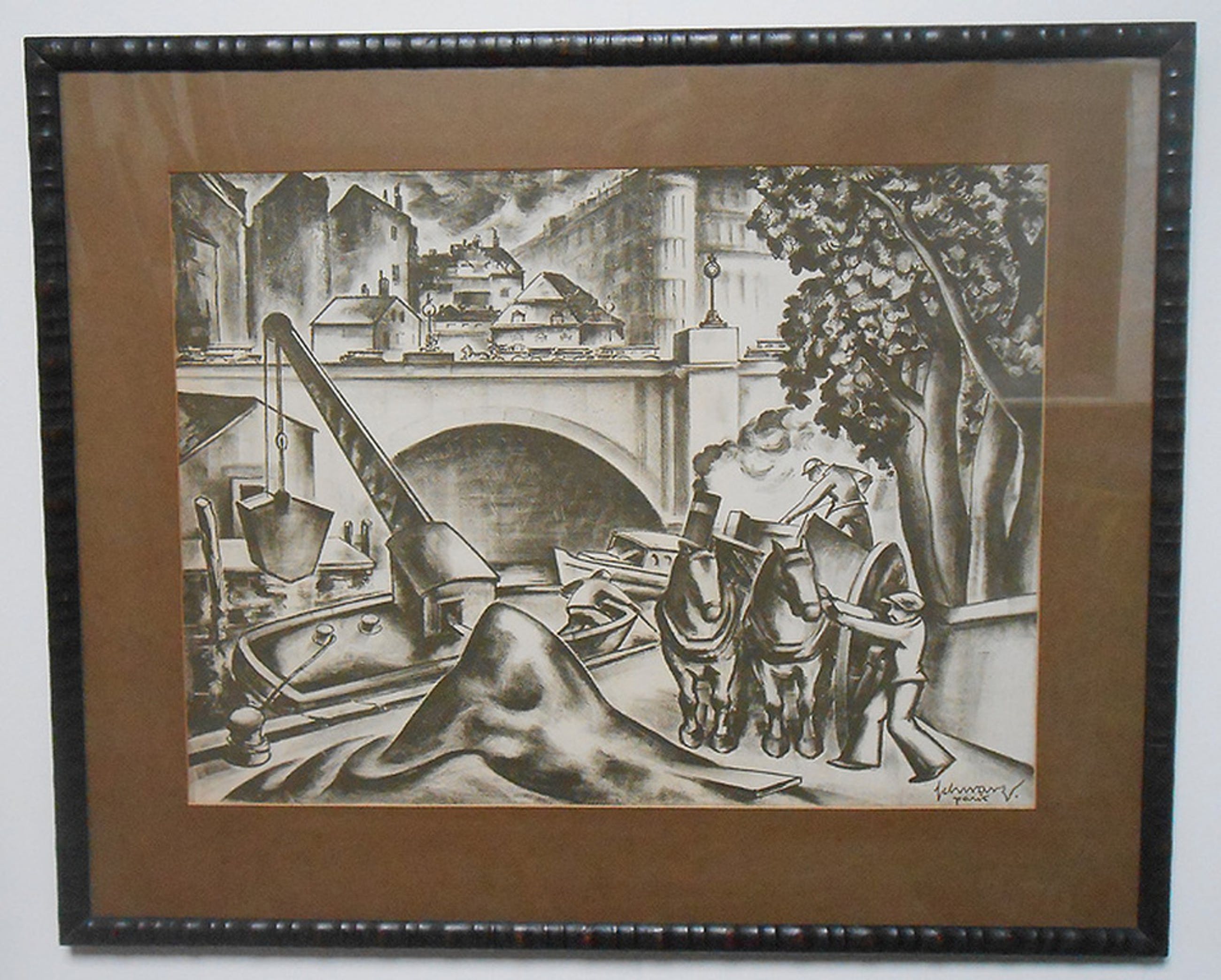 Lithografische reproduktie van houtskooltekening in fraaie houten lijst.