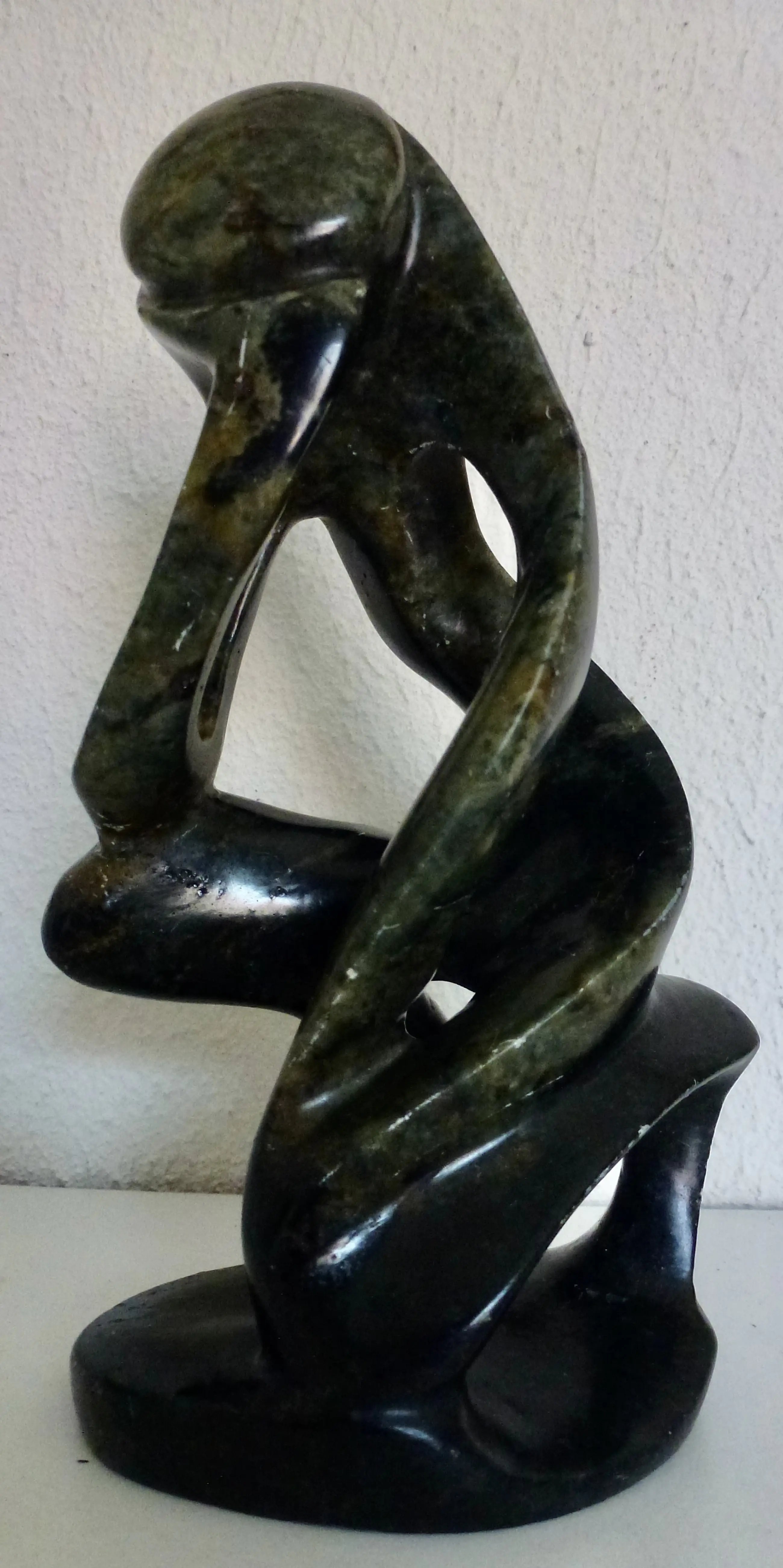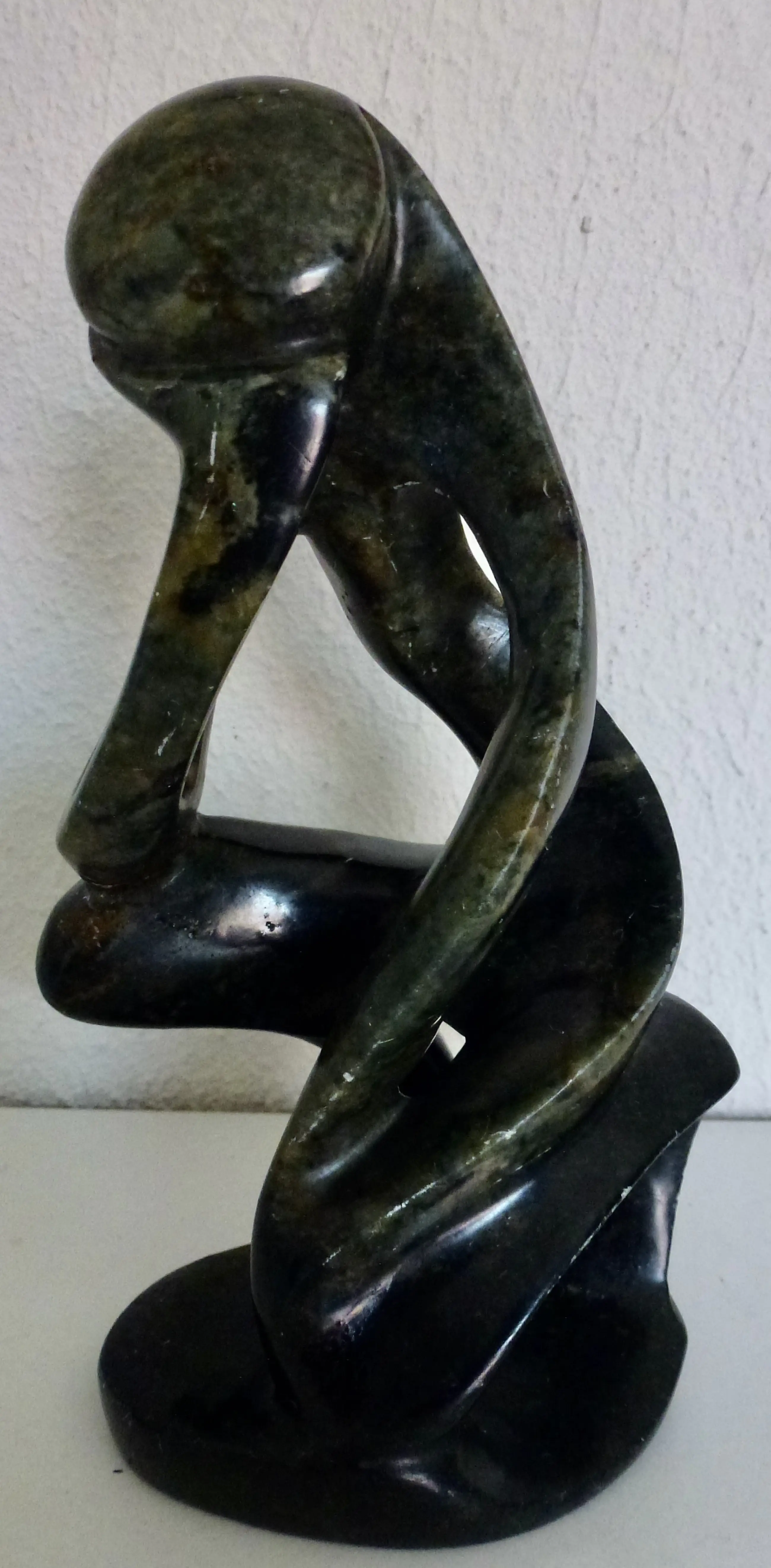 Mooie sculptuur van de zittende Denker van Rodin. Deze is gemaakt van (spek)steen, zie onderkant beeld en geglazuurd. De kleuren die dit beeld heeft zijn prachtig; lichtgroen, donkergroen, bruin en zwart. Het beeld is met zorg uit natuursteen gemaakt en dus handgemaakt (wel heel kwetsbaar).