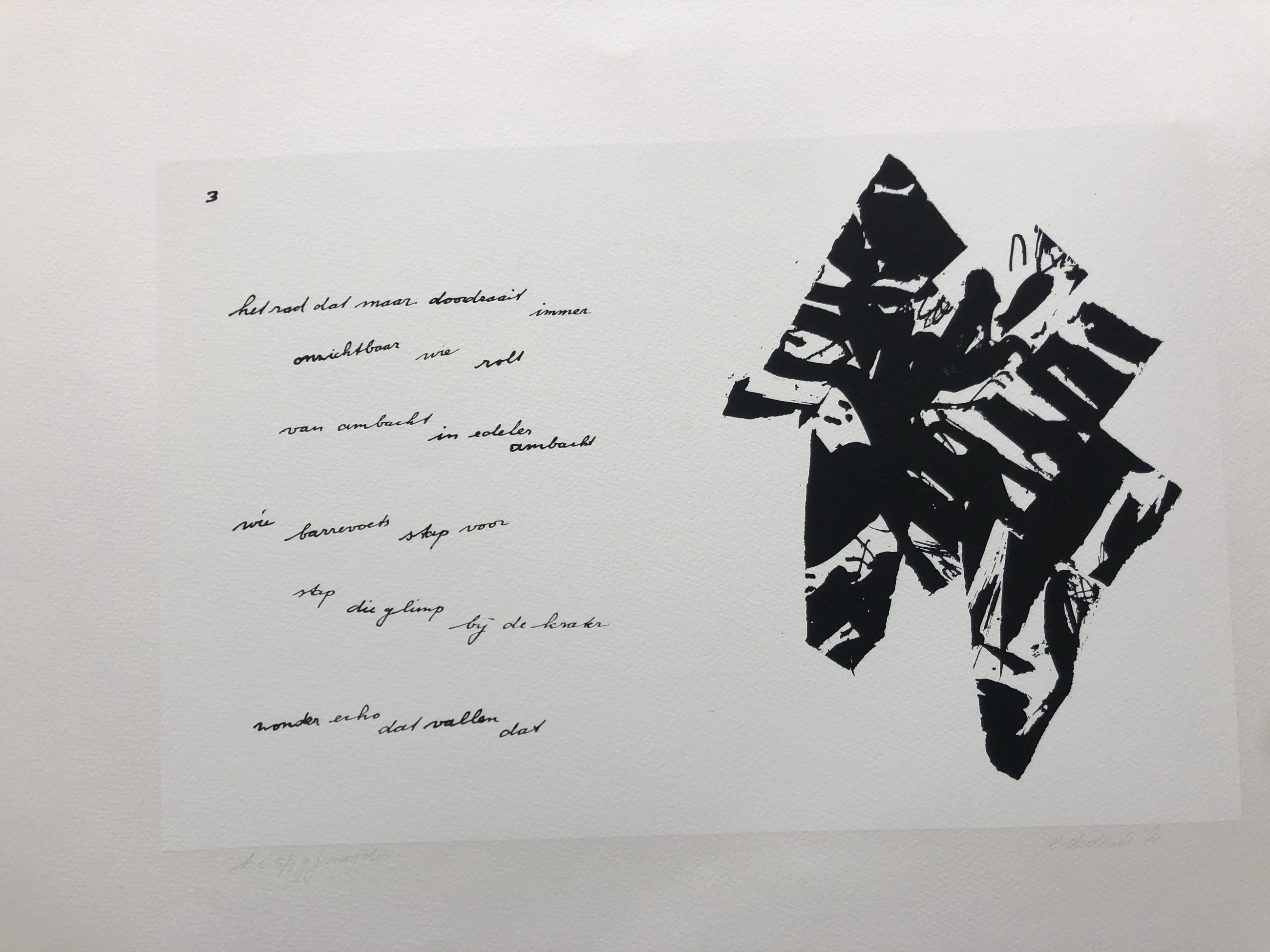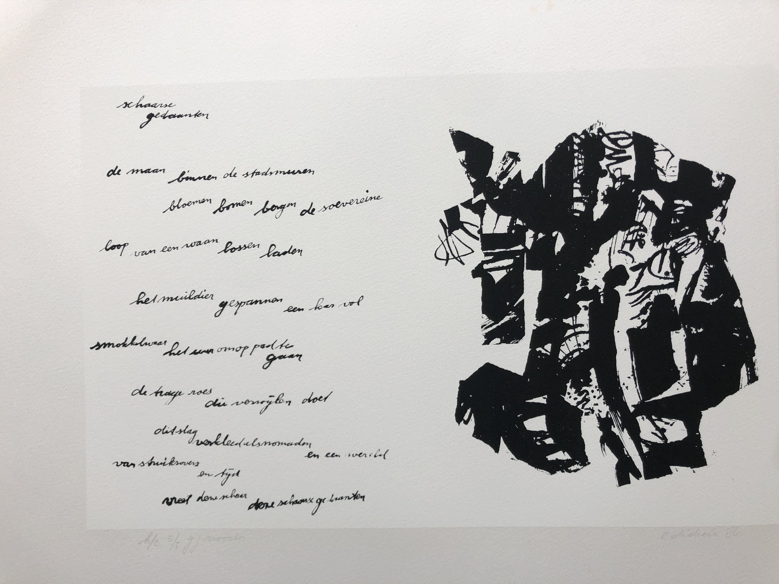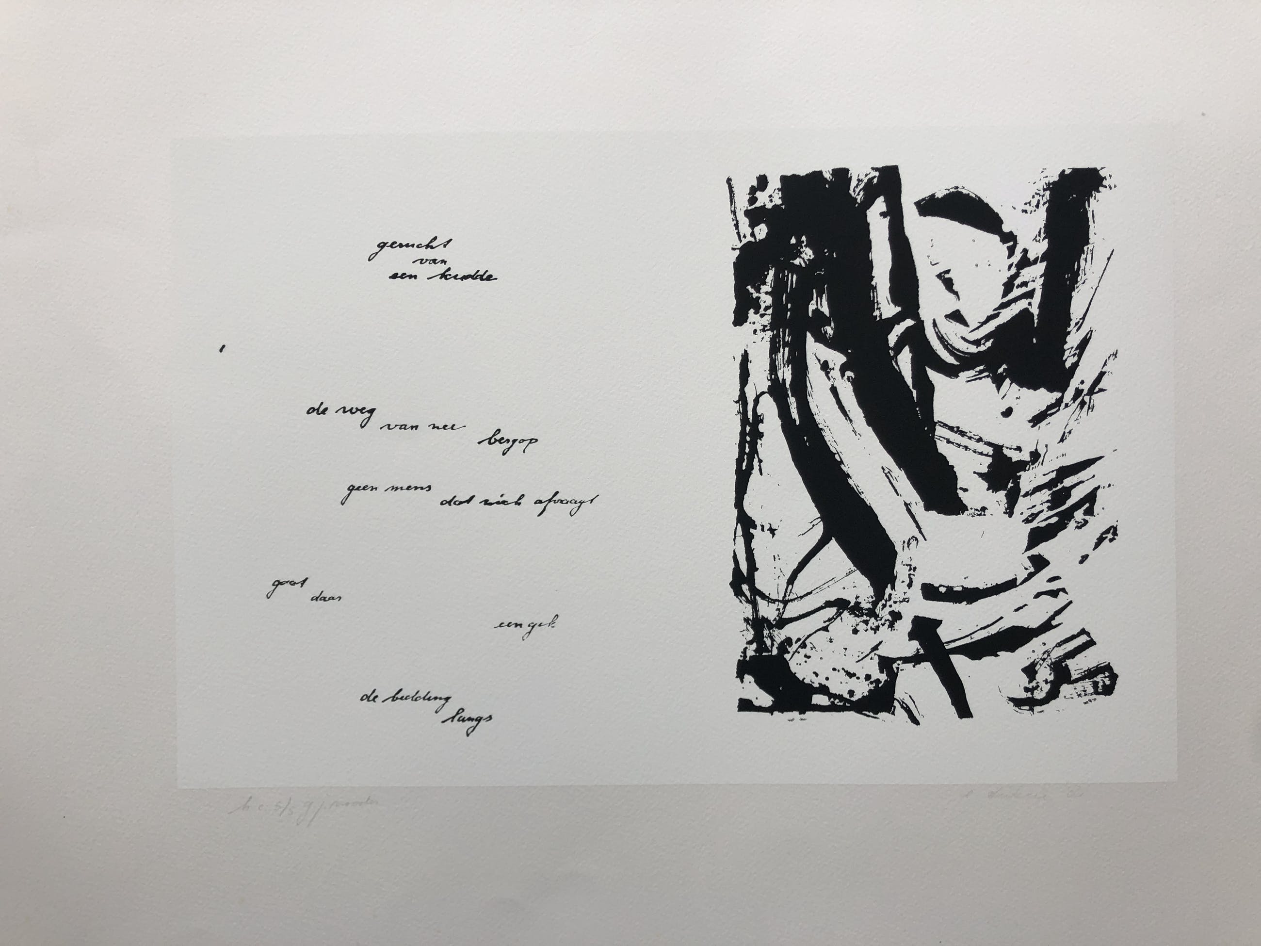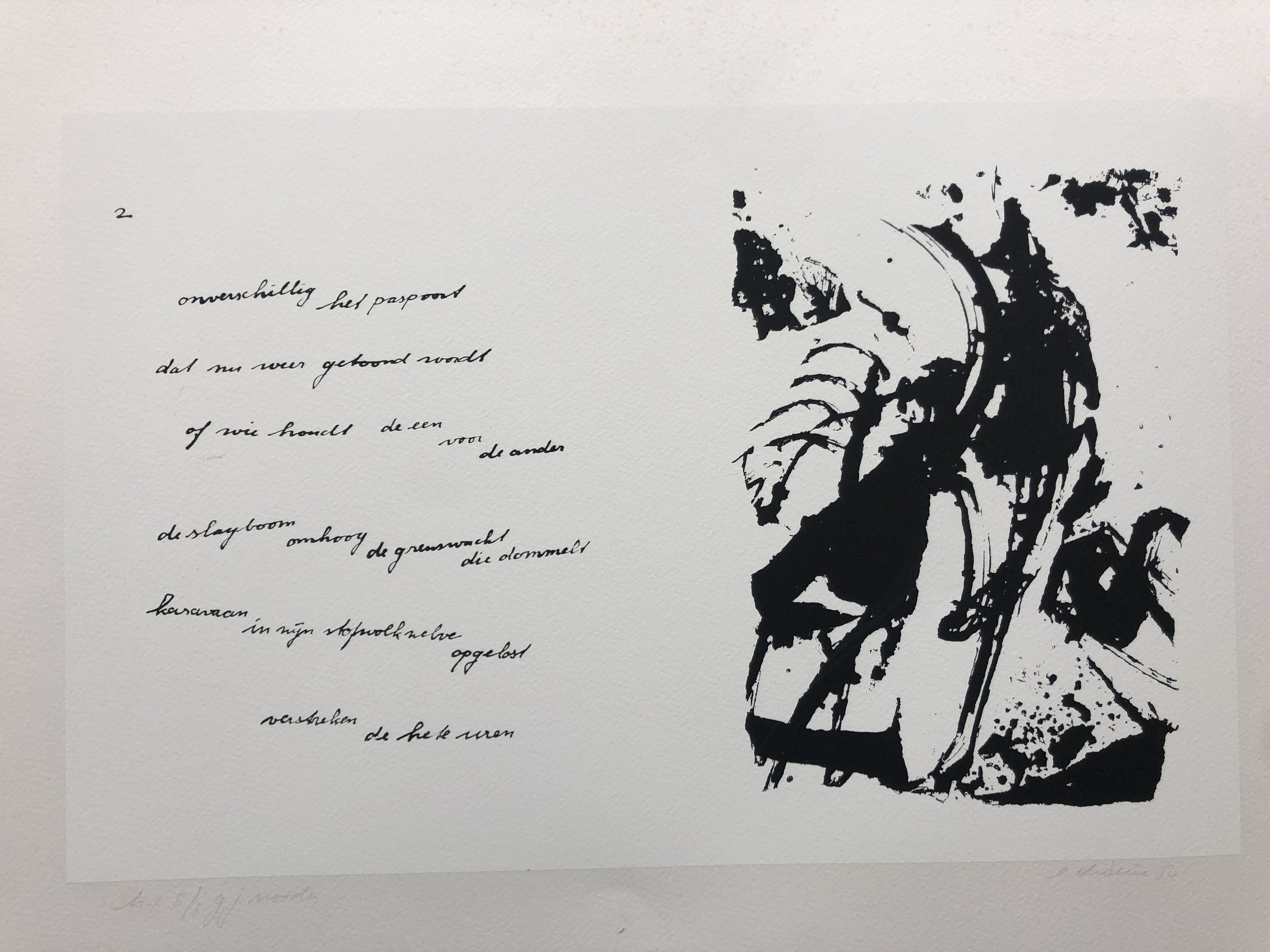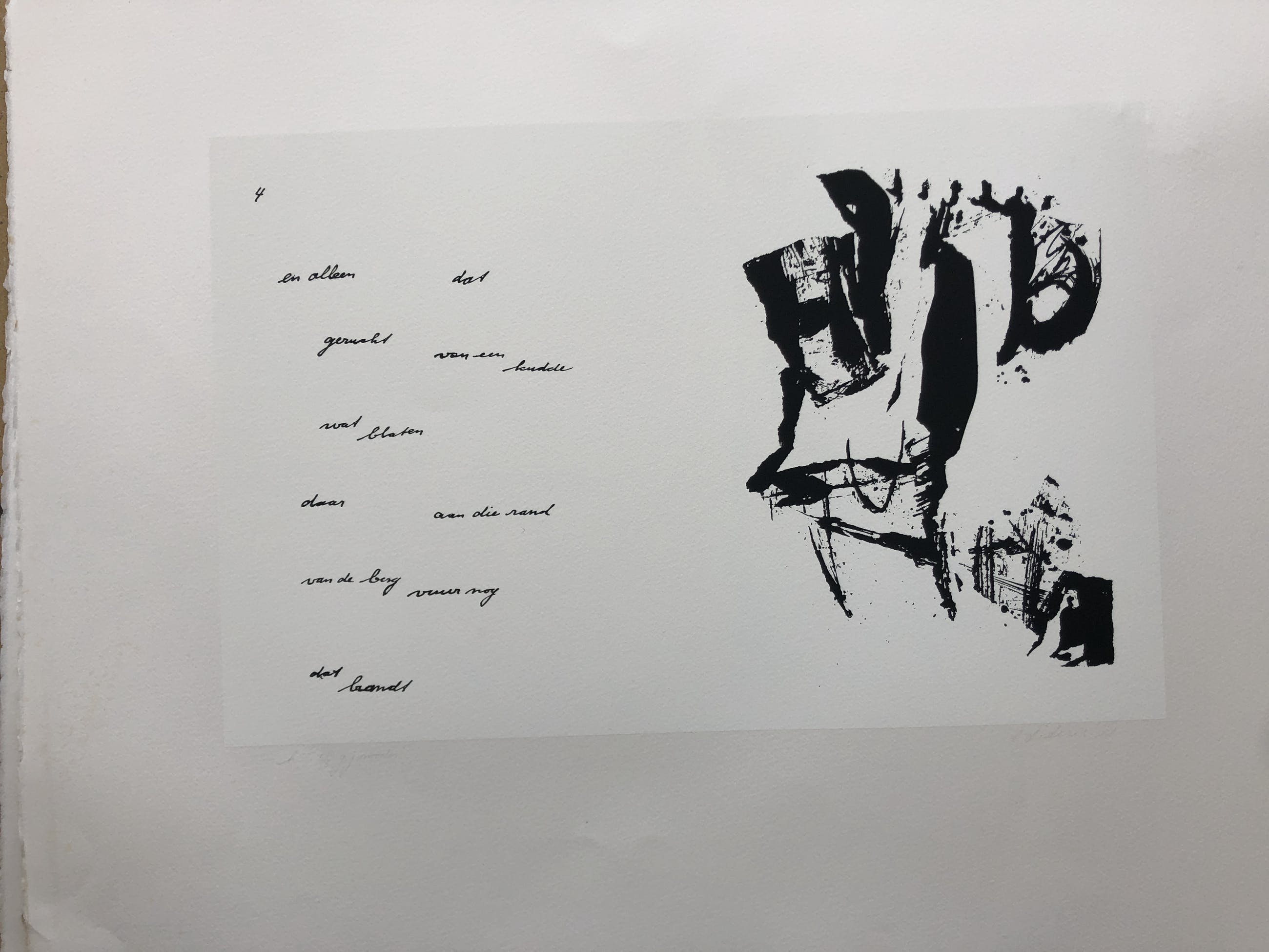 Mooie serie van zes zeefdrukken waarin poezie en beeldende kunst samen komen. De zes verschillende bladen kennensteeds links een gedicht en rechts een kunstwerk. De werken zijn dubbel gesigneerd door dichter en kunstenaar maar niet goed leesbaar. Bedrukte prent is zeer goed, in sommige bladen zijn in de witrand spatjes te zien. Valt bij gebruik van passe partout buiten beeld.