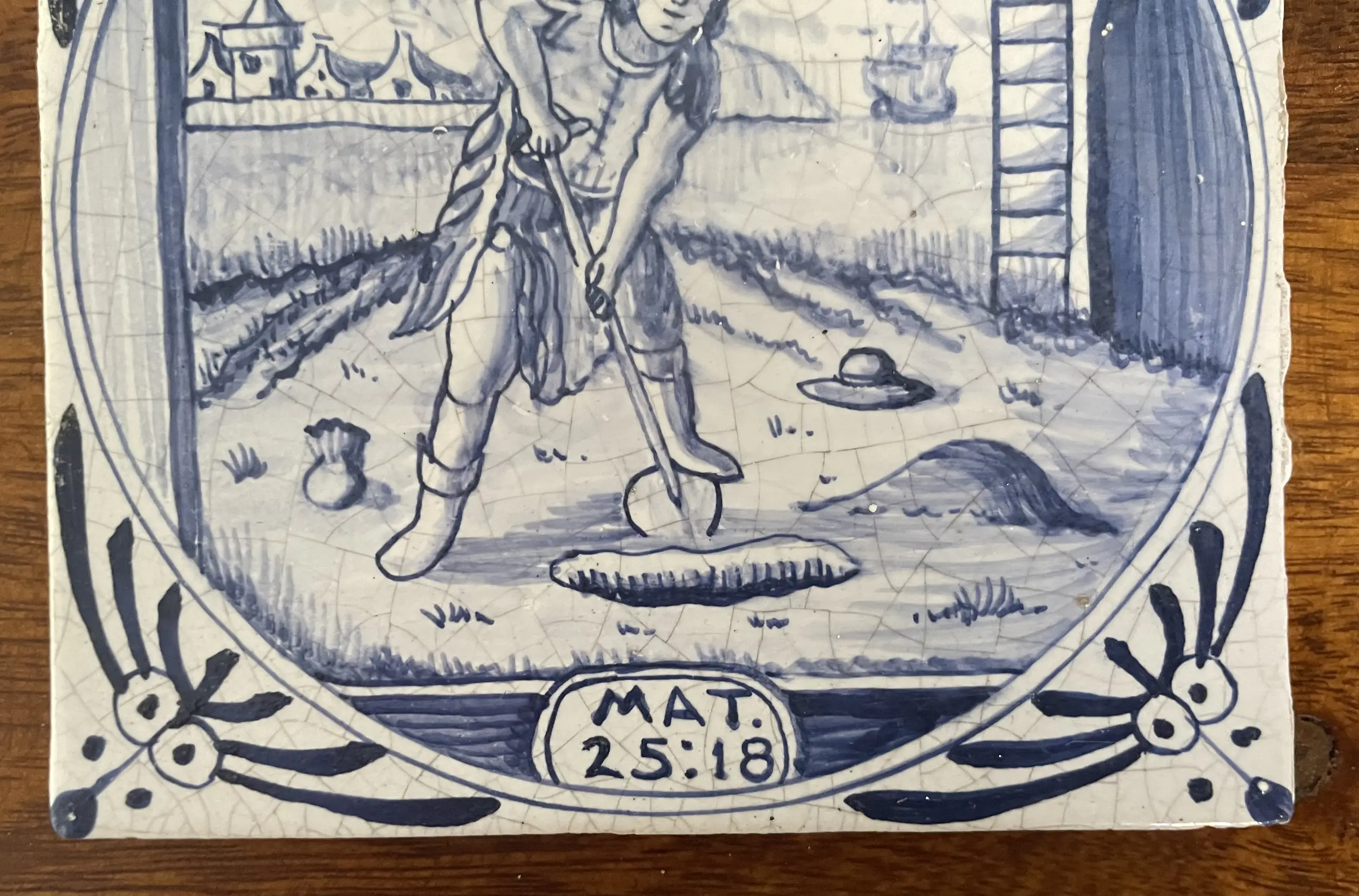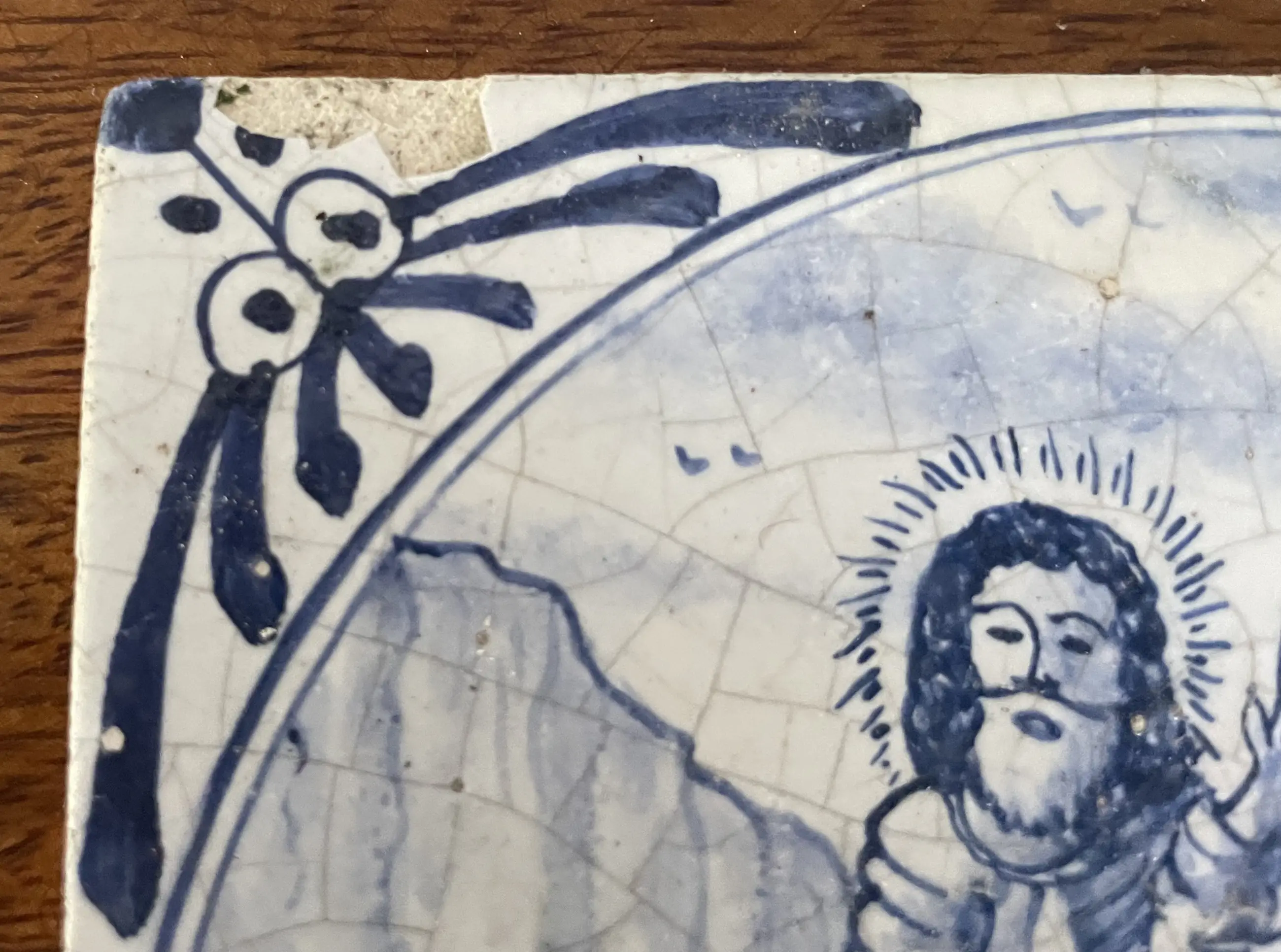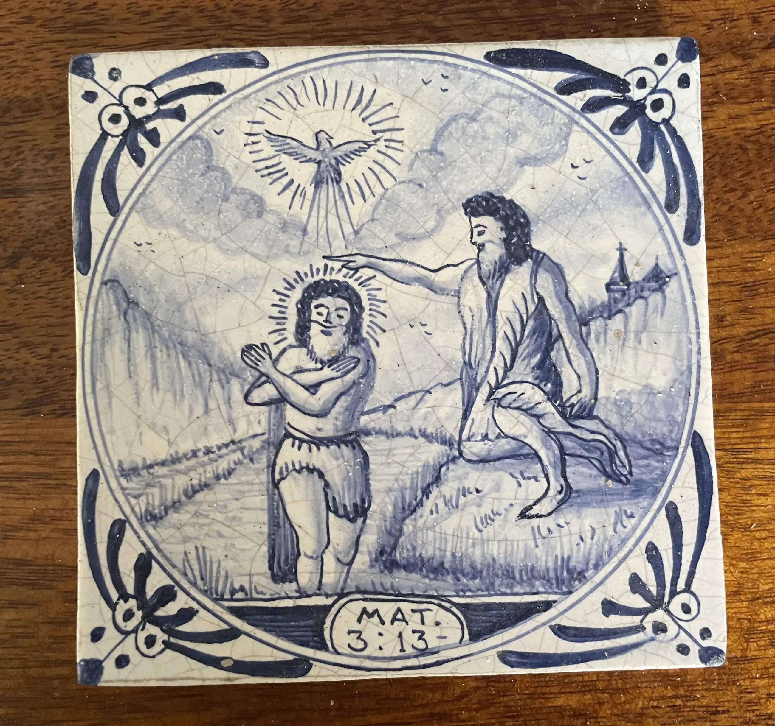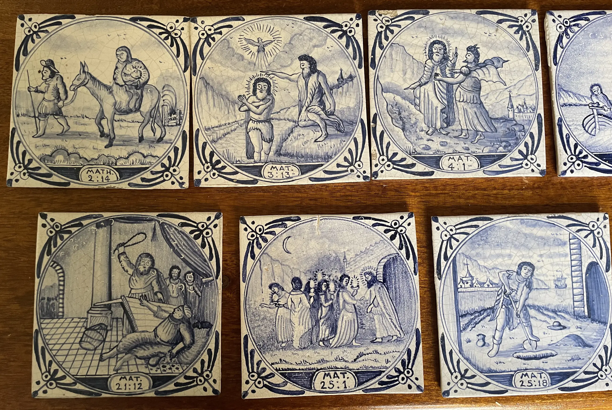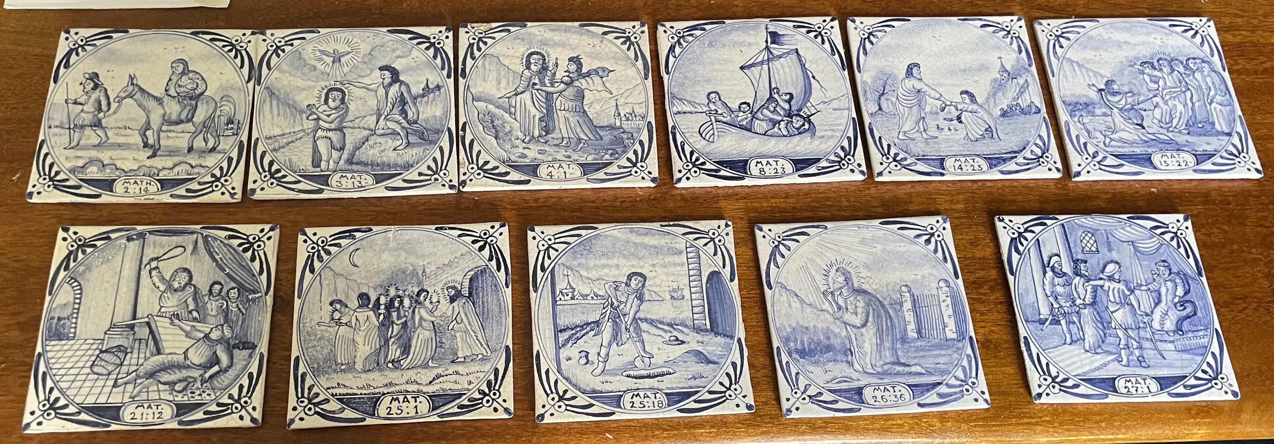 Set van 11 blauw witte handbeschilderde wandtegels met Bijbelse voorstelling uit het boek Mattheus. De tegels zijn afkomstig uit een voormalig kerkgebouw (kerkje) van het eiland Wieringerwerf. In goede conditie, sommige hebben een klein chipje.